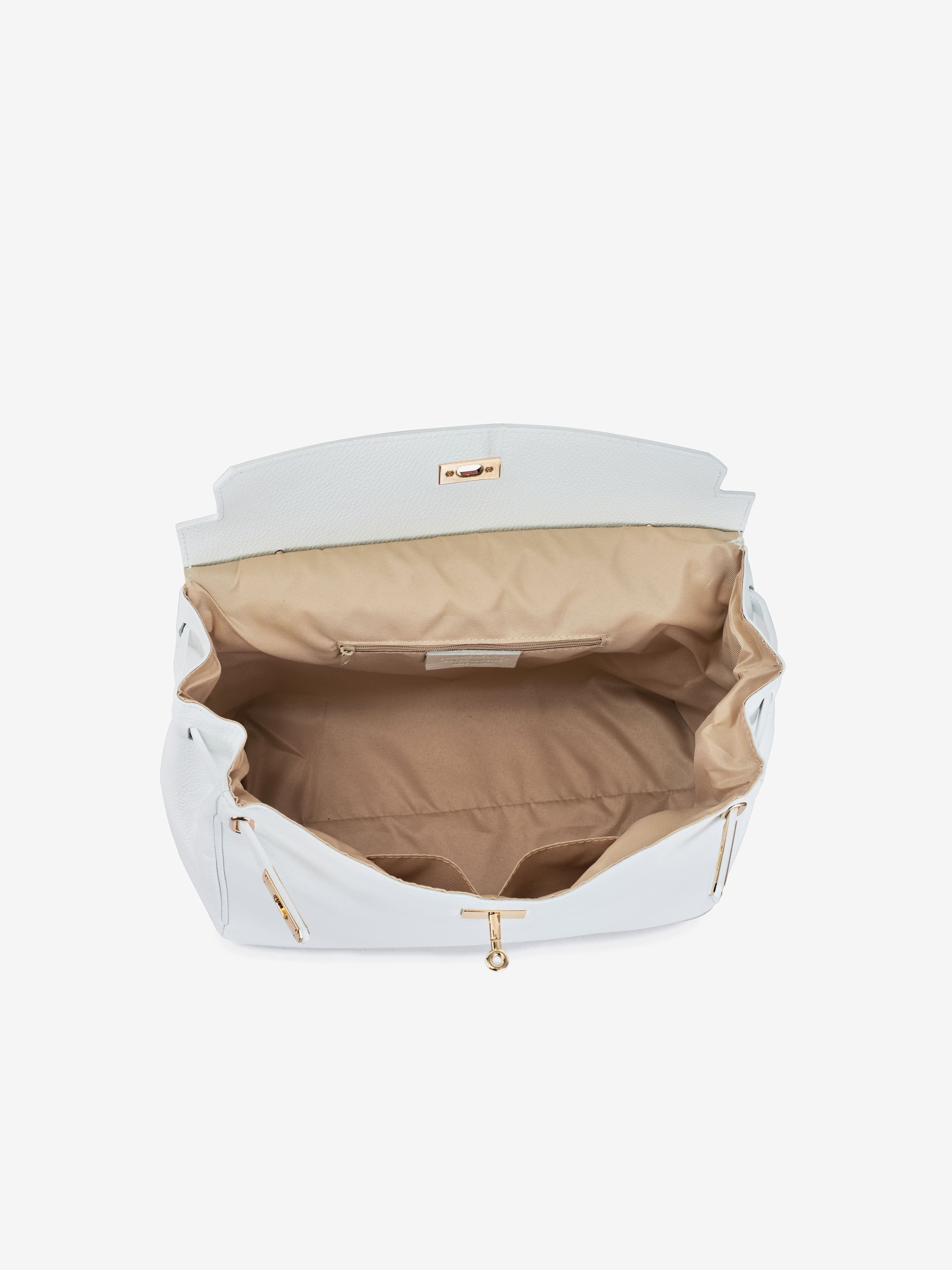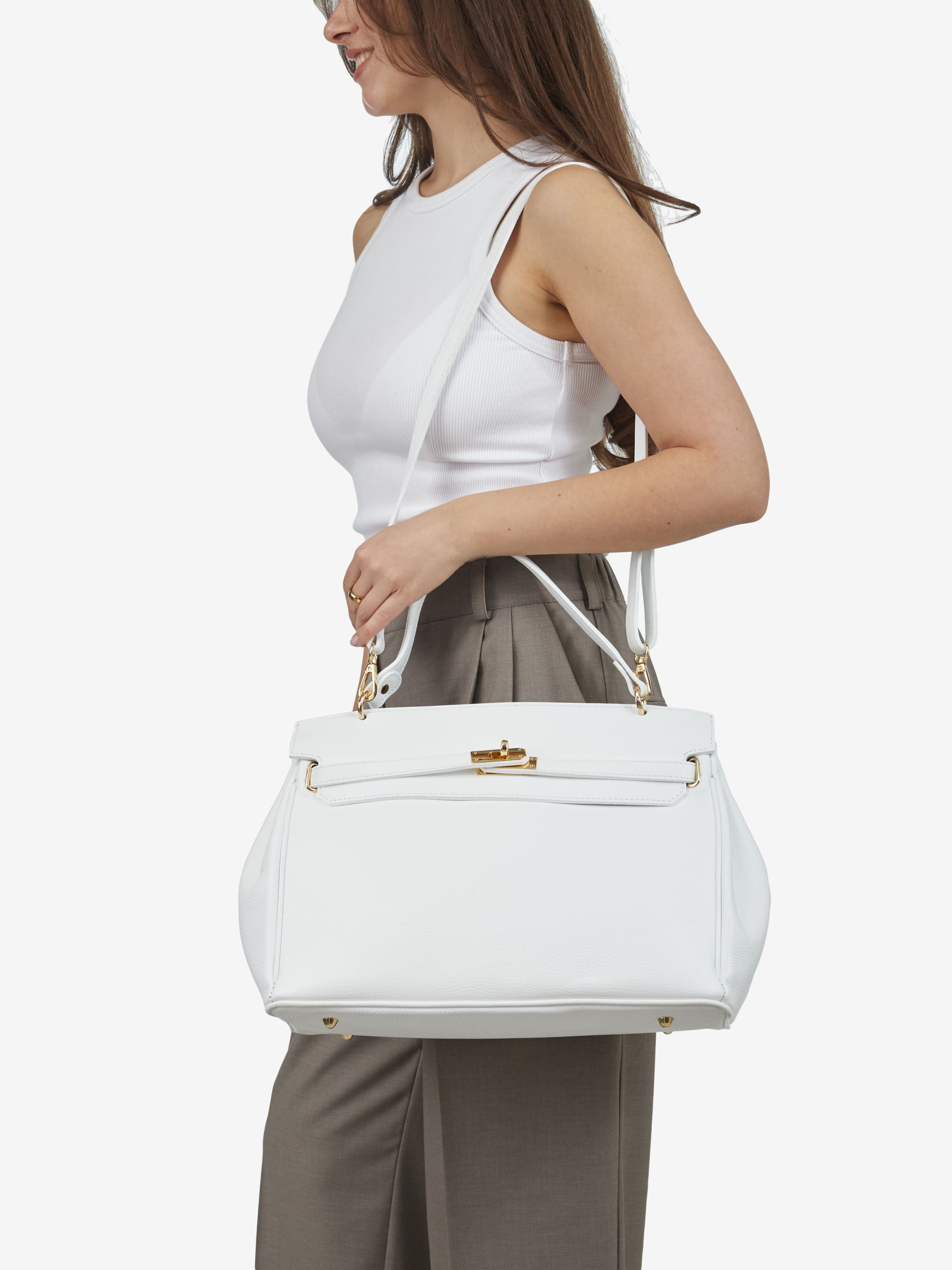 Детали: Материал: 100% натуральная кожа флотар Фурнитура золотистого цвета Размеры (Ш x В x Г) - 35 x 24 x 18 см Внутри 1 отделение и 3 карманчика, один из них на молнии Подкладка: хлопок Застежка: клапан на поворотном замке Ремешок кожаный, съемный, регулируется, максимальная длина 100 см Высота ручек 14 см