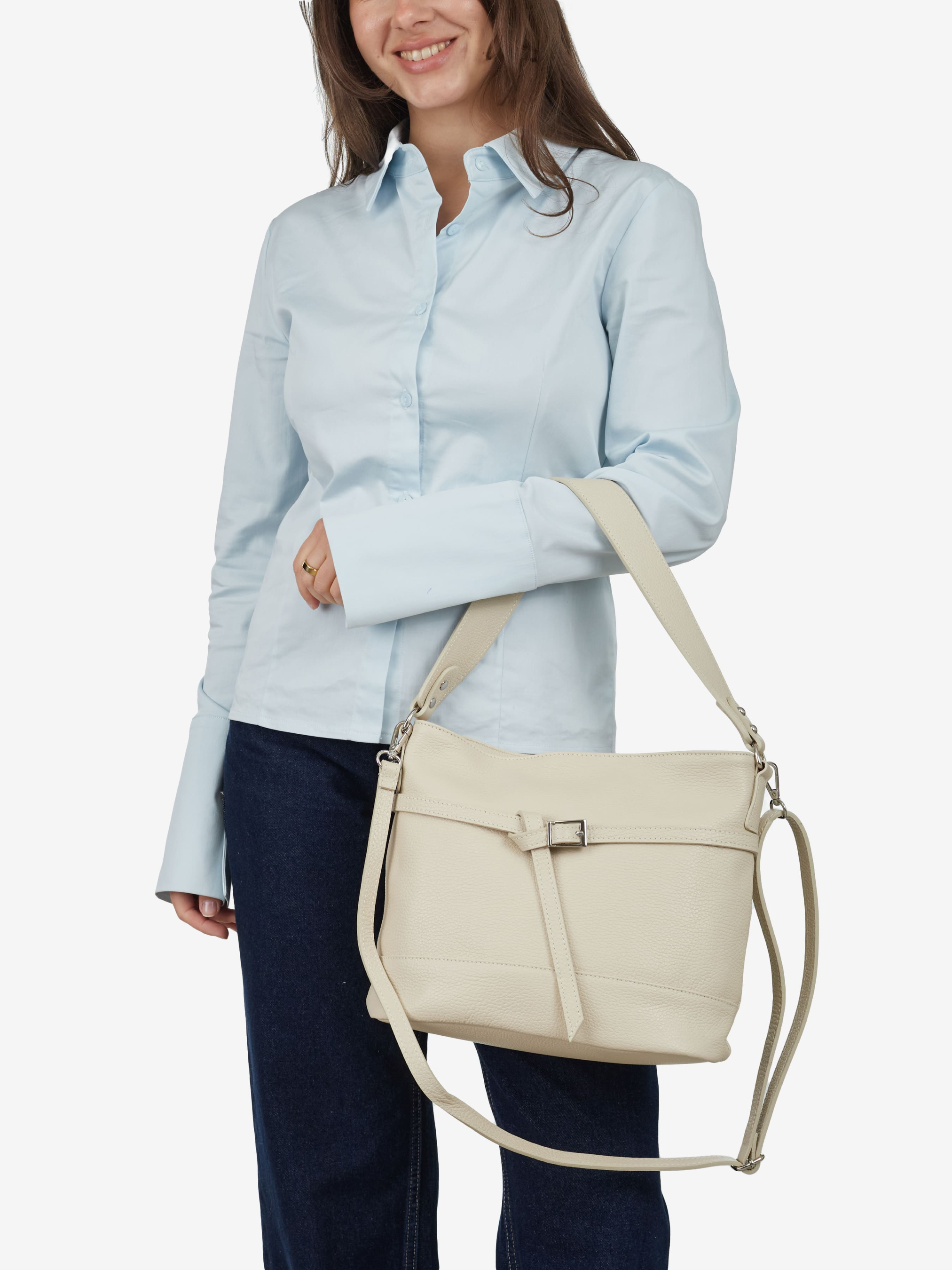 Детали: Материал: 100% натуральная кожа флотар Фурнитура серебристого цвета Размеры (Ш x В x Г) - 30 x 25 x 13 см Внутри 1 отделения 3 карманчика один на молнии, сзади карманчик на молнии Подкладка: хлопок Застежка: молния Высота ручки 23 см Ремешок кожаный, съемный, регулируется, максимальная длина 110 см