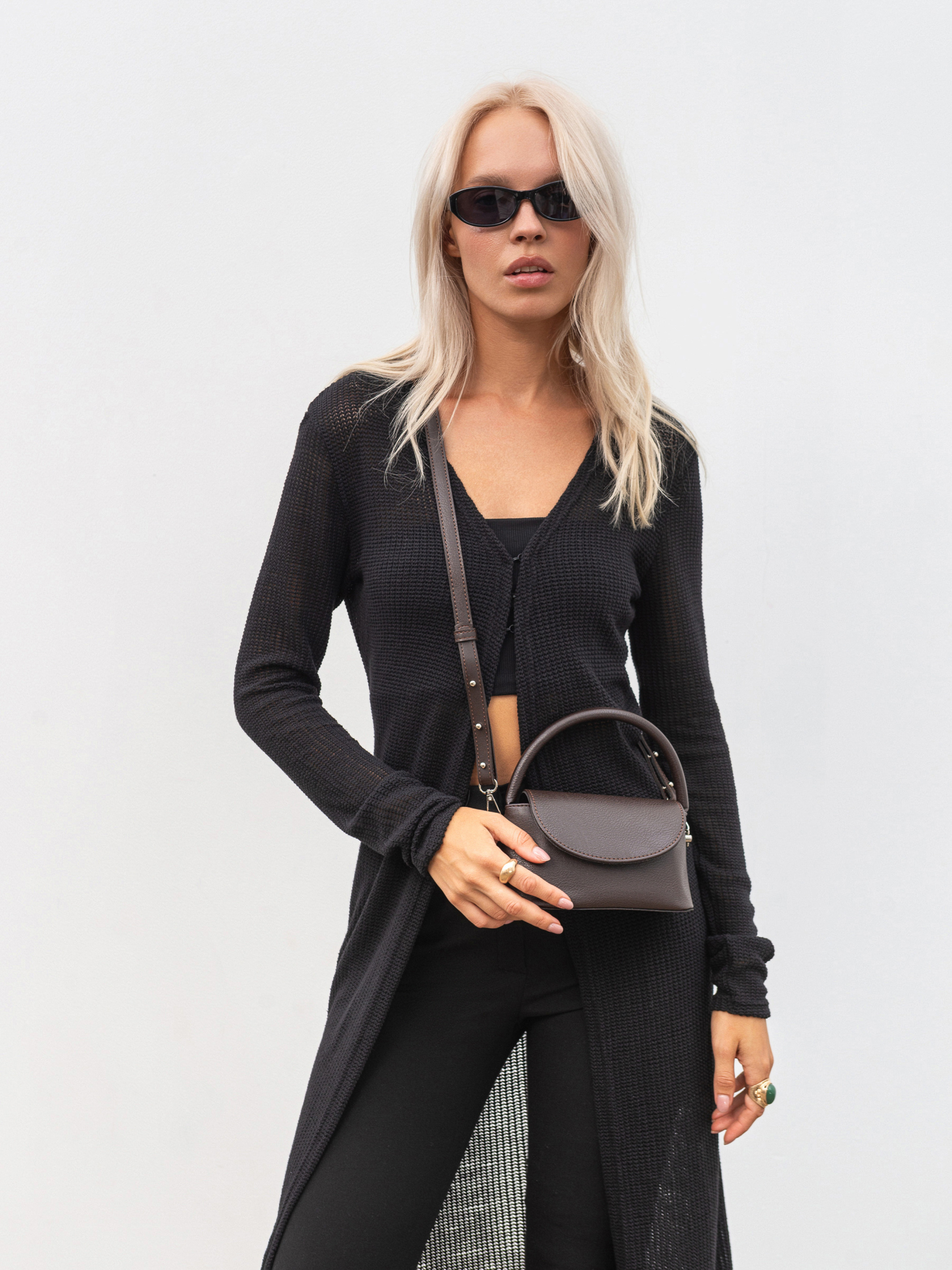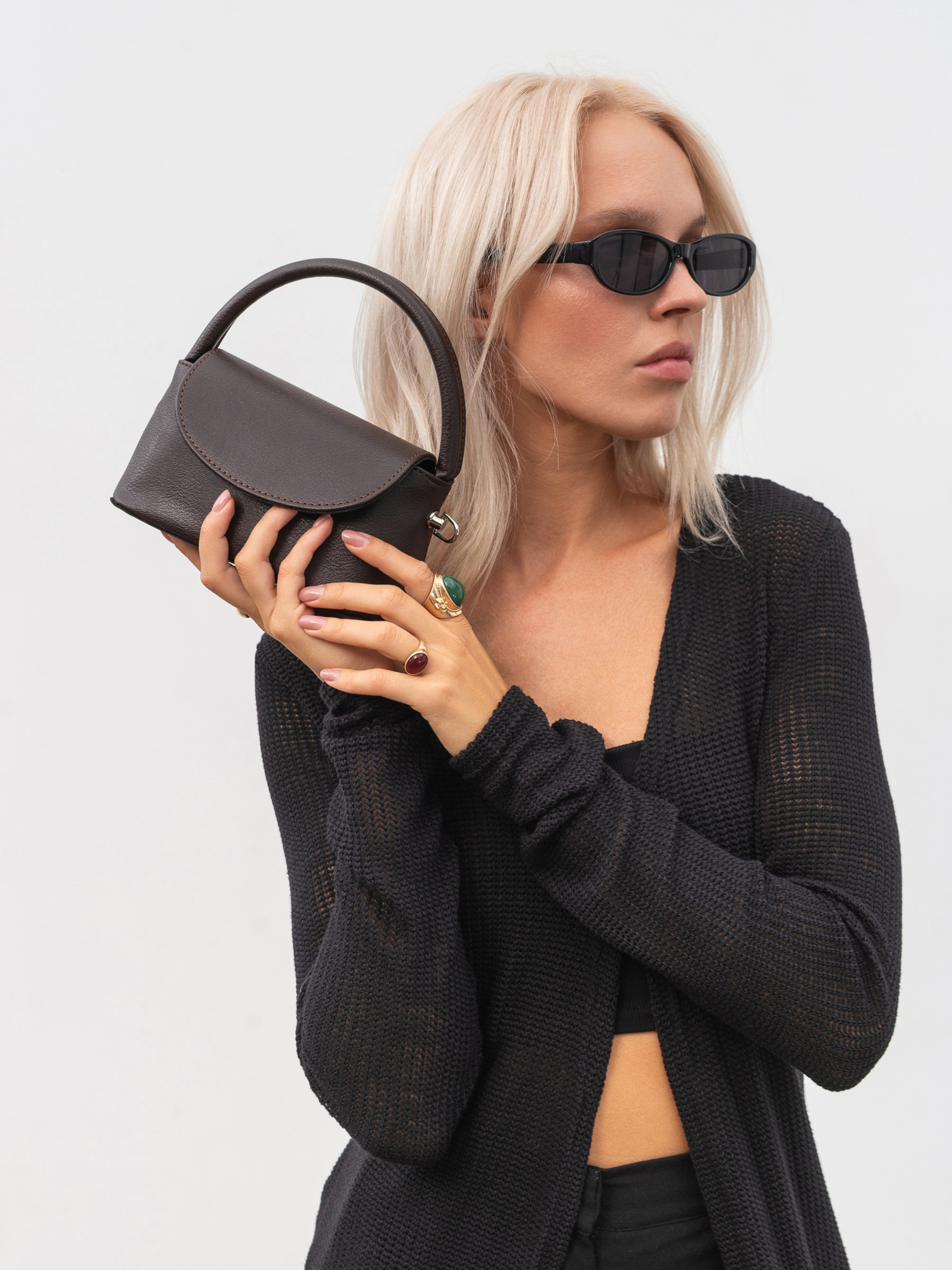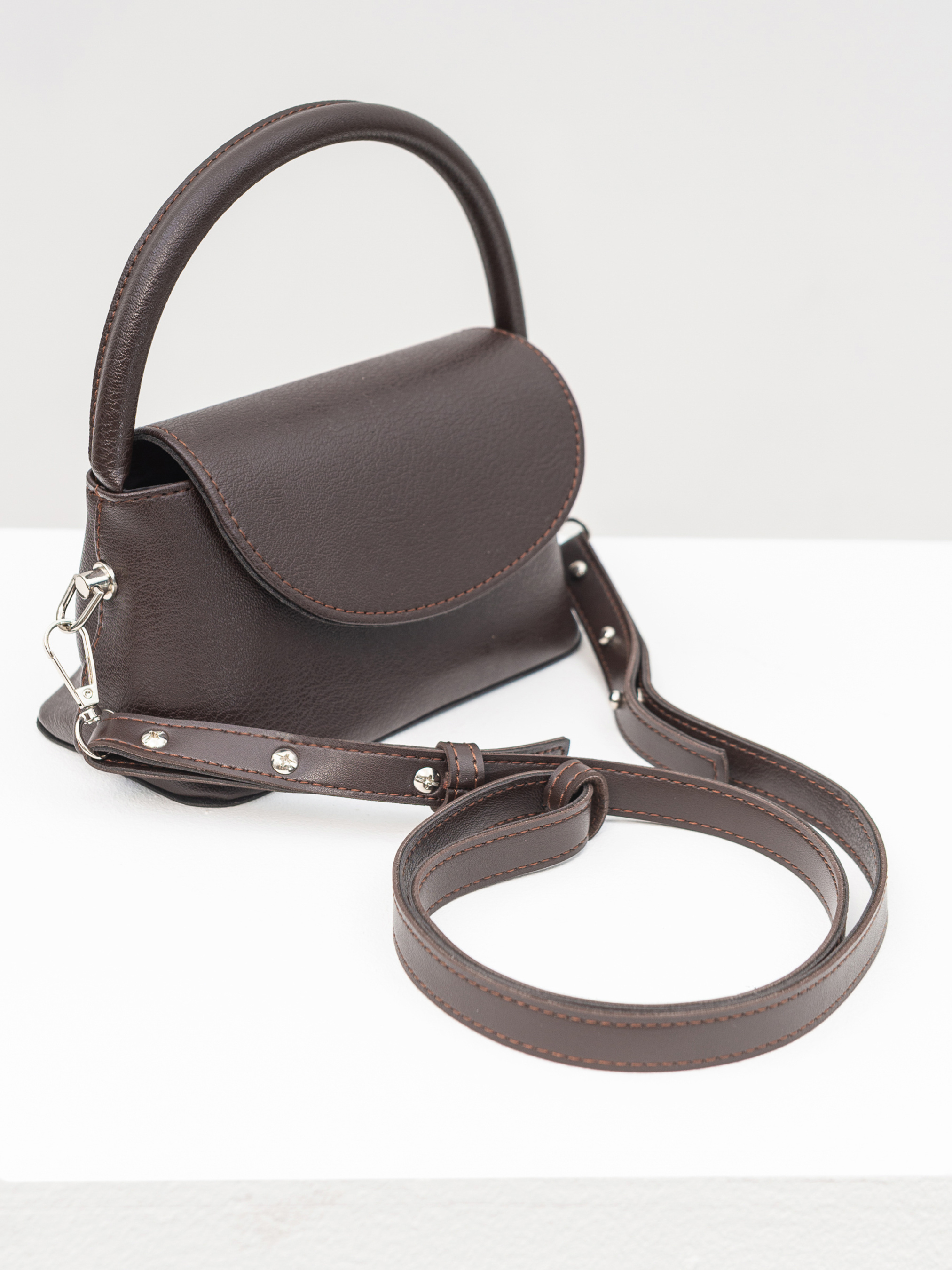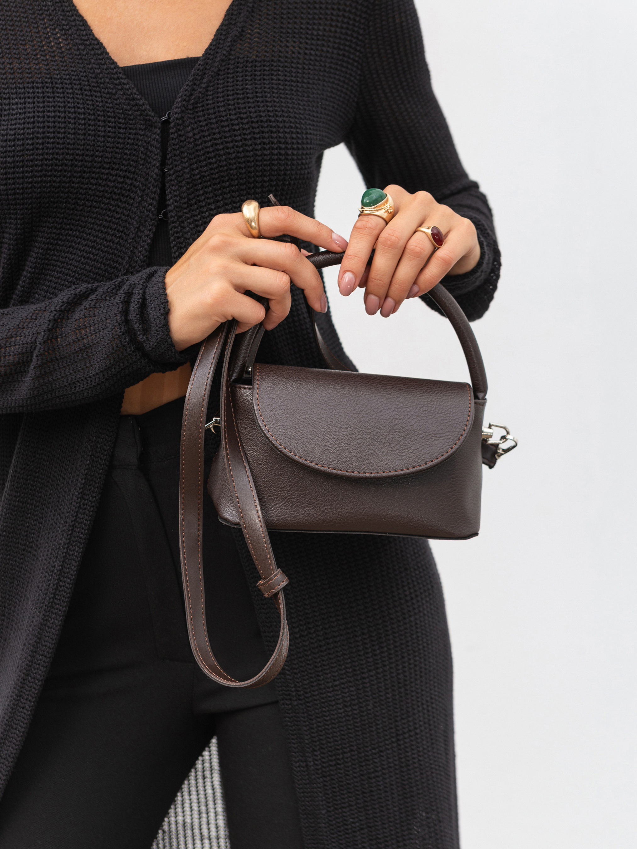 Стильный клатч компактного размера, который станет универсальной деталью любого повседневного образа. Выполненный из качественного заменителя, он держит форму и выглядит элегантно и современно. Благодаря широкому дну сумка довольно вместительная, несмотря на свои компактные размеры. Закрывается на удобную кнопку-магнит. Внутри - аккуратная тканевая подкладка, что добавляет изделию опрятности. Носите клатч в руке на короткой ручке или через плечо благодаря длинному ремешку. Серебряная фурнитура добавляет модного акцента. Доступные цвета: черный, коричневый. Высота без ручки 10 см Длина 18 см Ширина 9 см