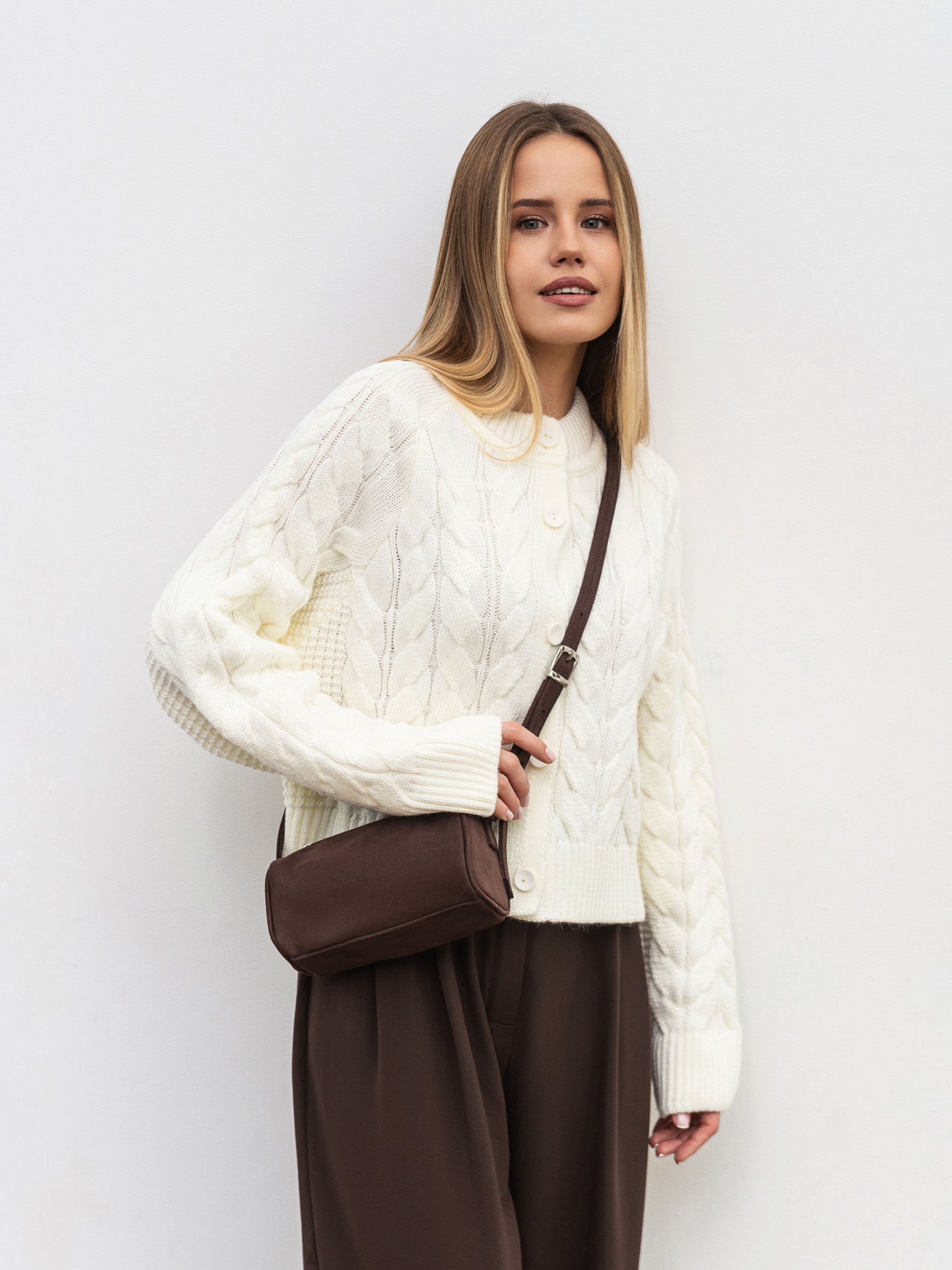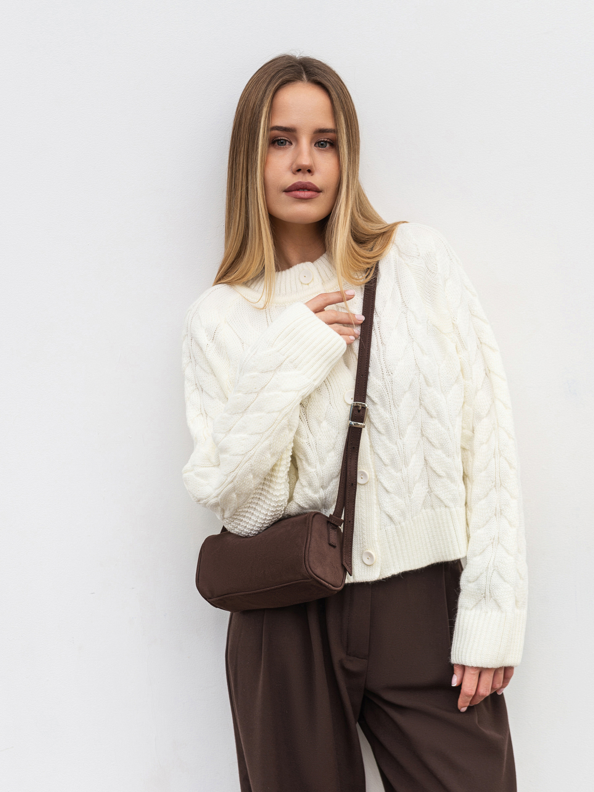 Компактная кросс-боди в форме цилиндра - стильный акцент для повседневных образов. Выполненная из искусственного нубука, имитирующего замшу, сумка имеет мягкую фактуру и выглядит элегантно. Модель оснащена длинным ремешком с регулятором, что позволяет удобно носить ее через плечо. Несмотря на компактный формат, сумка легко вмещает все самое необходимое. Доступные цвета: мокко, коричневый. Высота аксессуара: 10 см Длина аксессуара: 19 см Ширина аксессуара: 10 см Высота ручки: мин. 19 см, макс. 64 см