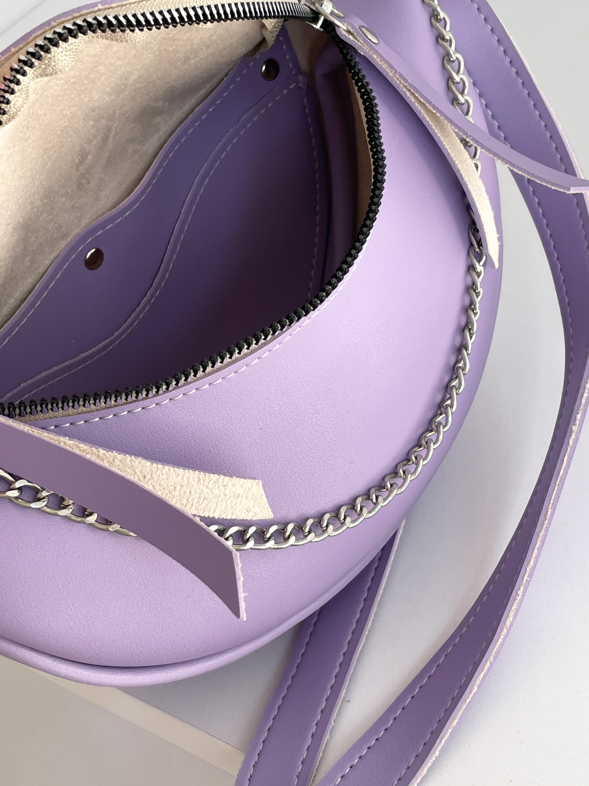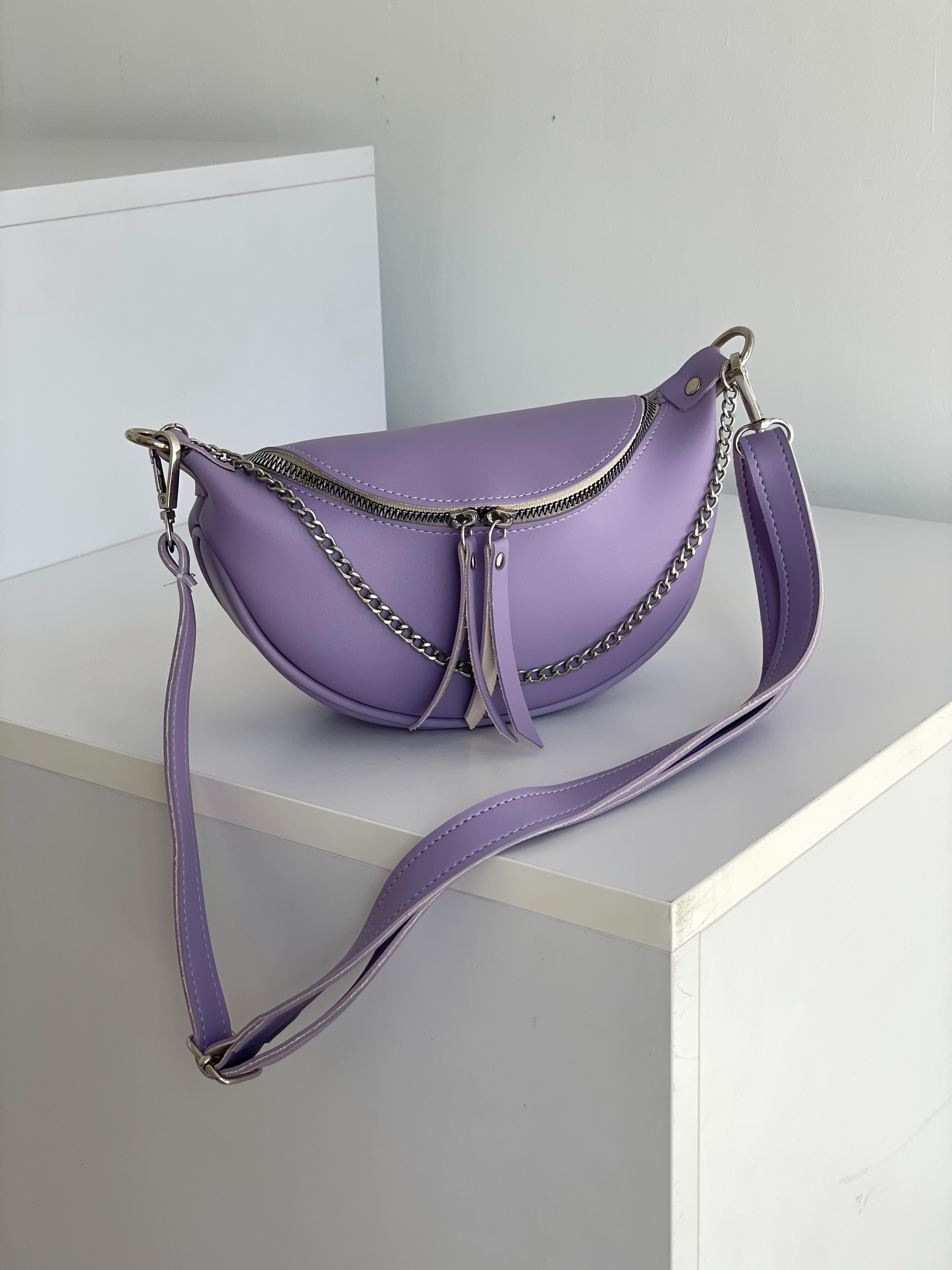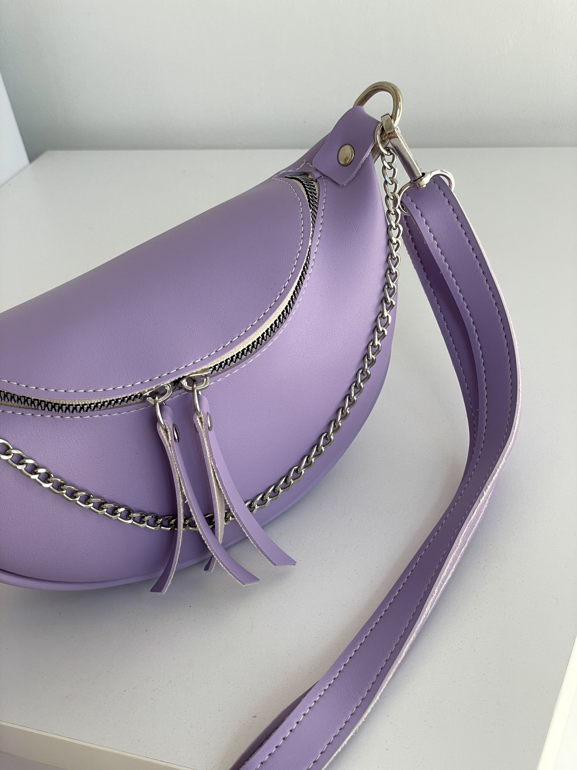 Бананка "Саманта" полукруглой формы ROMASHKA Отличный вариант для повседневной носки, чтобы взять все самое необходимое. Будет отличным завершающим этапом образа со спортивным костюмом или джинсами . Внутри один кармашек. Длина ремешка регулируется. При желании, его можно отстегнуть. Бананка дополнена цепью снаружи. Одна из самых удобных и актуальных моделей сумки на предстоящие сезоны. Длина 22-23 см, высота 14 см, ширина 7 см