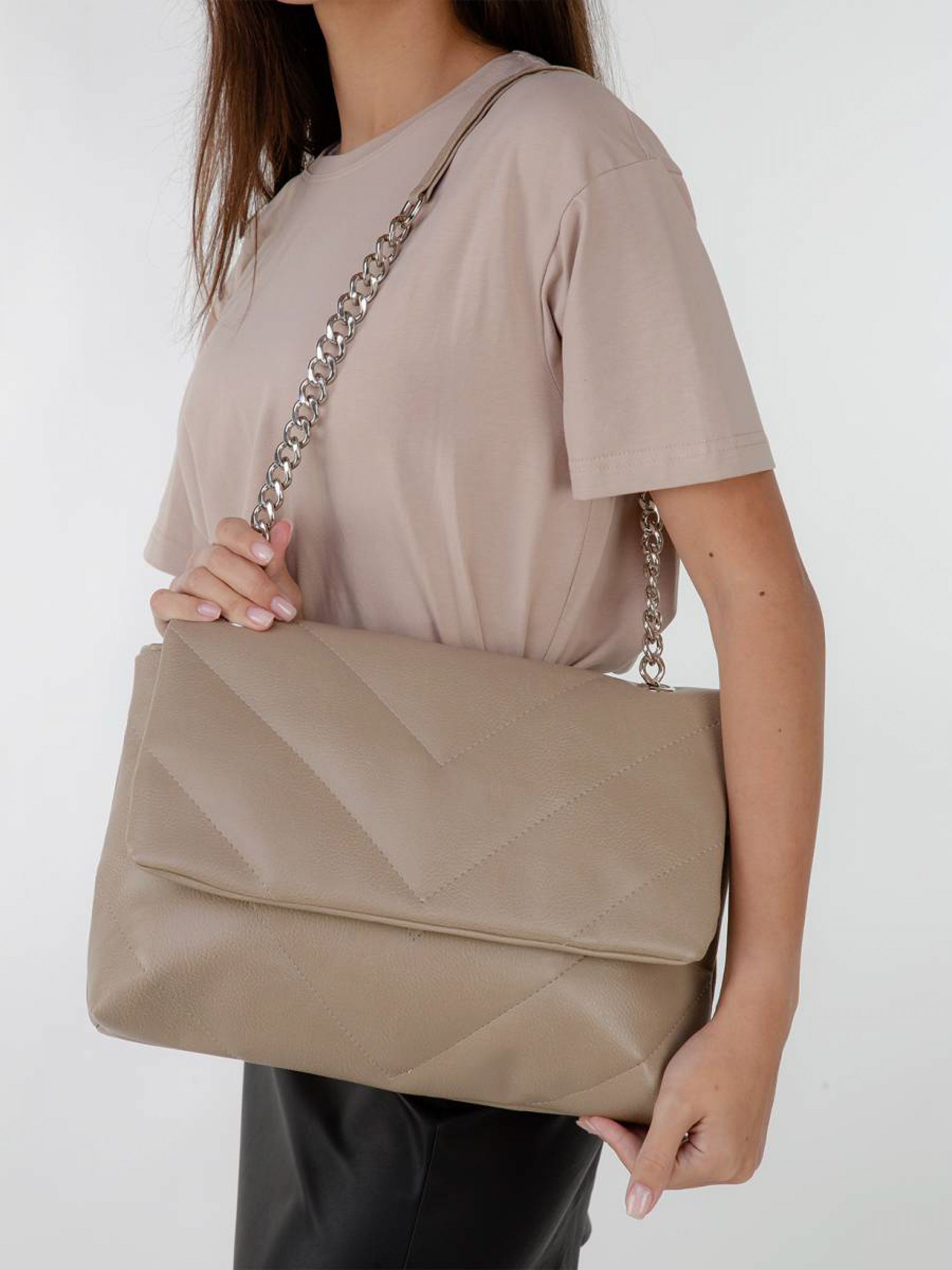 Сумка-клатч на одном ремешке-цепочке. Прямоугольная и вместительная. Внутри одно отделение и много кармашков. Фурнитура в темном цвете.