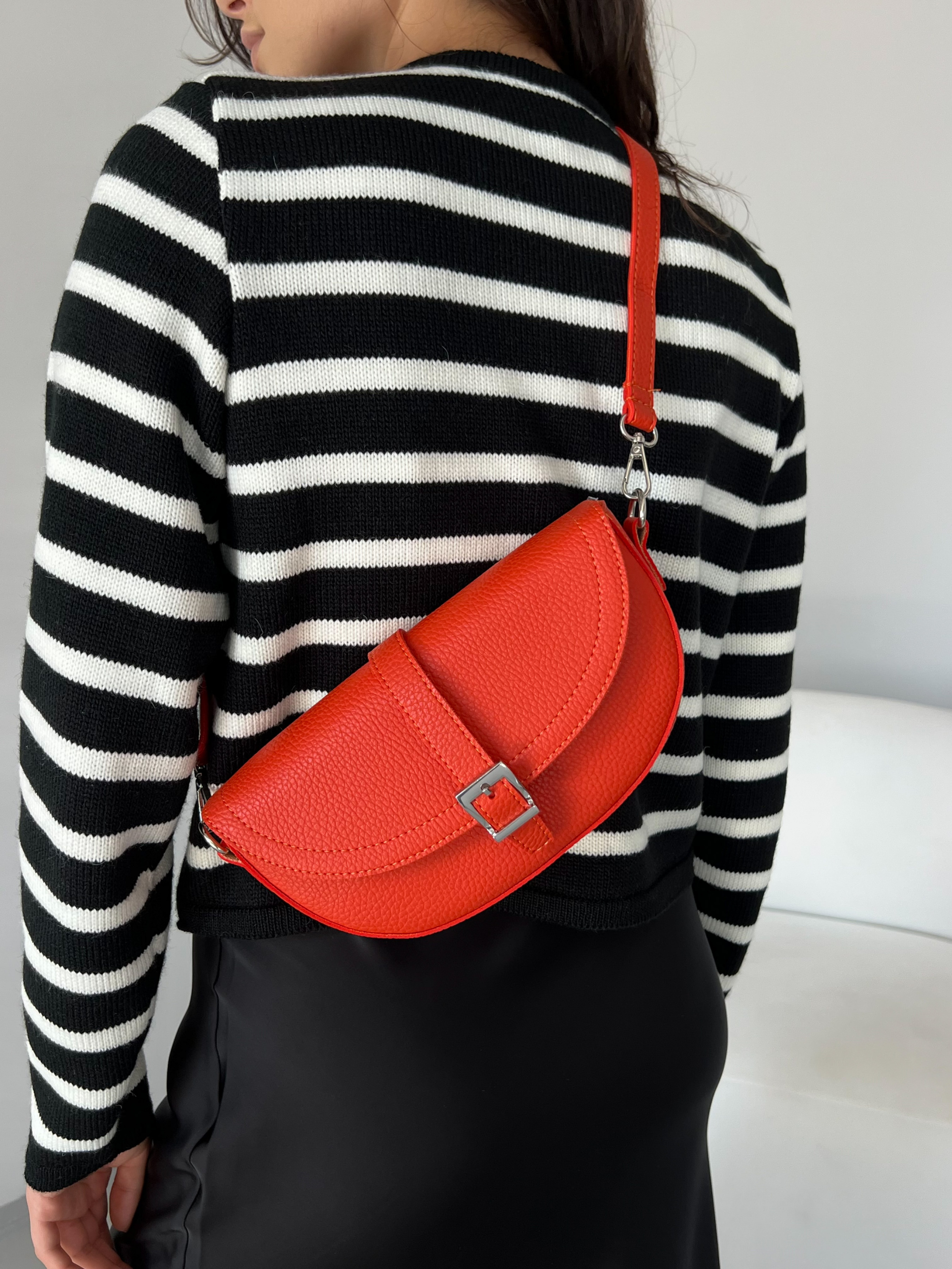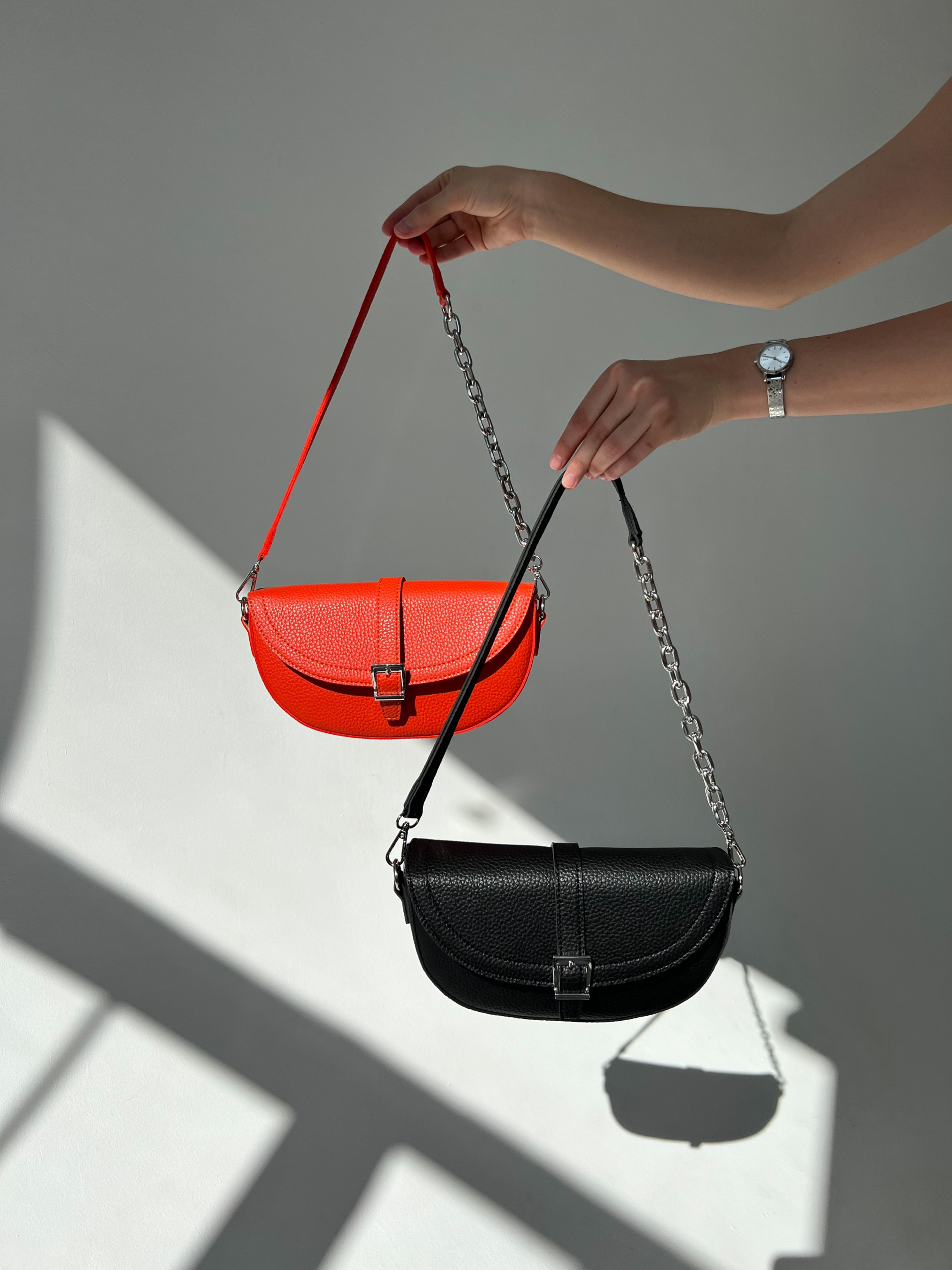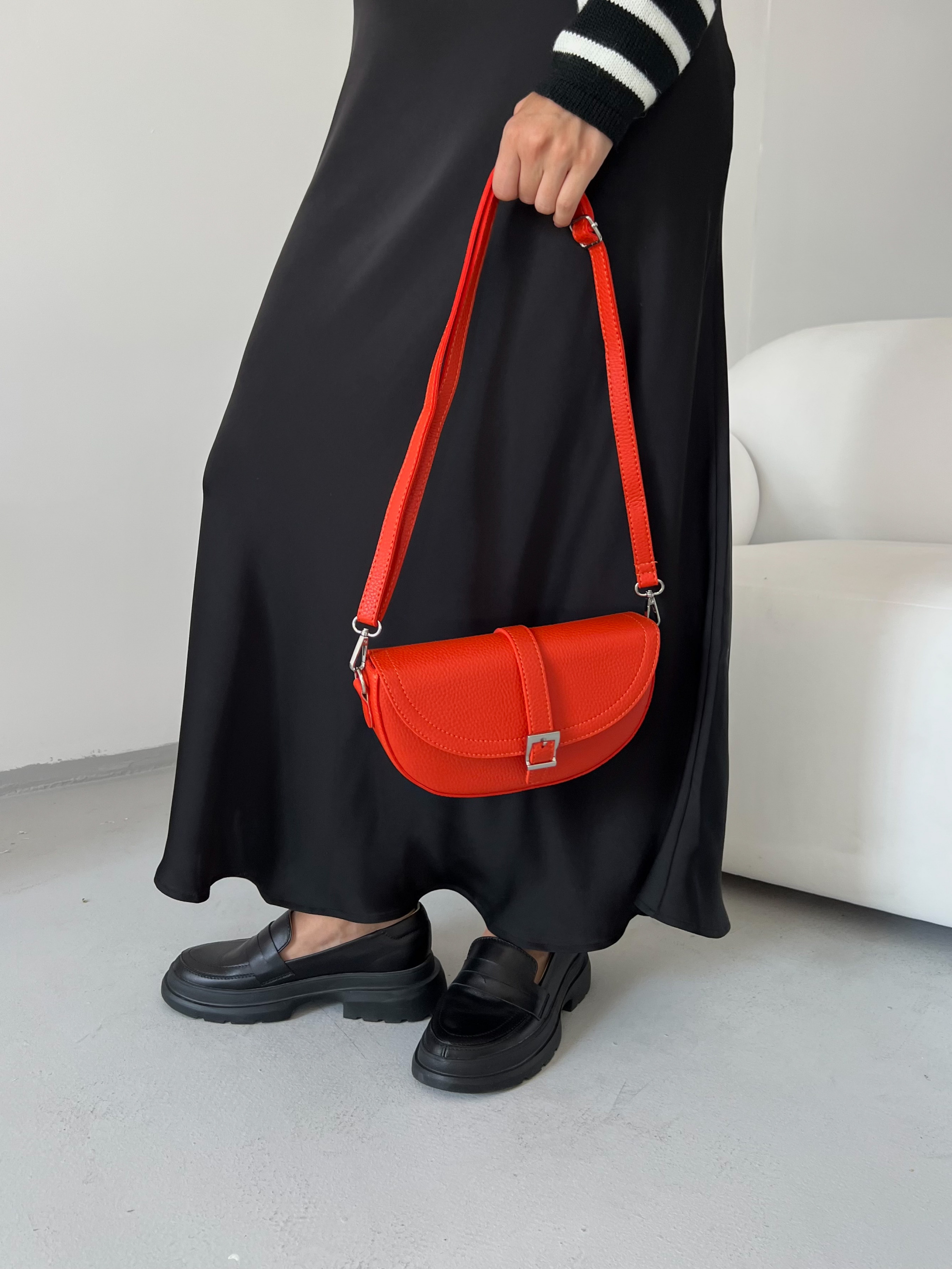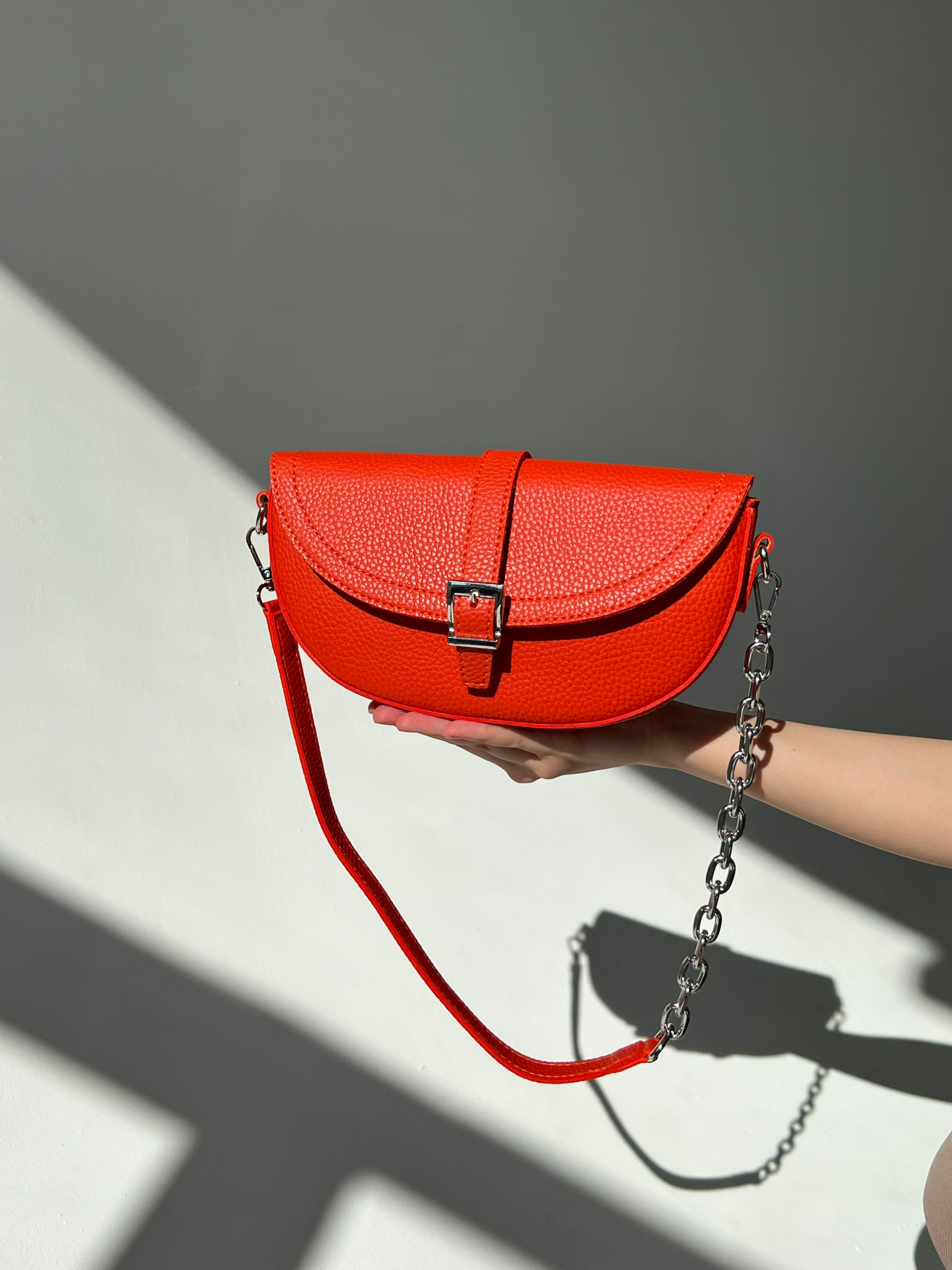 Сумка-клатч формы полумесяц с клапаном на магните. Эко кожа материала. Ремешок съемный, сочетание кожи и цепочки. В комплекте идет длинный ремешок с регулятором длины. Внутри на подкладке, есть кармашки. Базовая форма под любой повседневный образ. Высота аксессуара: 15 см Длина аксессуара: 25 см Ширина аксессуара: 7 см
