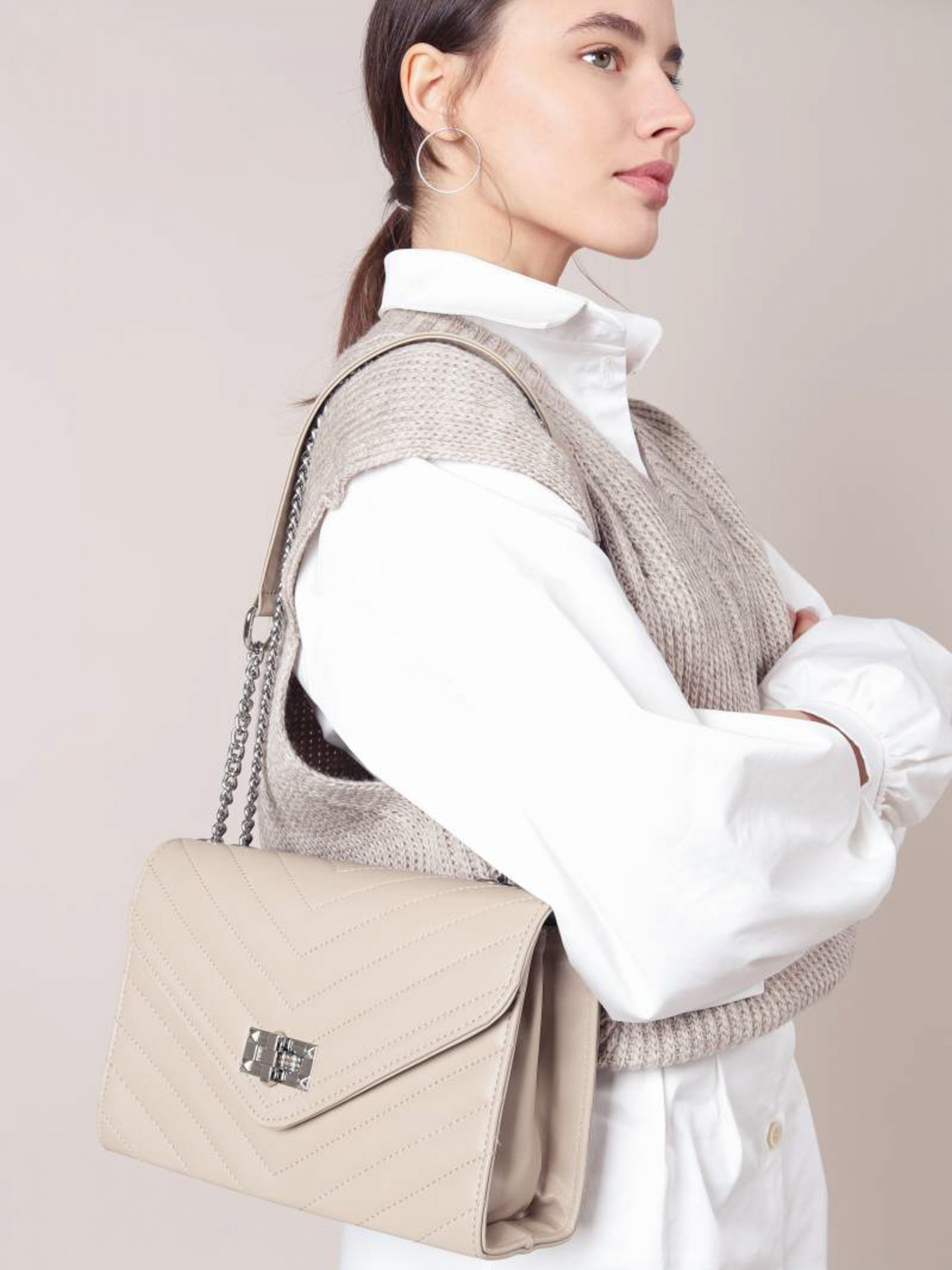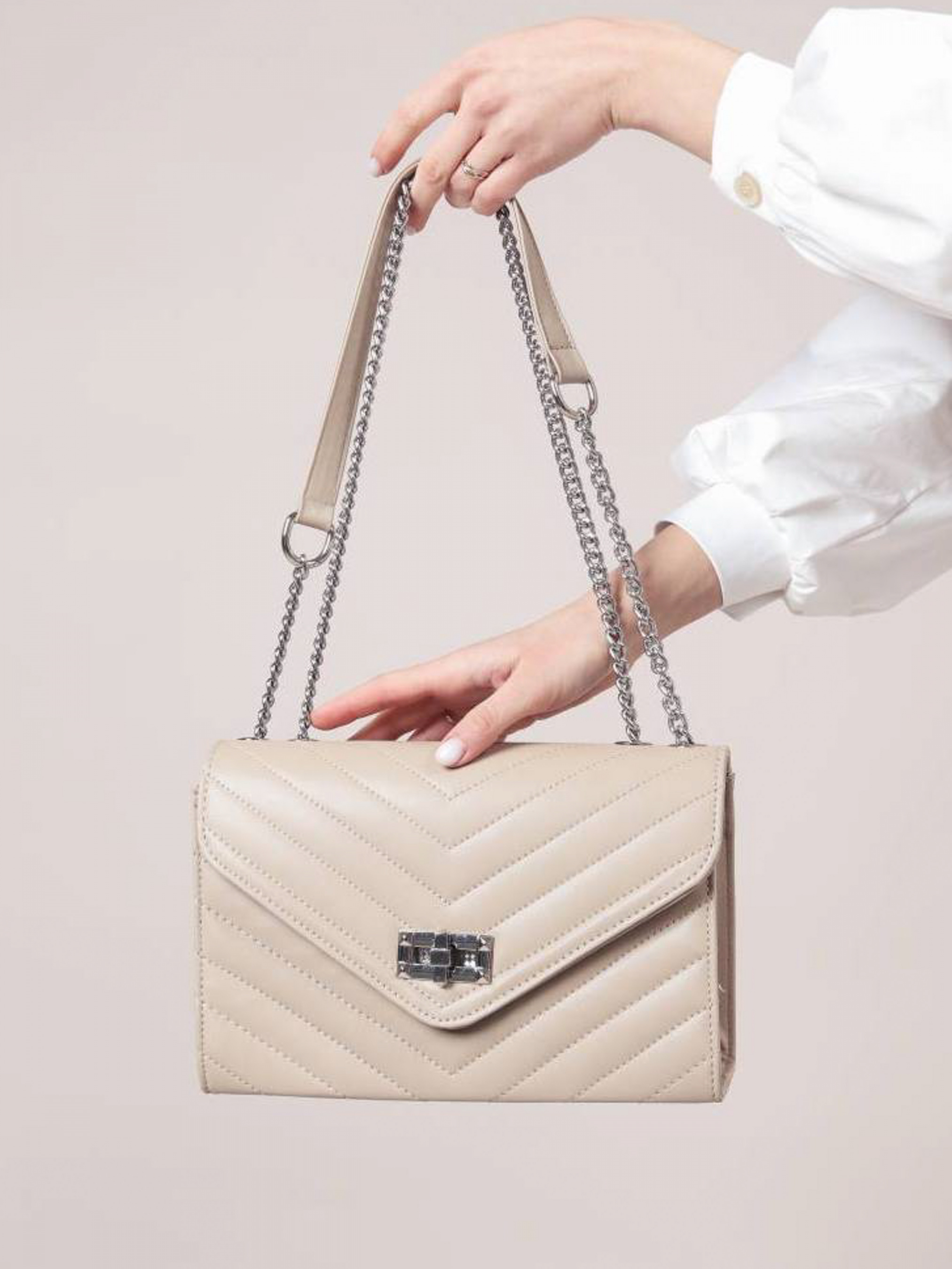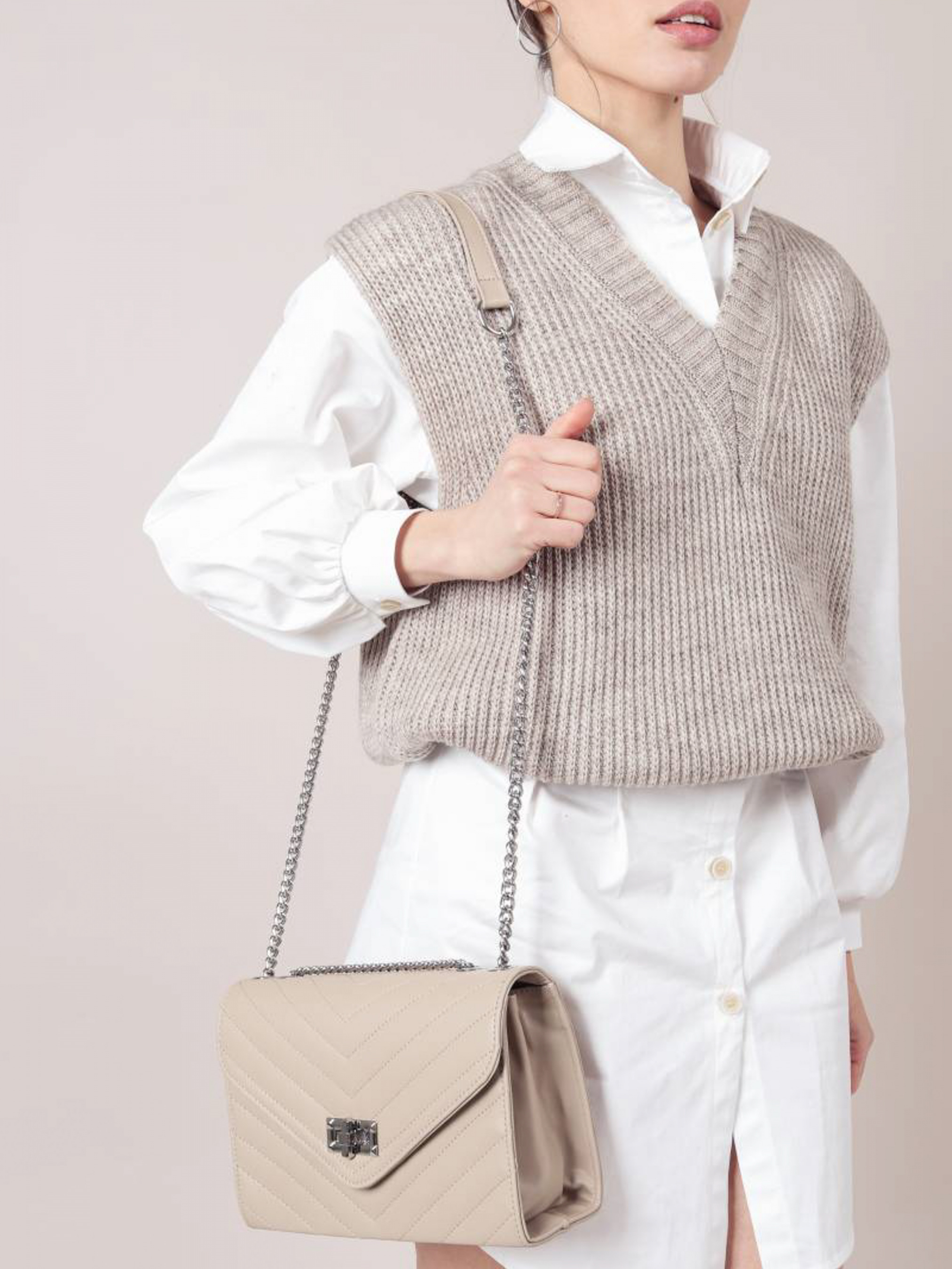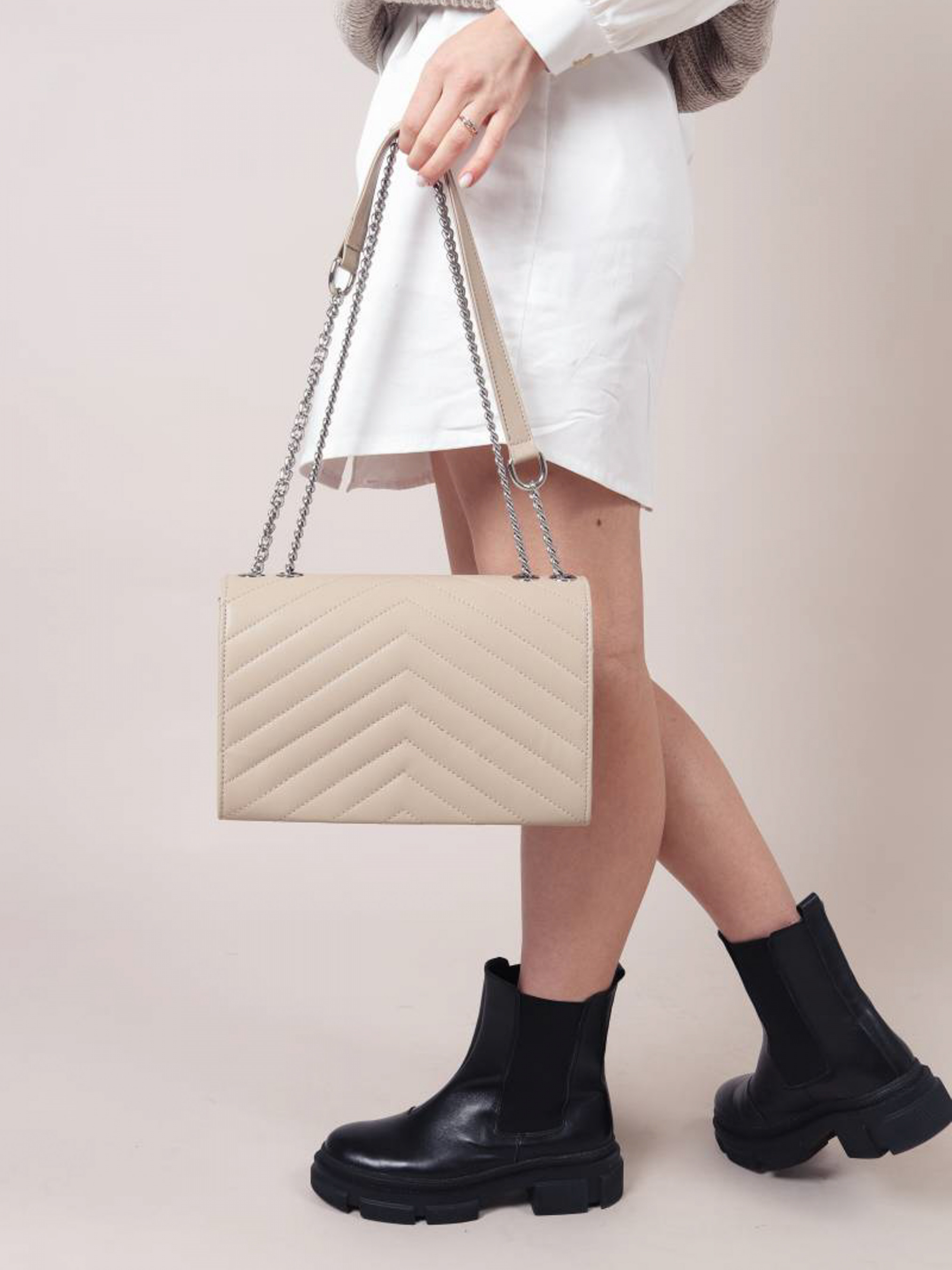 Сумка стеганая с треугольным перекрытием "Фиби" ROMASHKA Настоящий бестселлер! Вместительный и очень стильный вариант сумки. Сумка изготовлена из эко-кожи. Снаружи прошита швами. Закрывается нахлестом. В комплекте идет ремешок, который регулируется. Можно носить на одном длинном ремешке, а можно на двух. Отличный аксессуар для многих образов в стиле casual, деловых и вечерних. Дополнить лук можно объемными серьгами и часами. Размеры: высота 17,5 см, длина 26 см, ширина 9 см, длина ремешка 120 см Высота: 17,5 см Длина ремешка: 120 см Ширина ремешка: цепочка