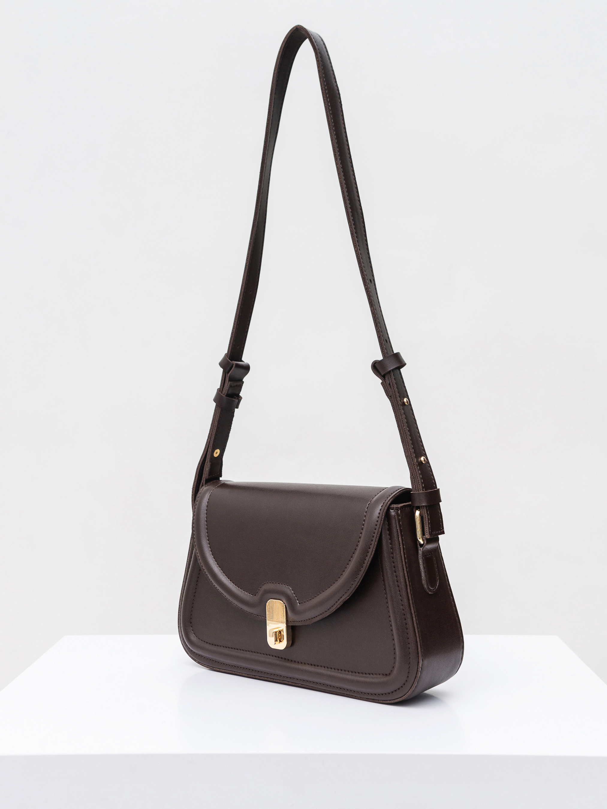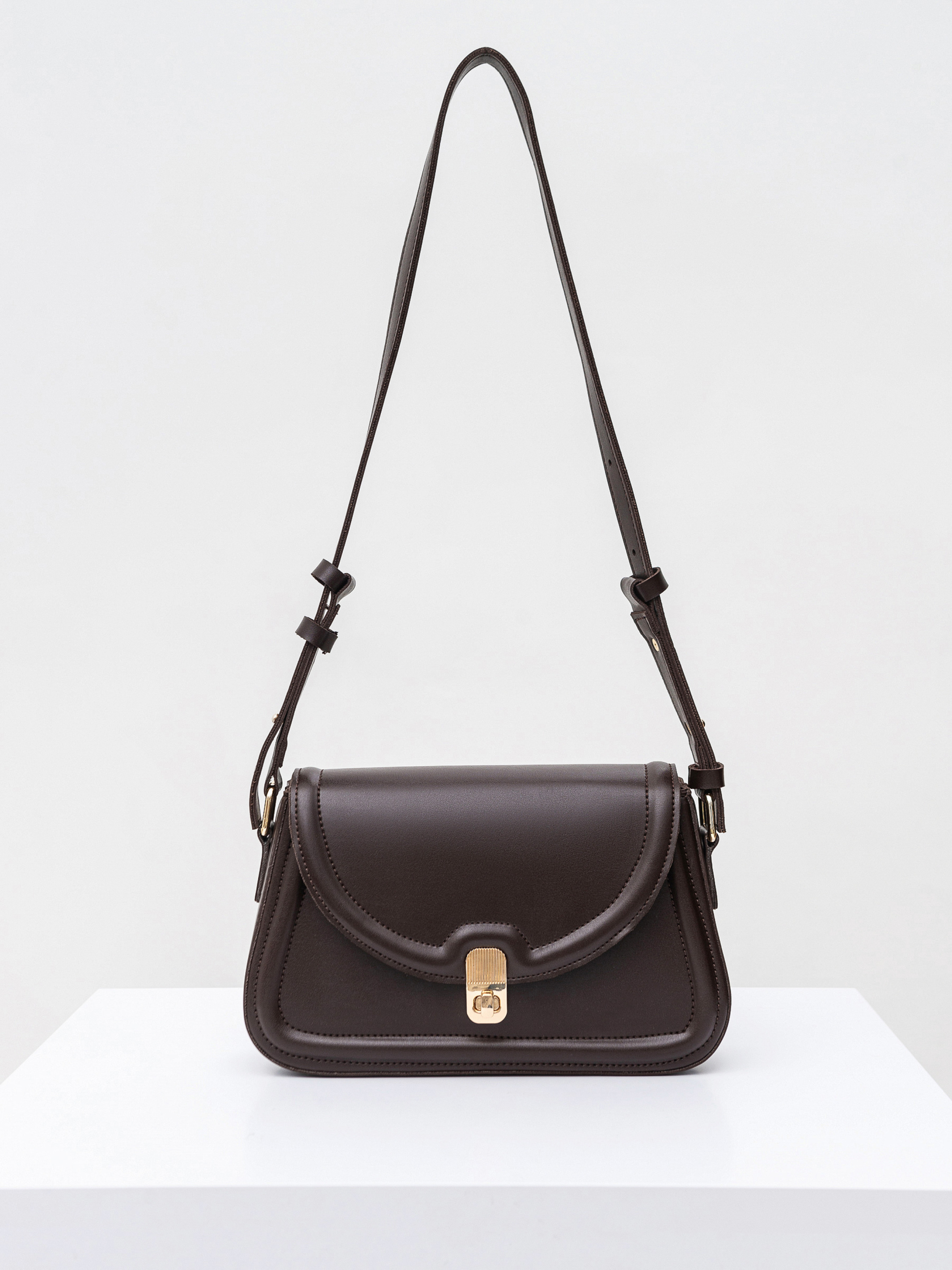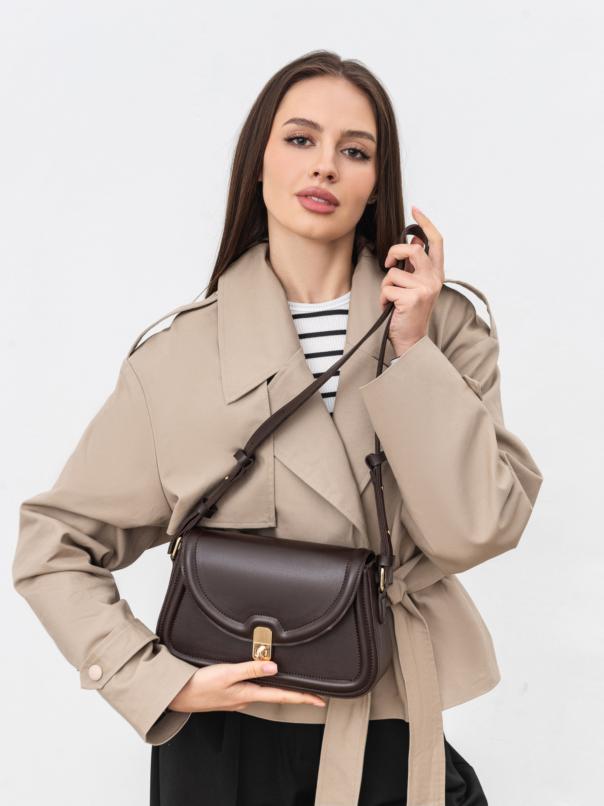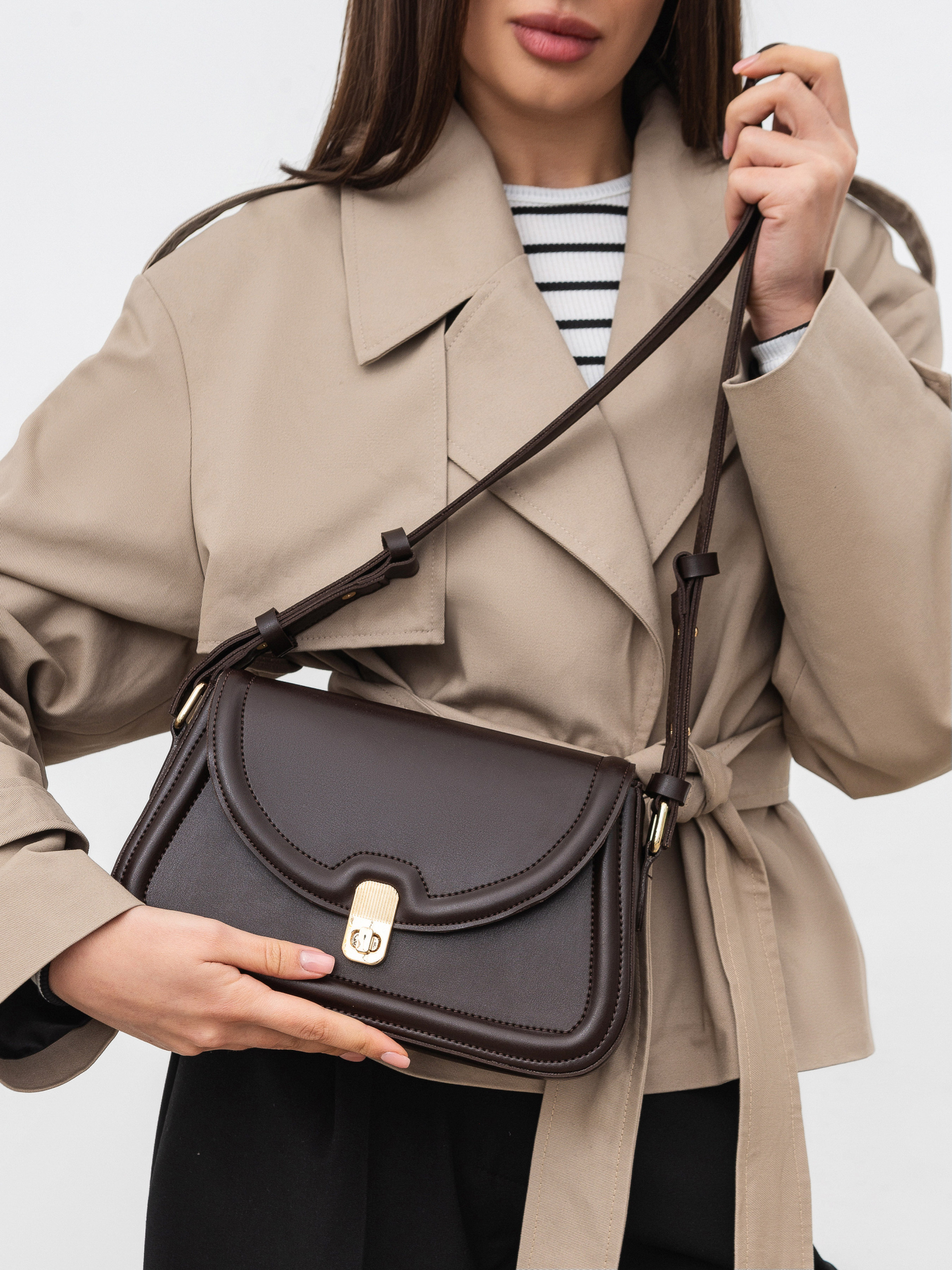 Лаконичный вариант сумочки на каждый день. Модель в форме трапеции с клапаном, который застегивается на застежку. Ремешок можно регулировать по длине. Фурнитура в золотом цвете. Имеет тканевую подкладку внутри и небольшой карман. Можно сочетать как с вечерними образами, так и более повседневными.