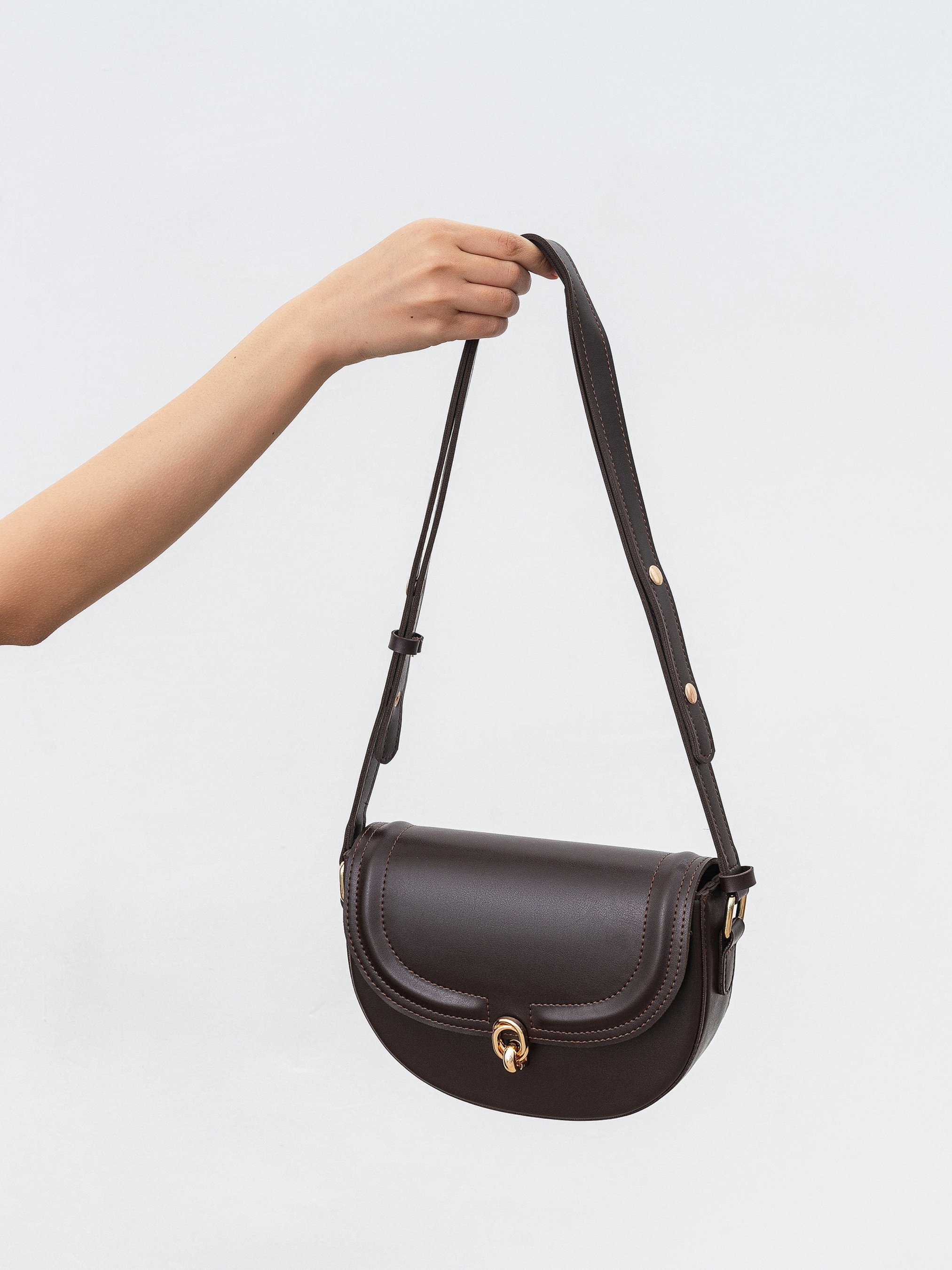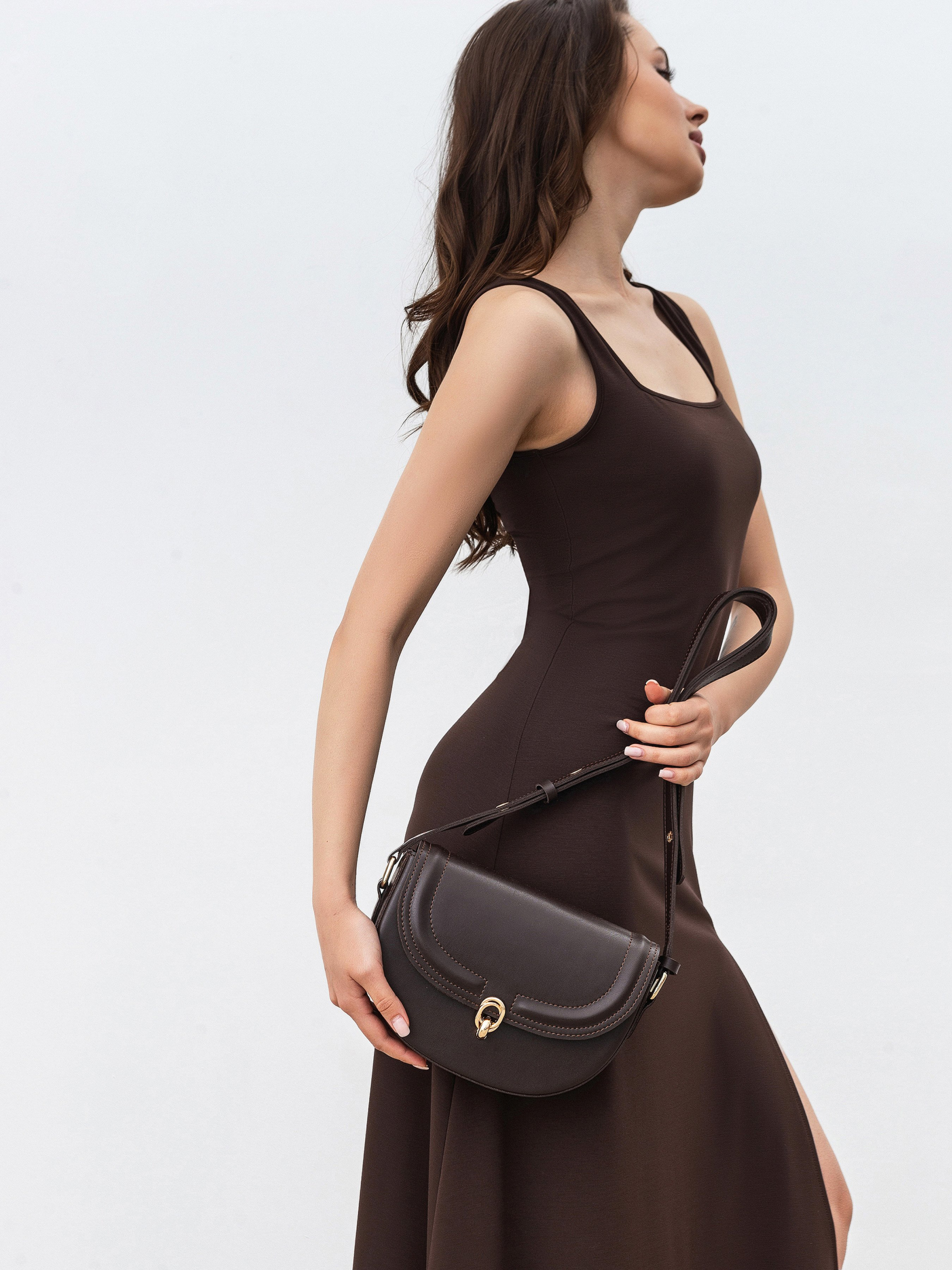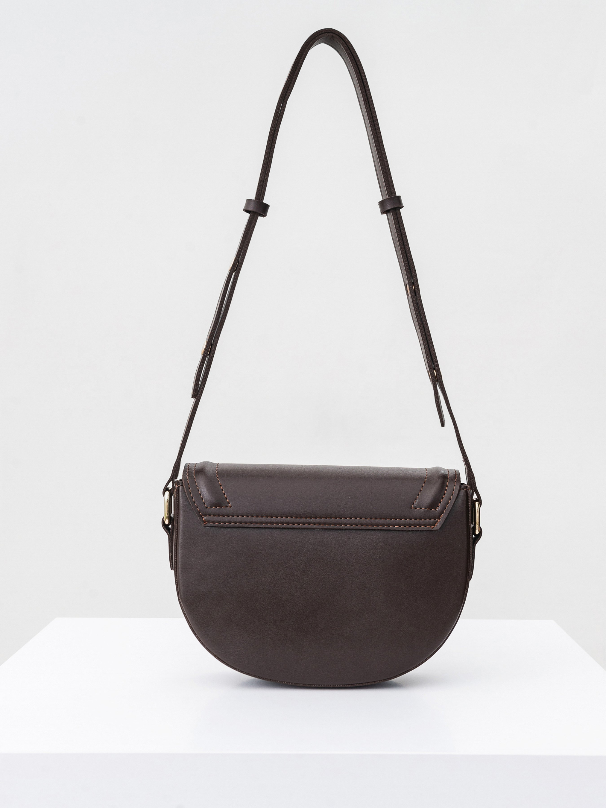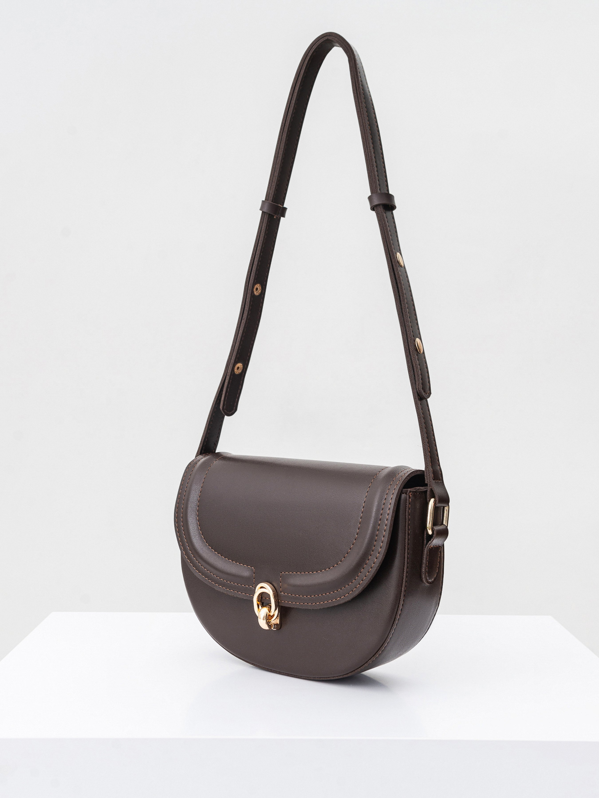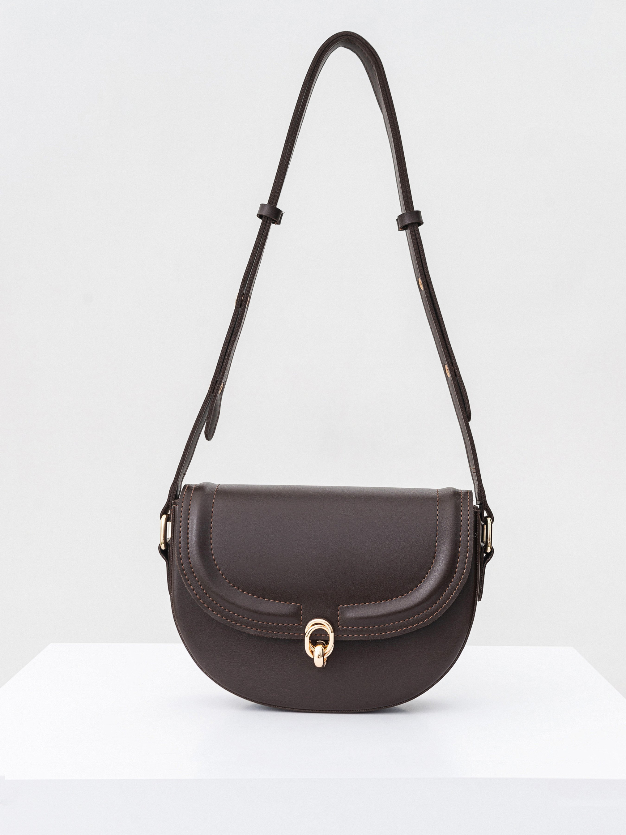 Полукруглая сумка с длинным ремешком. Закрывается на клапан. Фурнитура золотого цвета. Внутри есть тканевая подкладка и кармашки на молнии. Модель хорошо держит форму. В комплекте есть длинный ремешок для вариативности ношения. Замечательный повседневный вариант, который легко будет комбинироваться с чем угодно. Советуем сочетать со шляпками или очками. Высота аксессуара: 18 см, длина аксессуара: 23 см, ширина аксессуара: 6 см