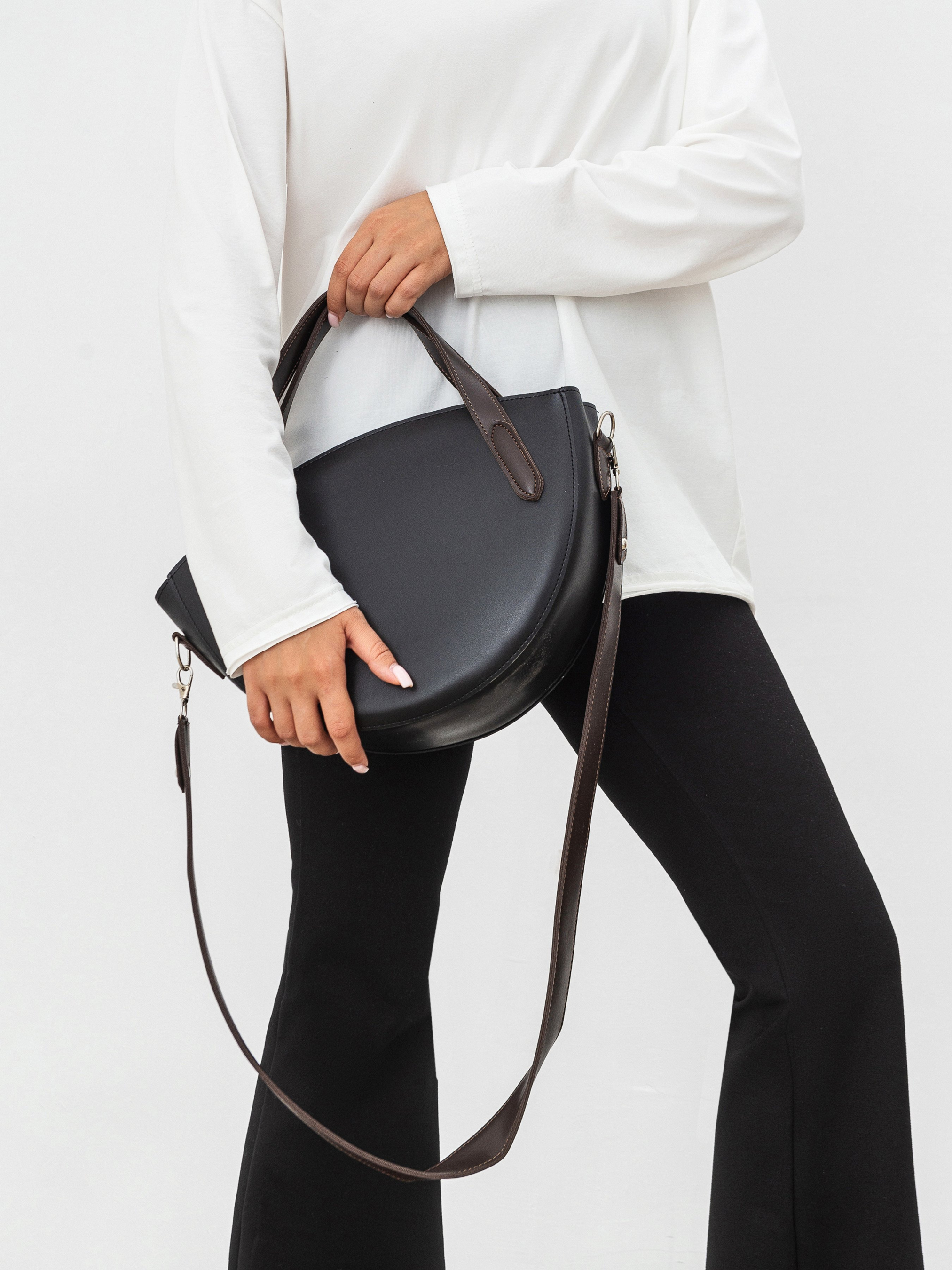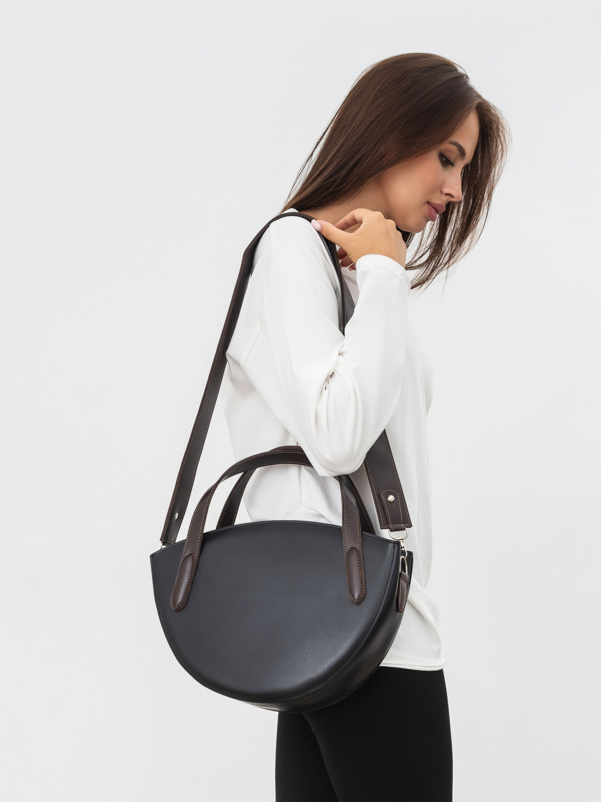 Сумка-полукруг с ручками и ремешком ROMASHKA Отлично будет сочетаться с бестселлером Ромашки - платьем Сорренто . Женственная и очень вместительная сумочка на каждый день. Сумка в форме полукруга из эко кожи станет отличным аксессуаром в повседневном образе и для прогулки. В комплекте есть дополнительный широкий ремешок. Внутри одно отделение и по бокам карманы. Максимальная длина 36 см, высота 23 см Длина ремешка 103 см
