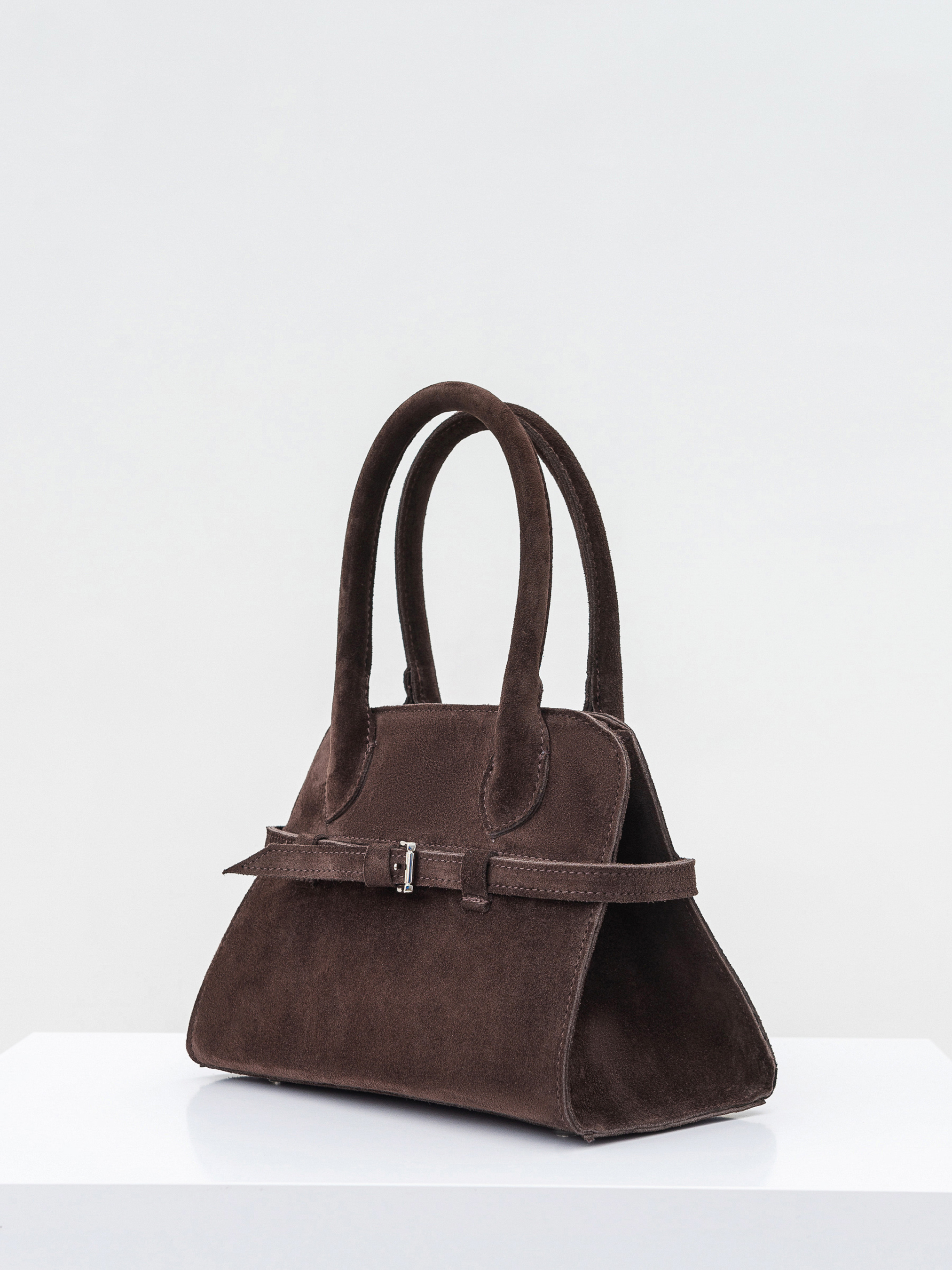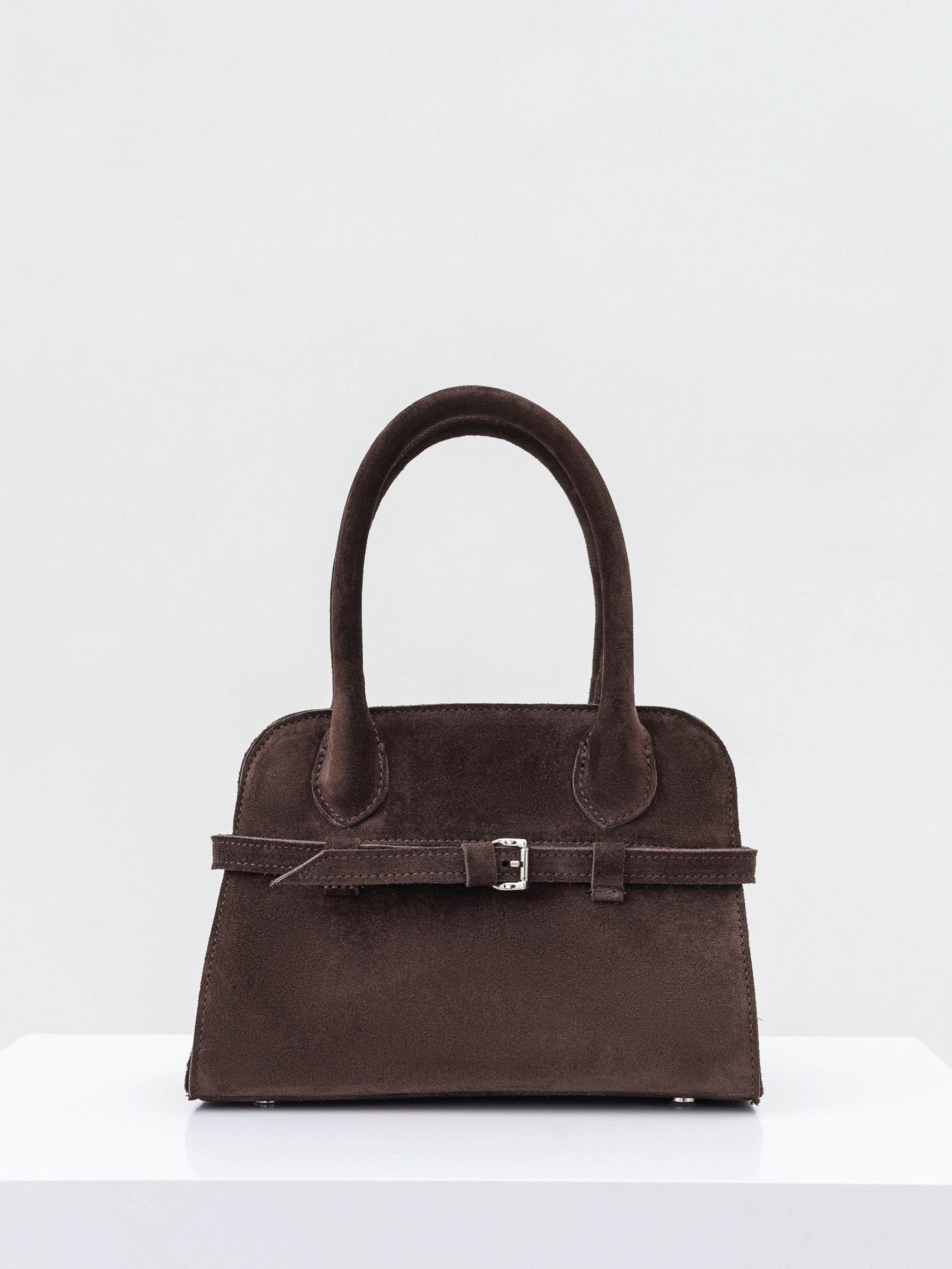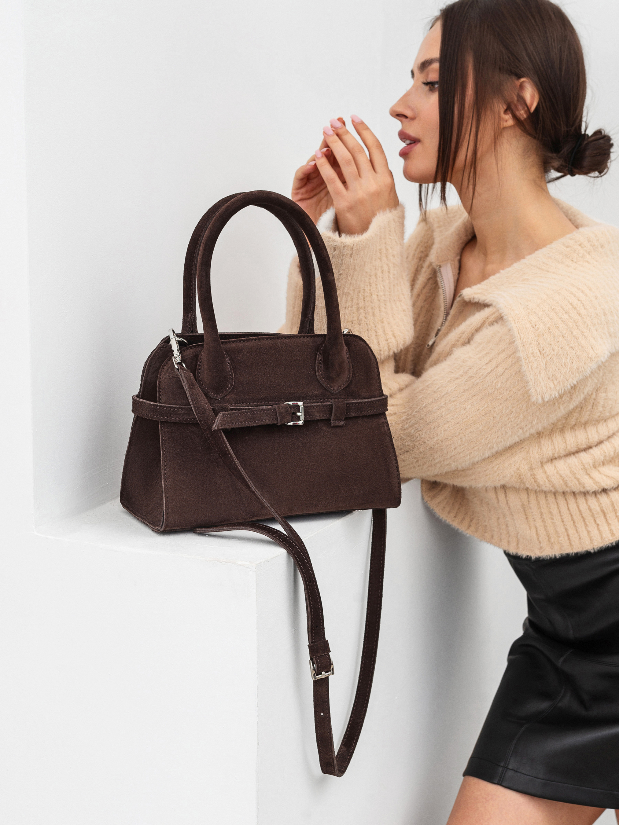 Сумка с ремешком трендовой формы. Модель среднего размера имеет в комплекте длинный ремешок, который регулируется. Изготовлена из натуральной замши. Внутри же текстильная подкладка и карманы. Застегивается на молнию из светлого никеля. Акцентная модель из изящного материала дополнит образы с платьями, классическими костюмами и тому подобное. Длина 25 см, ширина 13 см, высота 17 см.