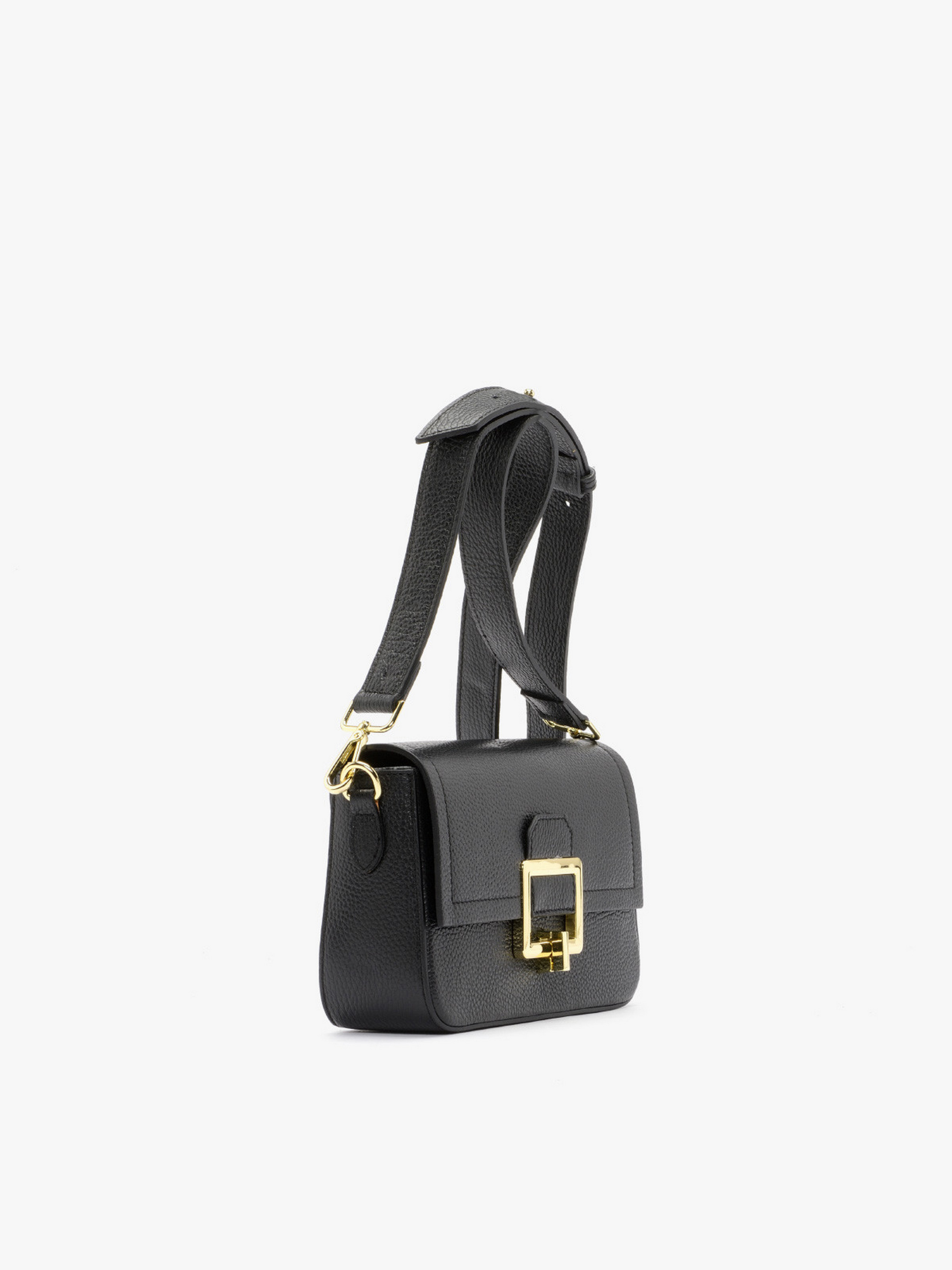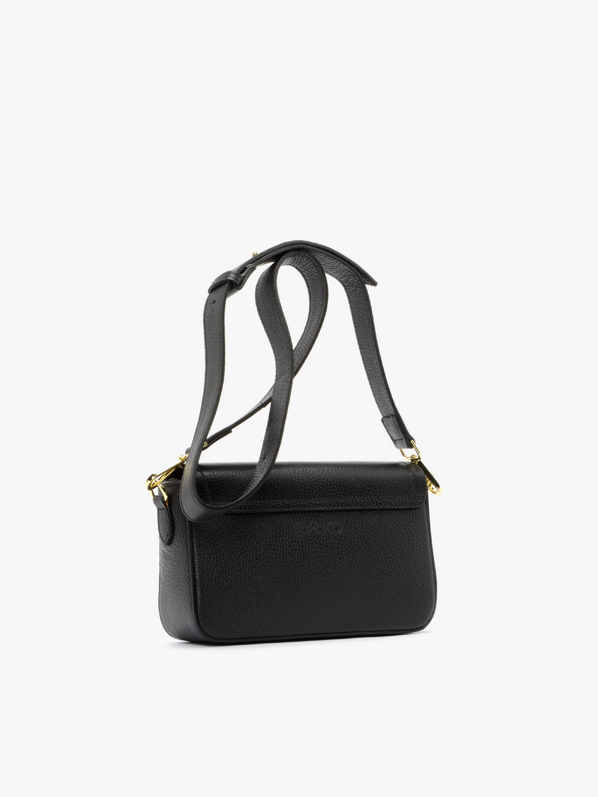 Стильная сумочка RYŁKO чёрного цвета. Изготовлена из натуральной кожи, с застежкой-пряжкой. Маленькая сумка, не вмещает формат А4. Модель с 1 внутренним карманом и регулируемым ремнем на плечо, длинной 130 см. Имеет декоративные элементы золотистого цвета. Размеры: Высота: 15 см, Ширина: 24 см, Глубина: 7 см.