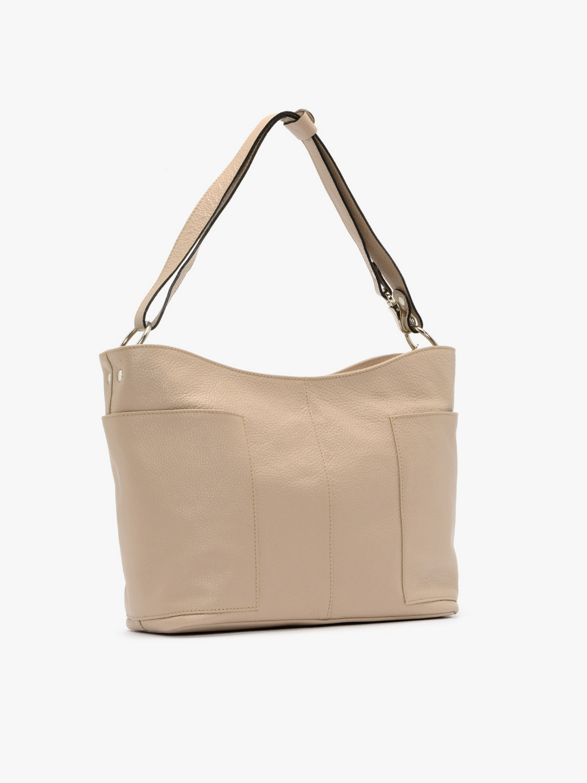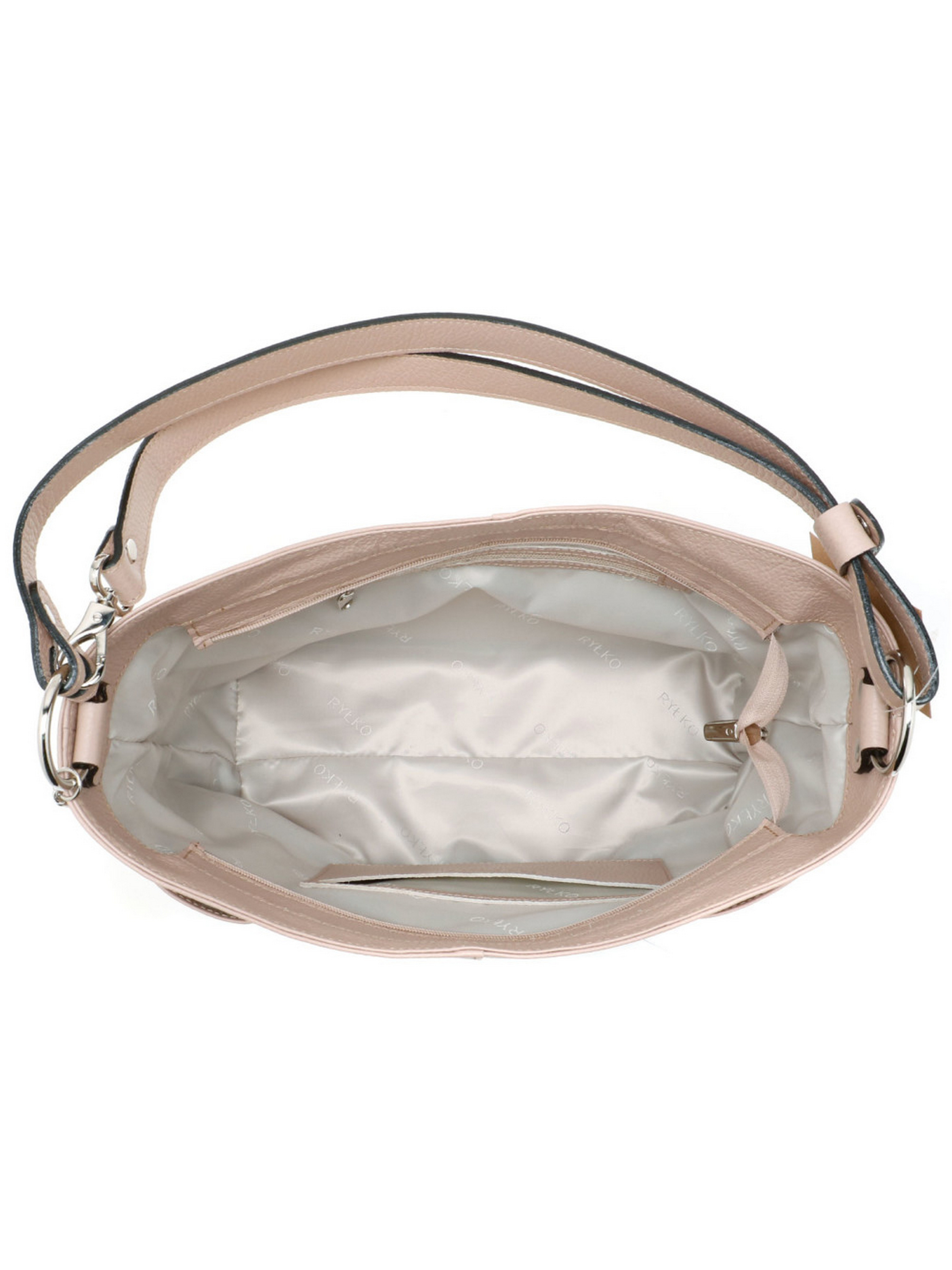 Стильная классическая сумочка RYŁKO бежевого цвета с розовым оттенком. Выполнена из натуральной кожи высокого качества. Сумка большого размера и вмещает в себя формат A4, с застежкой-на молнии. Модель с 4 внешними карманами, 2 внутренними карманами, удобной ручкой - высотой 27 см. и регулируемым ремнем на плечо - длиной 110 см. Сумка с красивой декоративной фурнитурой серебряного цвета и стильными элементами подвески на цепочке. Размеры: Высота: 24.5 см, Ширина: 32 см, Глубина: 13 см.