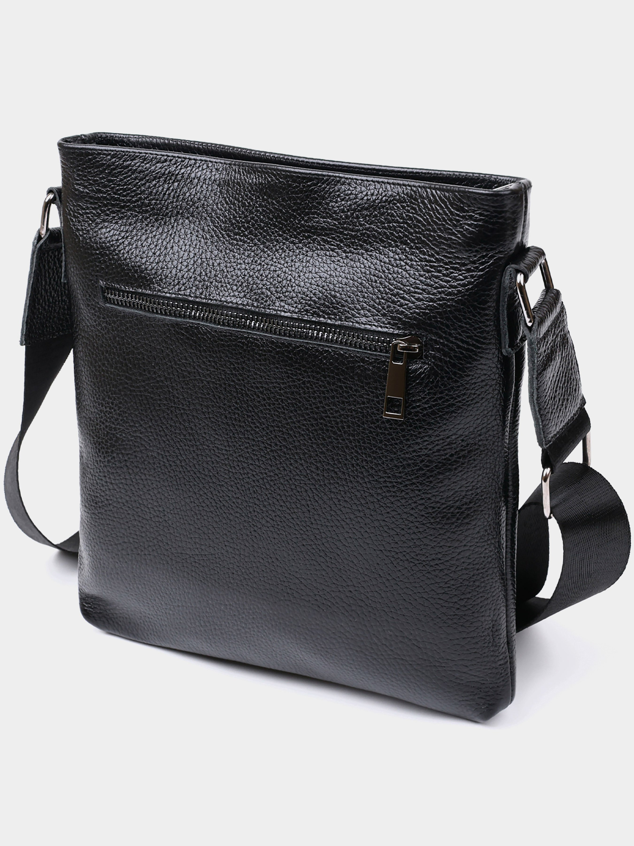 Материал: натуральная кожа. Цвет: черный. Размеры (ШхВхГ, см): 24х26 см. Страна производитель: Украина. Бренд: SHVIGEL. Описание: - основное отделения на молнии; - внутри кармашки для телефона и потайной карман на молнии; - на внешней стороне карман на молнии; - на тыльной стороне карман на молнии; - текстильный ремень для переноса на плече. Стильная мужская сумка с ремнем через плечо из натуральной кожи высокого качества. Имеет универсальный черный цвет, поэтому подойдет под одежду любого стиля и цвета. Данная модель имеет вместительное основное отделение и два кармана на внешней стороне. Фактура аксессуара – зернистая с небольшим переливом.