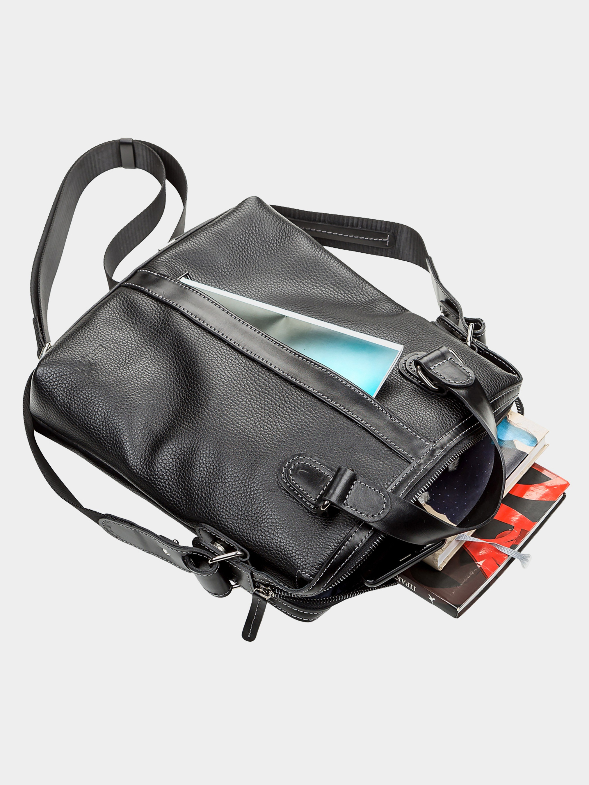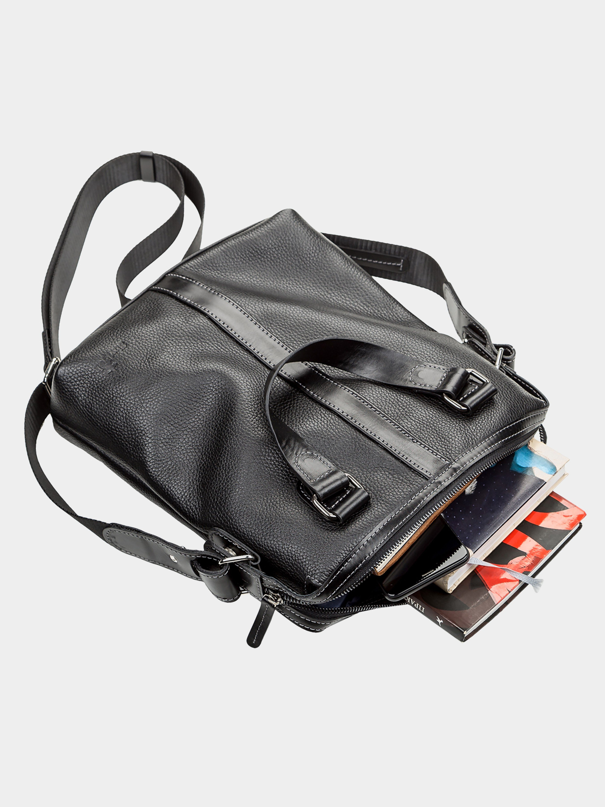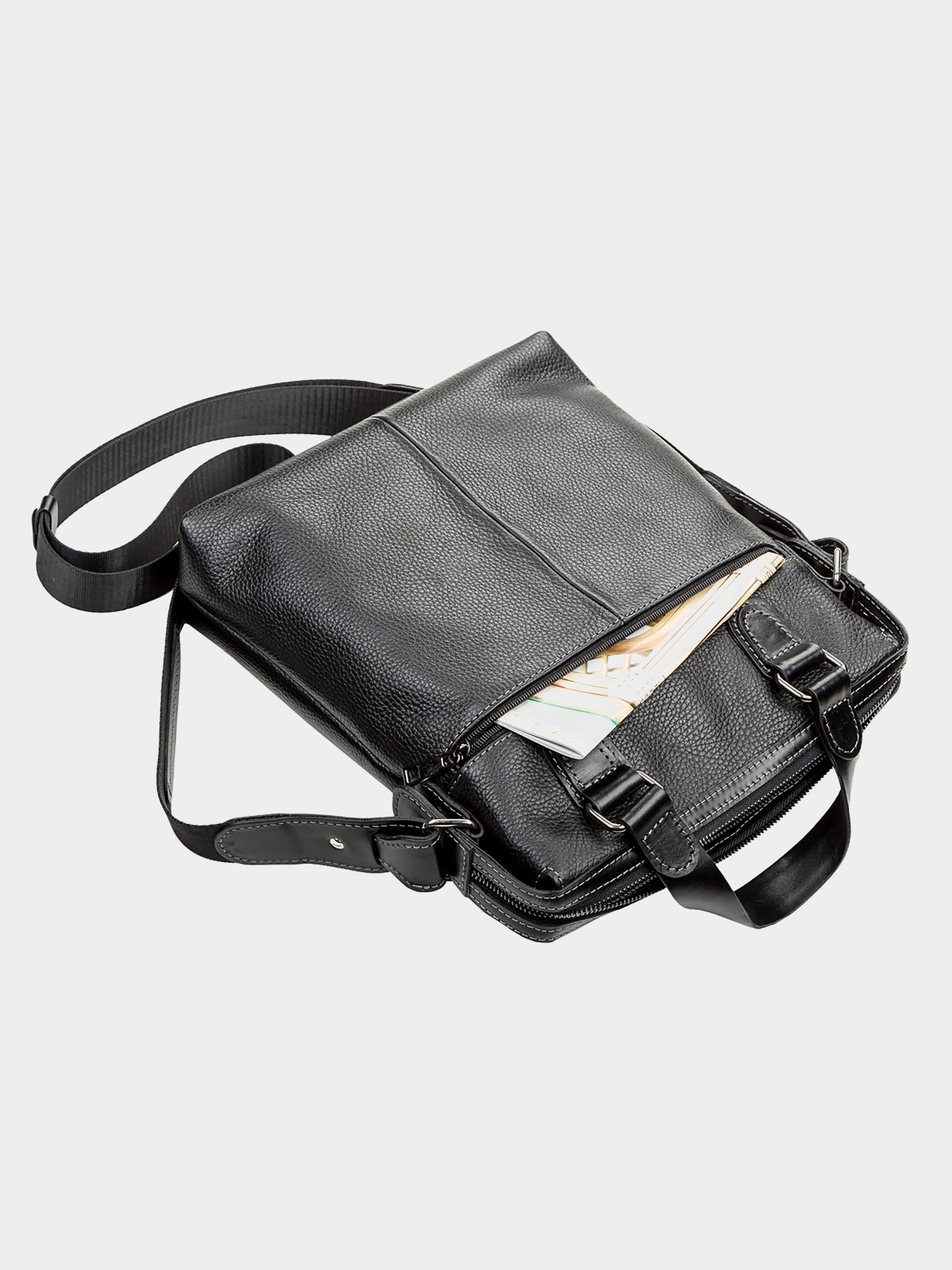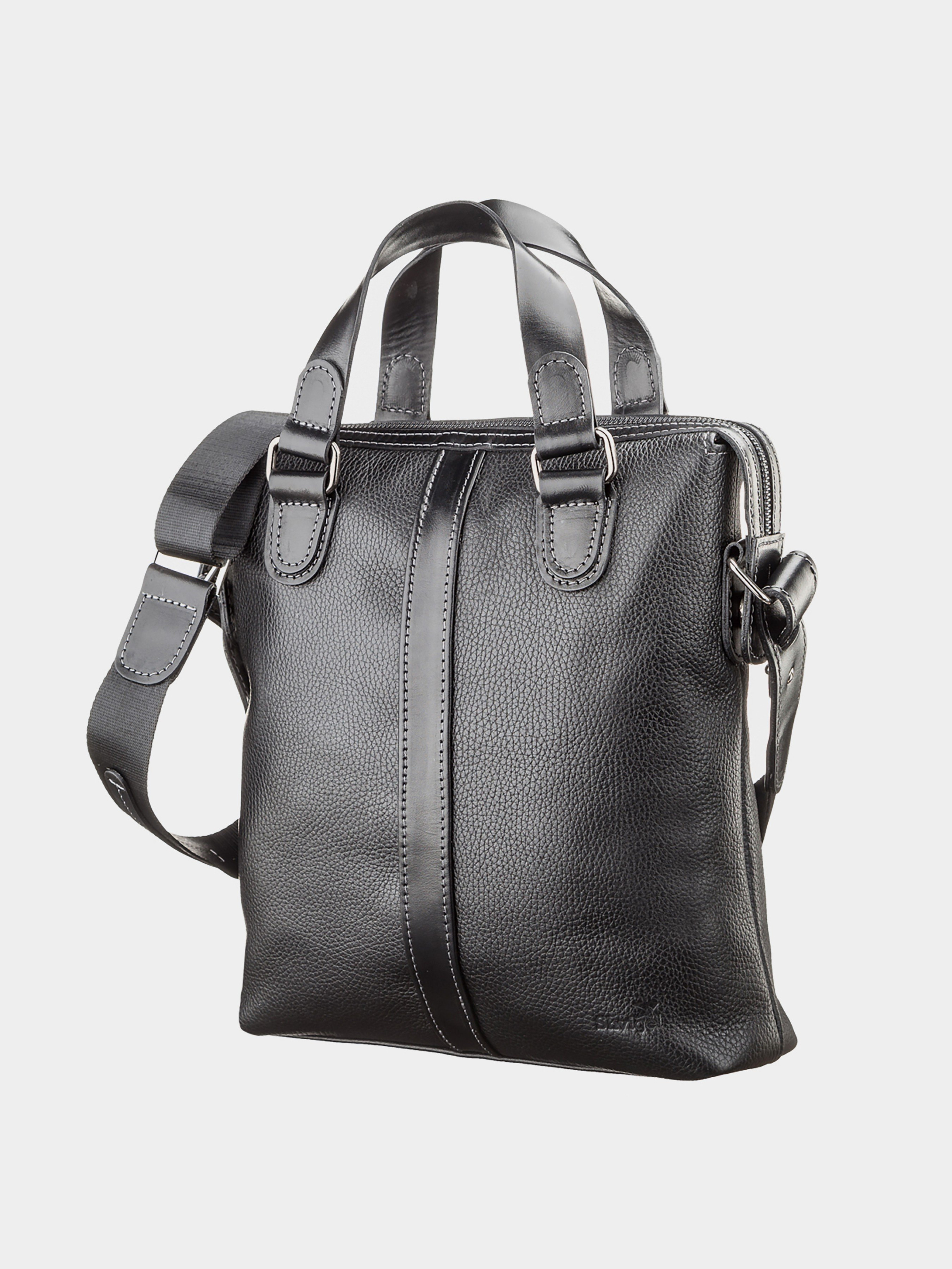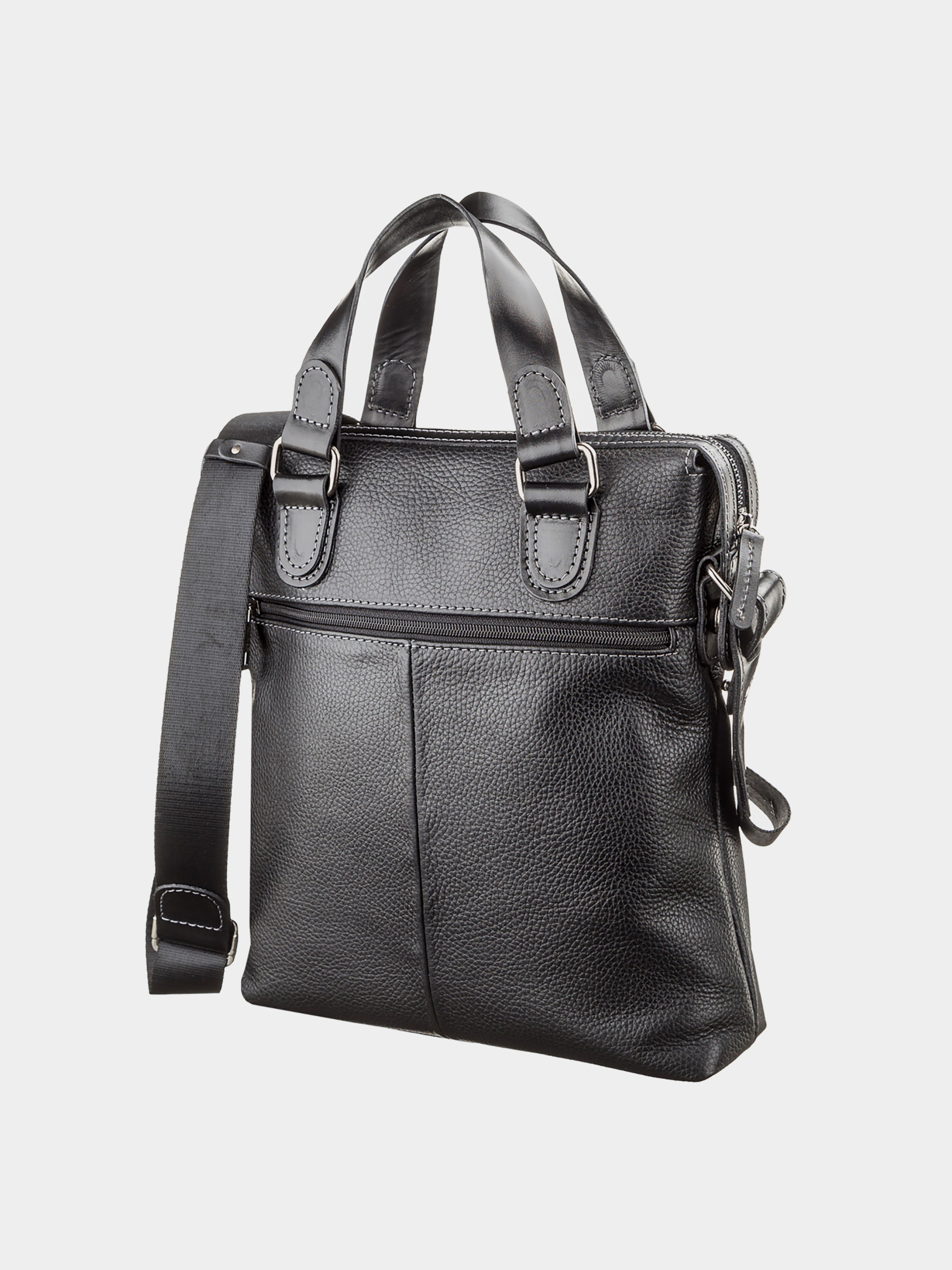 Материал: натуральная кожа; Размеры (ШхВхГ, см): 30х34х6; Цвет: черный; Страна производитель: Украина. Деловая современная сумка из натуральной зернистой кожи, с двумя кожаными ручками из гладкой кожи. Внутри: карман-перегородка на молнии, карман для телефона, отделения для ручек и мелочей, держатель для ключей, отделение с уплотненной перегородкой для планшета. Снаружи: на передней стенке - вертикальный карман на молнии, на задней стенке - карман на молнии. Подкладка выполнена из прочного материала, в наличии регулируемый плечевой ремень. Аксессуар упакован в пылезащитный чехол.