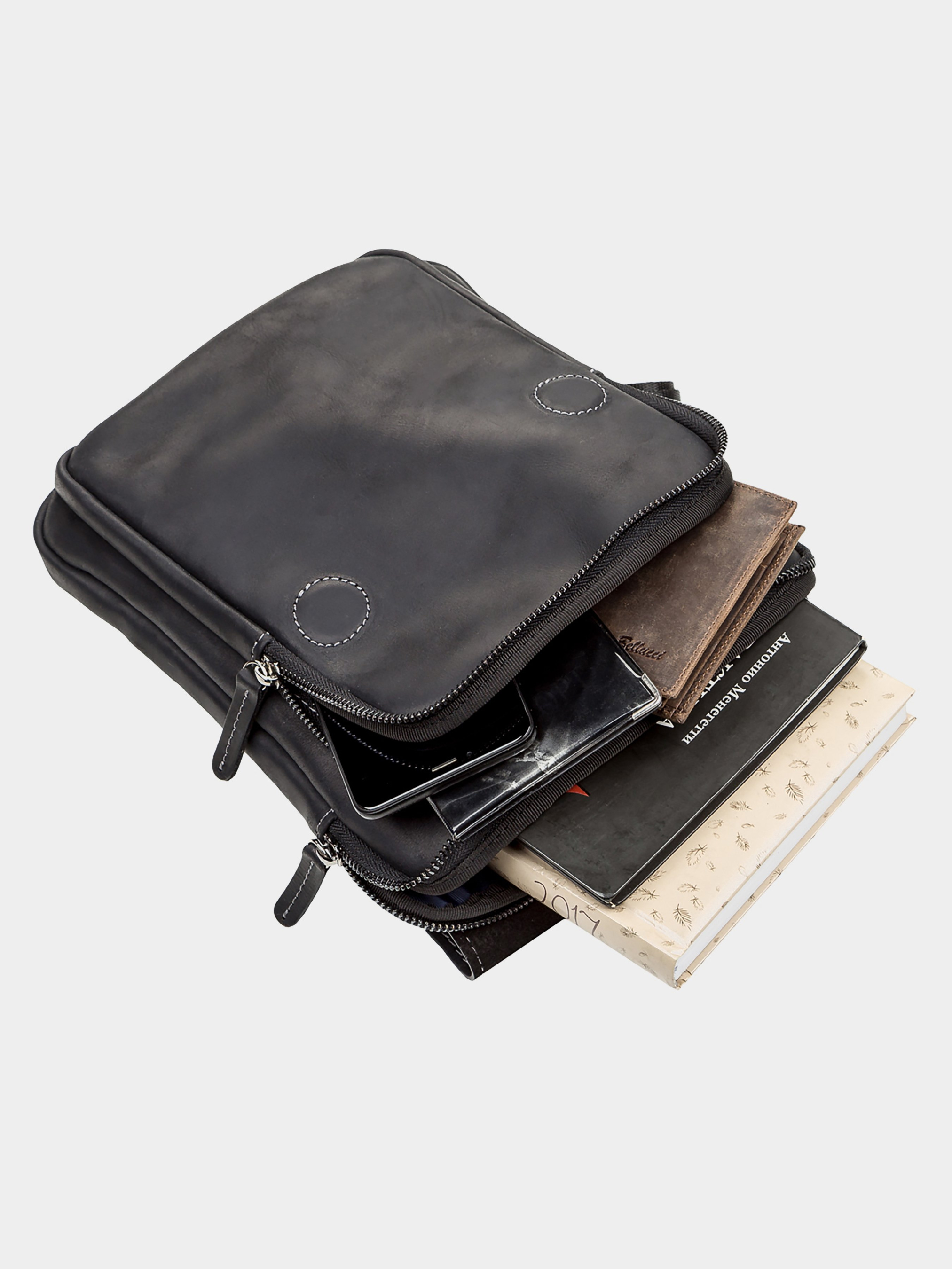 Материал: натуральная винтажная кожа; Размеры (ШхВхГ, см): 22х25х3.5; Цвет: черный; Страна производитель: Украина. Описание: - два автономных отделения; - карман-перегородка на молнии и боковой карман на молнии; -- внутренний боковой карман для телефона, ручек и других мелочей; - кожаный держатель для ключей, на кнопке; - цвет фурнитуры: темное серебро; - текстильный регулируемый ремень; - закрывается на молнию и клапаном на два магниты; - аксессуар упакован в пылезащитный чехол. Очень удобная мужская сумка-планшет, из натуральной винтажной кожи. Отличный подарок для стильного, современного мужчины.