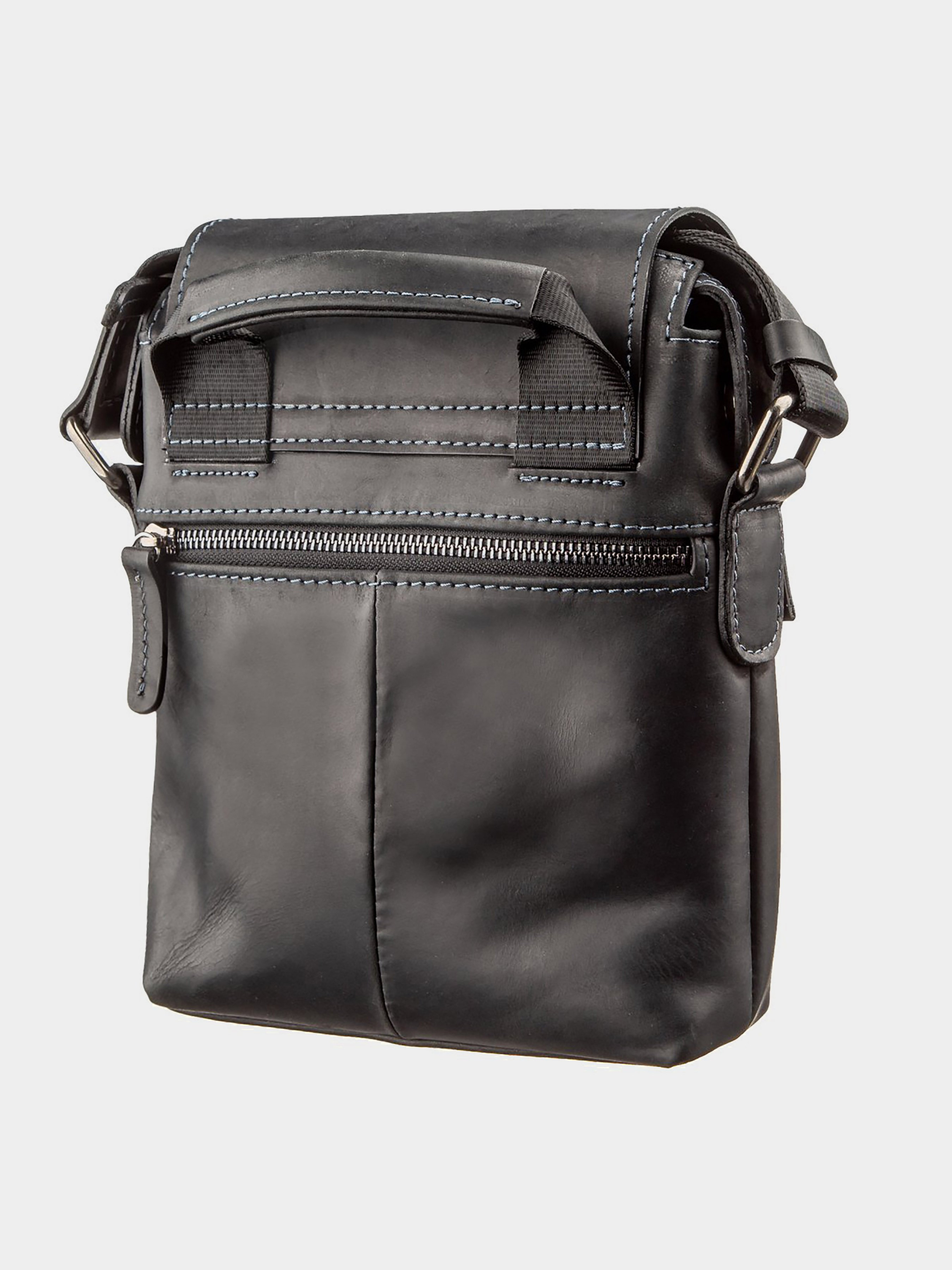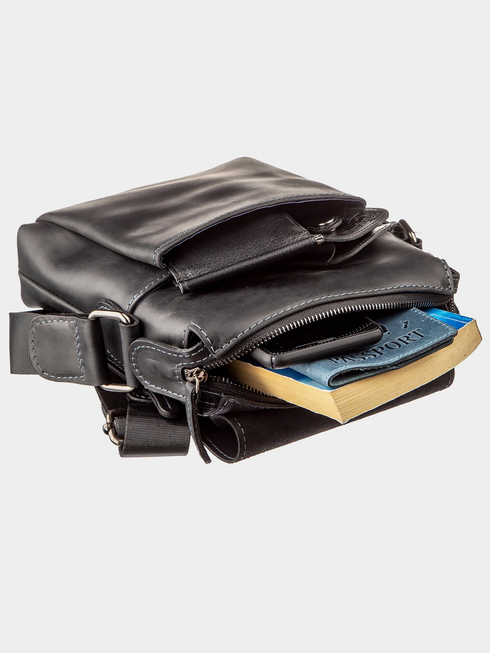 Материал: натуральная винтажная кожа; Размеры (ШхВхГ, см): 19х23х6; Цвет: черный; Страна производитель: Украина. Внутри: - 2 открытых накладных кармана для телефона; - уплотненное отделение с карманом-перегородкой на молнии; - потайной карман на молнии; - несъемный текстильный ремешок; - кожаная ручка для носки в руке; - открытый накладной карман под клапаном на лицевой стороне внутри которого петля для ключей; - карман на молнии на тыльной стороне. Мужская кожаная сумка небольшого размера с клапаном на закрытых магнитах. Аксессуар выполнен из натуральной винтажной кожи, характерными признаками которой, являются: неоднородность окраса и потертости, которые придают особенный внешний вид. Модель разработана специально для самых стильных мужчин. Внутри: разнообразные карманы для вашего удобства и синяя текстильная подкладка. Аксессуар прошит по краям светло-синей нитью, что добавляет модели особенного шика. Сумка упакована в тканевый чехол.