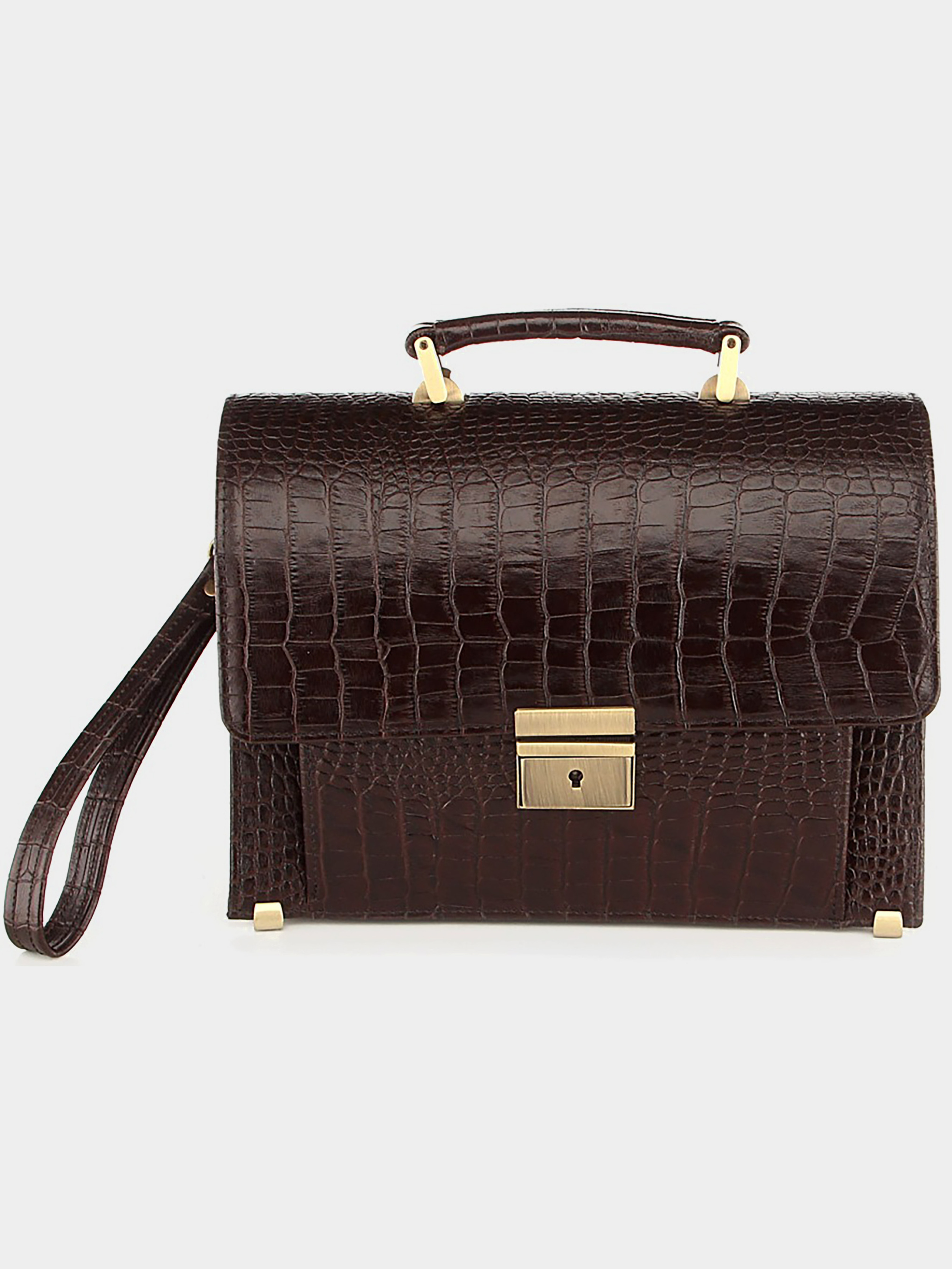 Материал: натуральная кожа (Фактура под крокодила). Цвет: темно-коричневый. Размеры: высота – 20 см; ширина – 27 см; глубина – 8-14 см. Страна производитель: Украина. Большая мужская барсетка с плечевым ремнем. Аксессуар выполнен из натуральной кожи с фактурой под крокодила коричневого цвета. Кроме как через плечо барсетку можно носить на запястье при помощи кожаного ремня-петли. Цвет фурнитуры желтый. На задней внешней стороне расположено отделение на молнии. Внутри: - три больших отделения; - два отделения-перегородки; - 4 кармана для пластиковых карточек или визиток; - под клапаном: накладной карман и отделение на молнии. Преимущества данной барсетки: Вместительность – барсетка имеет размеры больше среднего, что позволяет поместить в нее практически все, что нужно современному мужчине. Защищенность – на дне барсетки находятся металлические ножки, которые защищают аксессуар от механических повреждений. Функциональность – аксессуар имеет множество карманов и отделений, что позволяет максимально упорядочить содержимое барсетки.