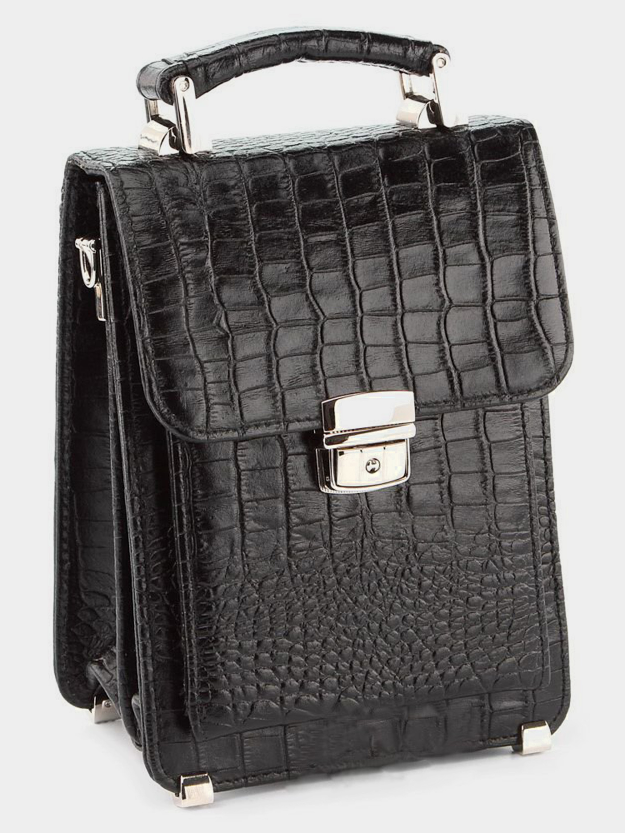 Материал: натуральная кожа (фактура под крокодила) Цвет: черный. Размеры: высота – 21 см; ширина – 16 см; глубина – 6-12 см. Страна производитель: Украина. Стильная, удобная и многофункциональная мужская барсетка. Аксессуар выполнен из кожи с фактурой под крокодила, изделия из которой очень популярны в этом году. Данную модель можно переносить в руке, на запястье, а также через плечо. Не мало важным аргументом для покупки данной барсетки является, то что ее можно закрывать на замок (ключ прилагается). Металлические ножки на дне защищают аксессуар от нежелательных царапин. Характеристики: - отделение на молнии на задней внешней стороне; - под клапаном: 11 отделений для пластиковых карточек, одно отделение под сеточкой, карман на молнии; - внутри: 2 больших отделения, отделение-перегородка на молнии. Такая кожаная барсетка - это стильный и главное нужный аксессуар. Она станет превосходным подарком мужчине, который предпочитает деловой стиль одежды.