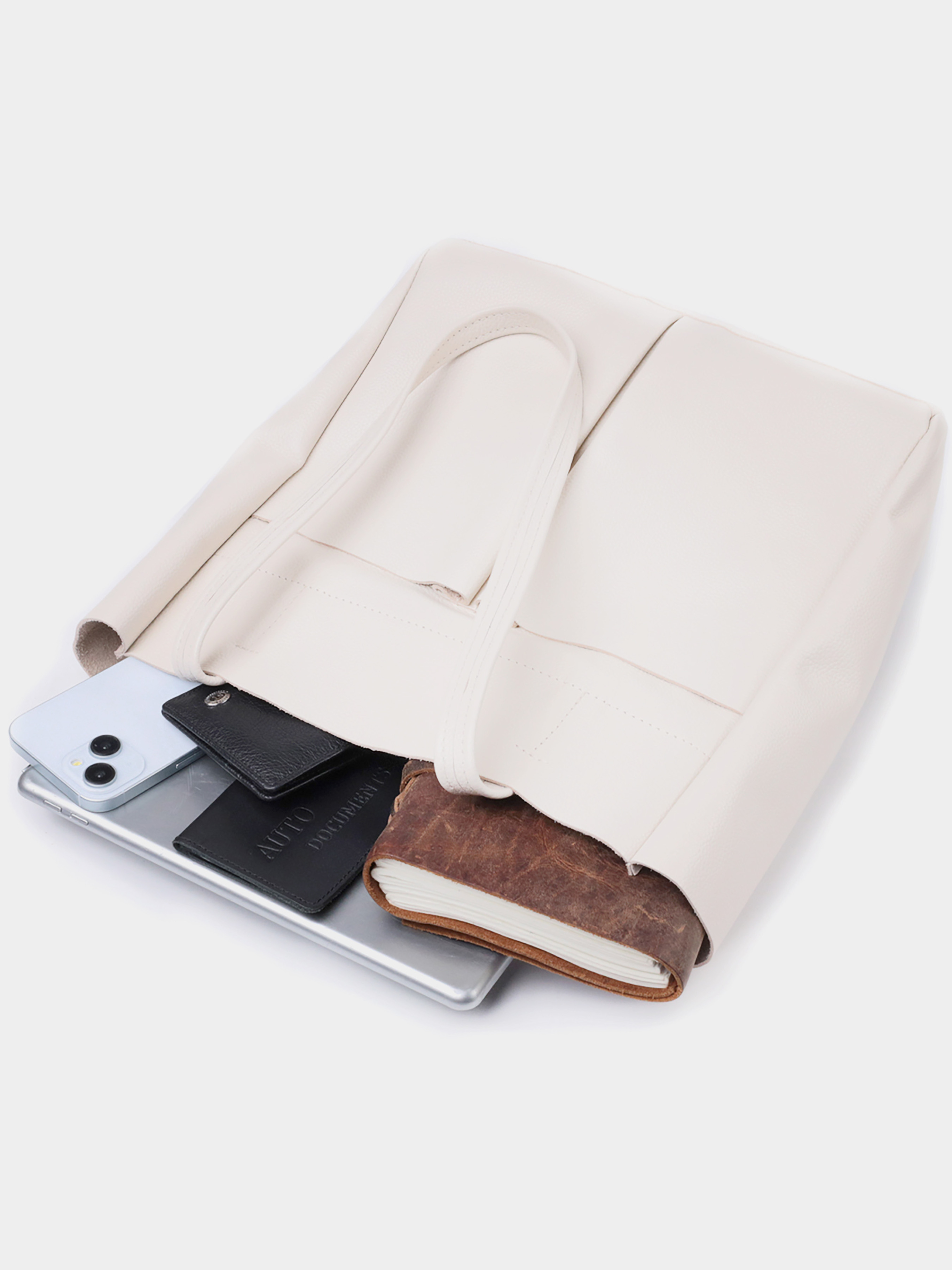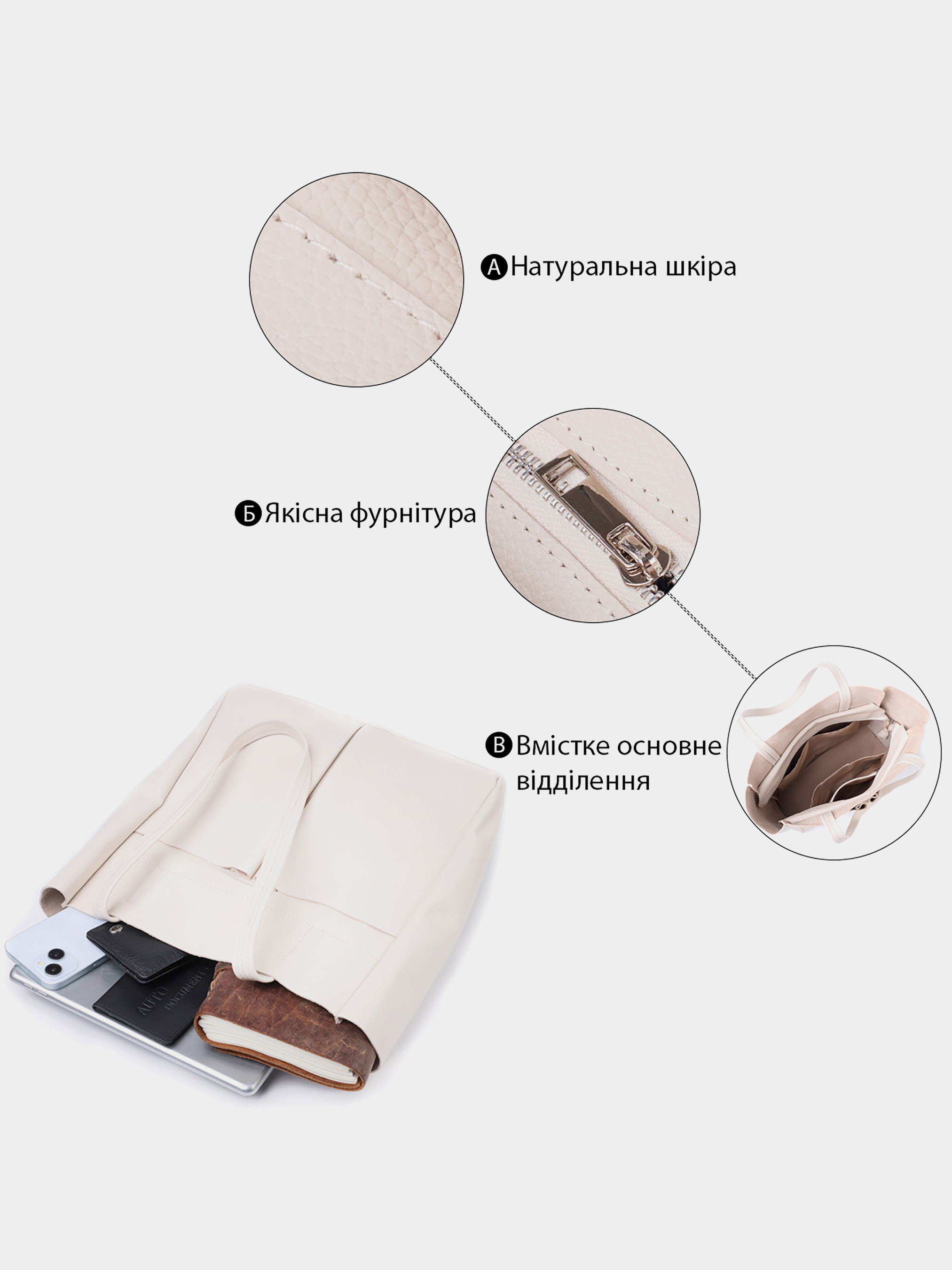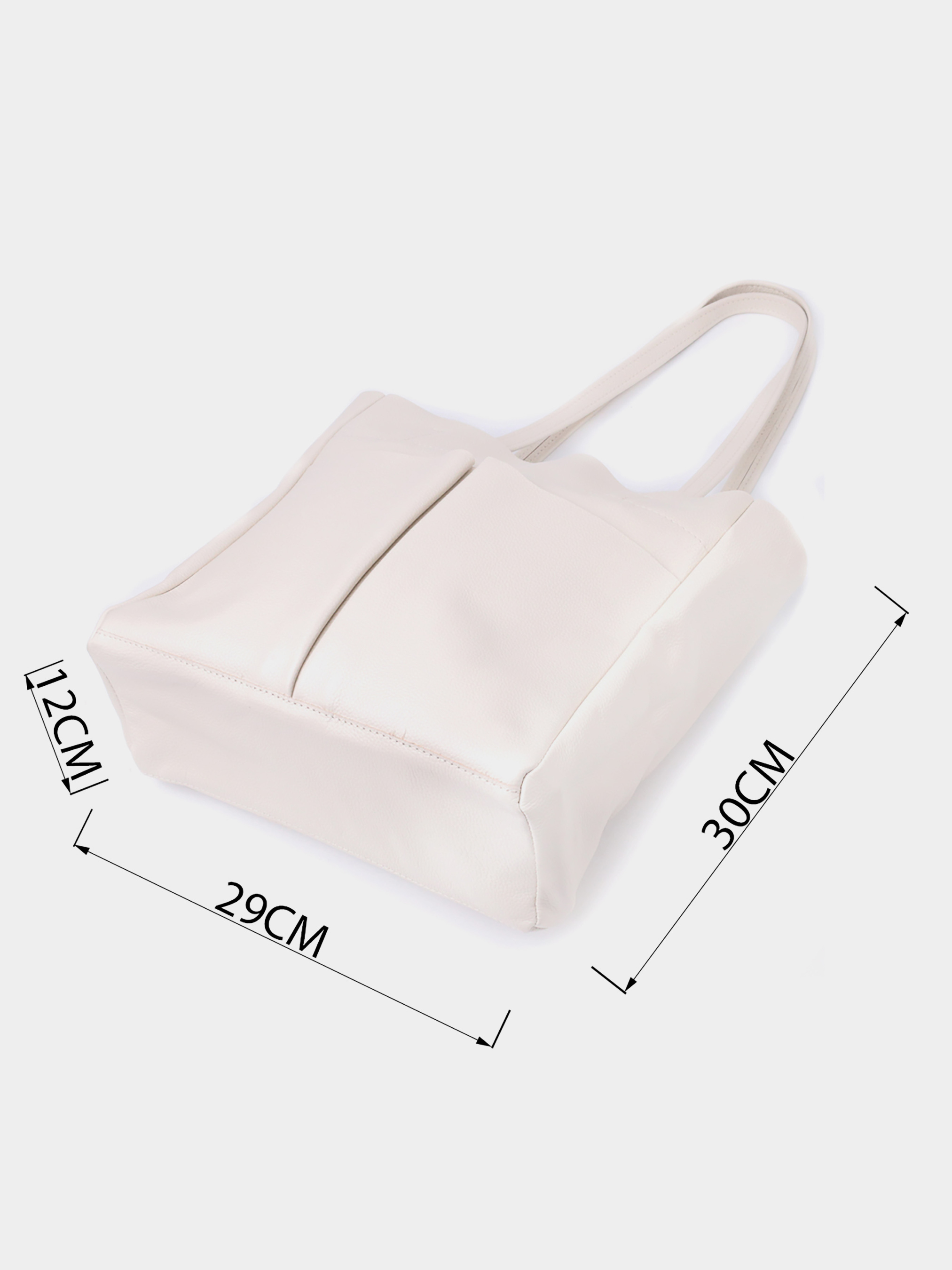 Материал: натуральная кожа; Цвет: бежевый; Размеры (ШхВхГ, см): 29х30х12 см; Страна производитель: Украина; Бренд: Shvigel. Описание: - одно большое отделение, что закрывается на молнию; - внутри потайной карман на молнии и три кармана открытого типа; - снаружи, на лицевой стороне, два больших вертикальных кармана открытого типа и горизонтальный карман на молнии, на тыльной стороне. - съемное уплотненное дно, которое можно извлечь; - две длинные добротные ручки. Идеальная женская сумка для тех, кто всегда носит с собой огромное количество вещей. Такую сумку можно спокойно носить на работу, в нее отлично помещаются все личные вещи а также папки с документами. Также такую модель удобно брать с собой в путешествия и выглядеть всегда стильным и элегантным. Цвет модели бежевый, фактура зернистая. Материал исполнения натуральная кожа с высокими показателями стойкости к износу. Для переноски используются две крепкие надежные ручки. Сумка имеет съемное уплотненное дно прямоугольной формы, для того, чтобы придать по желанию более четких форм аксессуару. Фурнитура серебряного цвета - стойкая не меняет свой цвет в процессе носки. Аксессуар отлично сочетается со всеми стилями в одежде и может стать отличным подарком на любой праздник.