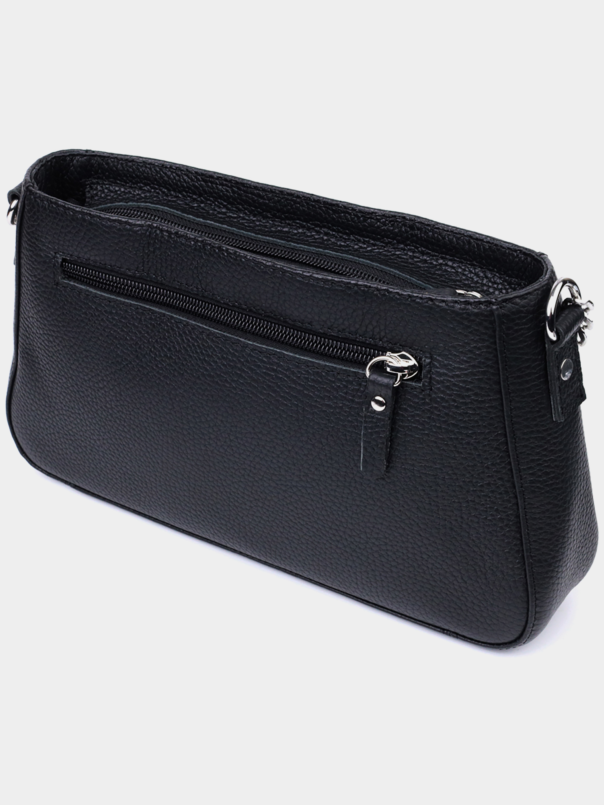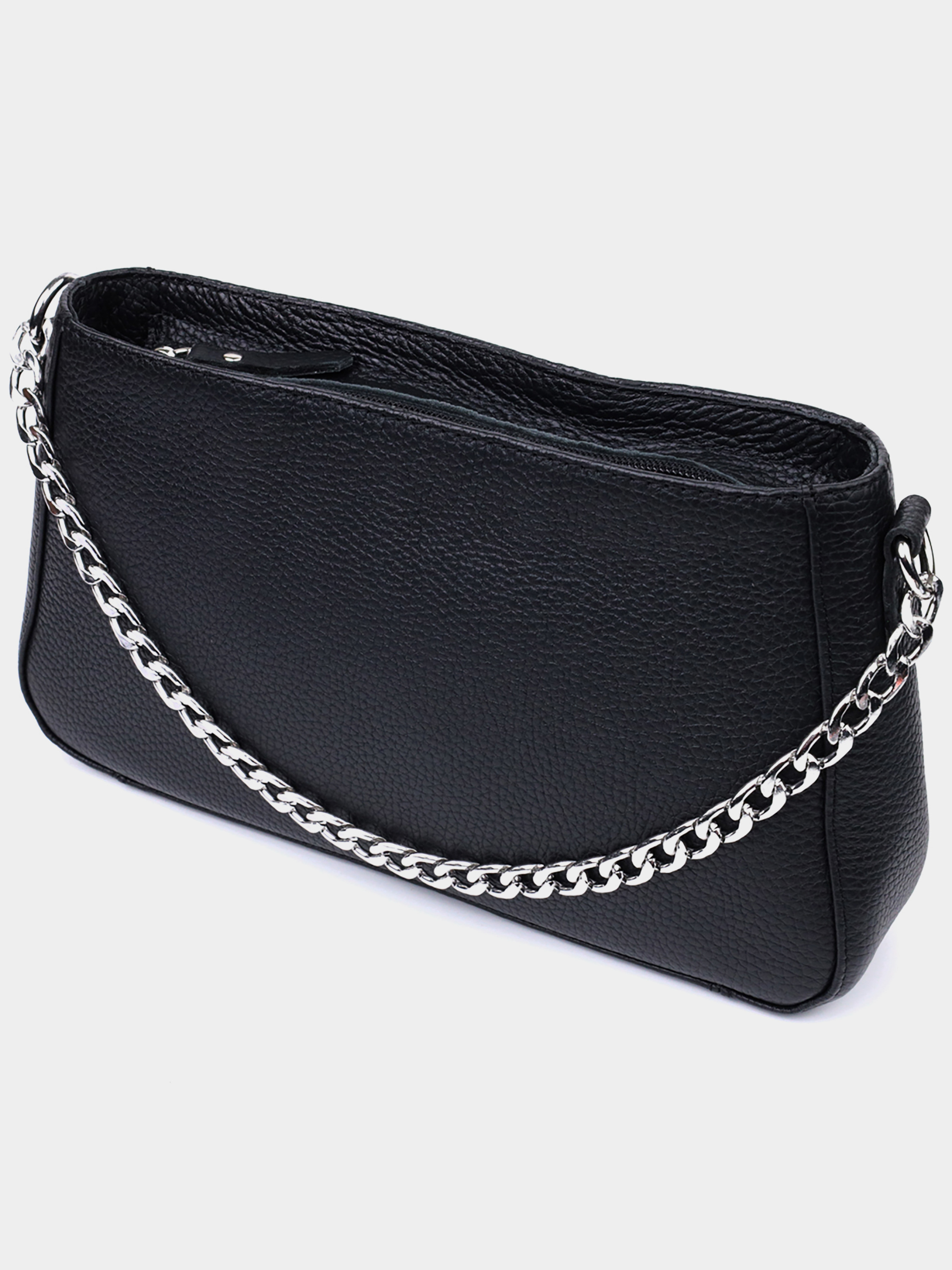 Материал: натуральная кожа; Цвет: черный; Размеры (ШхВхГ, см): 26,5х15х5,5 см; Страна производитель: Украина; Бренд: Shvigel. Описание: - закрывается на молнию; - внутри потайной карман на молнии и карман открытого типа; - съемный кожаный ремешок; - не съемный ремешок-цепочка. Представляем Вам трендовую сумку сезона, которая воплощает в себя элегантность и практичность. Такая сумка в модном мире имеет название - сумка багет. Цвет изделия классический черный, фактура зернистая не привередливая в уходе. Материал исполнения натуральная мягкая кожа с высокими показателями износостойкости. Отличный вариант как на каждый день, так и на вечер. Ремешок цепочка придает ей блеска и нотку утонченности. Данная модель не только привлекательна снаружи, но и продуманная внутри, расположение и количество внутренних карманов позволит качественно организовать пространство внутри, чтобы все вещи лежали на своих местах. Модель изготовлена из качественных материалов, имеет твердое дно и хорошо держит форму.
