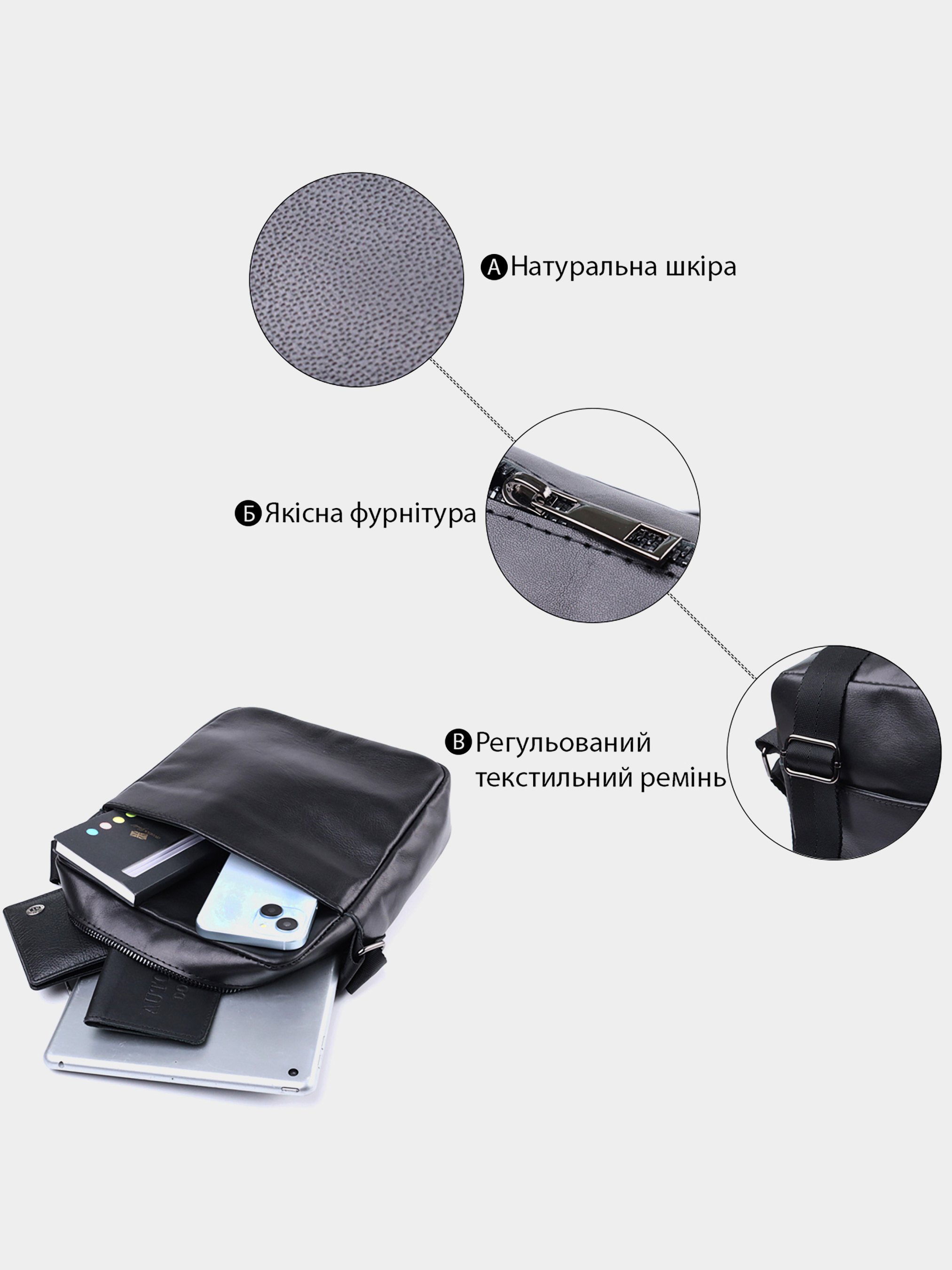 Материал: натуральная кожа; Цвет: черный; Размеры (ШхВхГ, см): 20х22,5х6 см; Страна производитель: Украина; Бренд: Shvigel. Особенности: - основное отделение, что закрывается молнией; - карман на молнии и карман открытого типа внутри; - два наружных кармана один на молнии, другой открытого типа; - текстильный несъемный регулируемый плечевой ремень; - подкладка из черной ткани. Практичная мужская сумка мессенджер в которую поместятся все ваши необходимые вещи. Фурнитура металлического цвета - стойкая не меняет свой цвет в процессе носки. Великолепная мужская сумка вертикального формата, изготовленная из натуральной гладкой кожи черного цвета. Аксессуар отлично сочетается со всеми стилями в одежде и может стать отличным подарком на любой праздник.