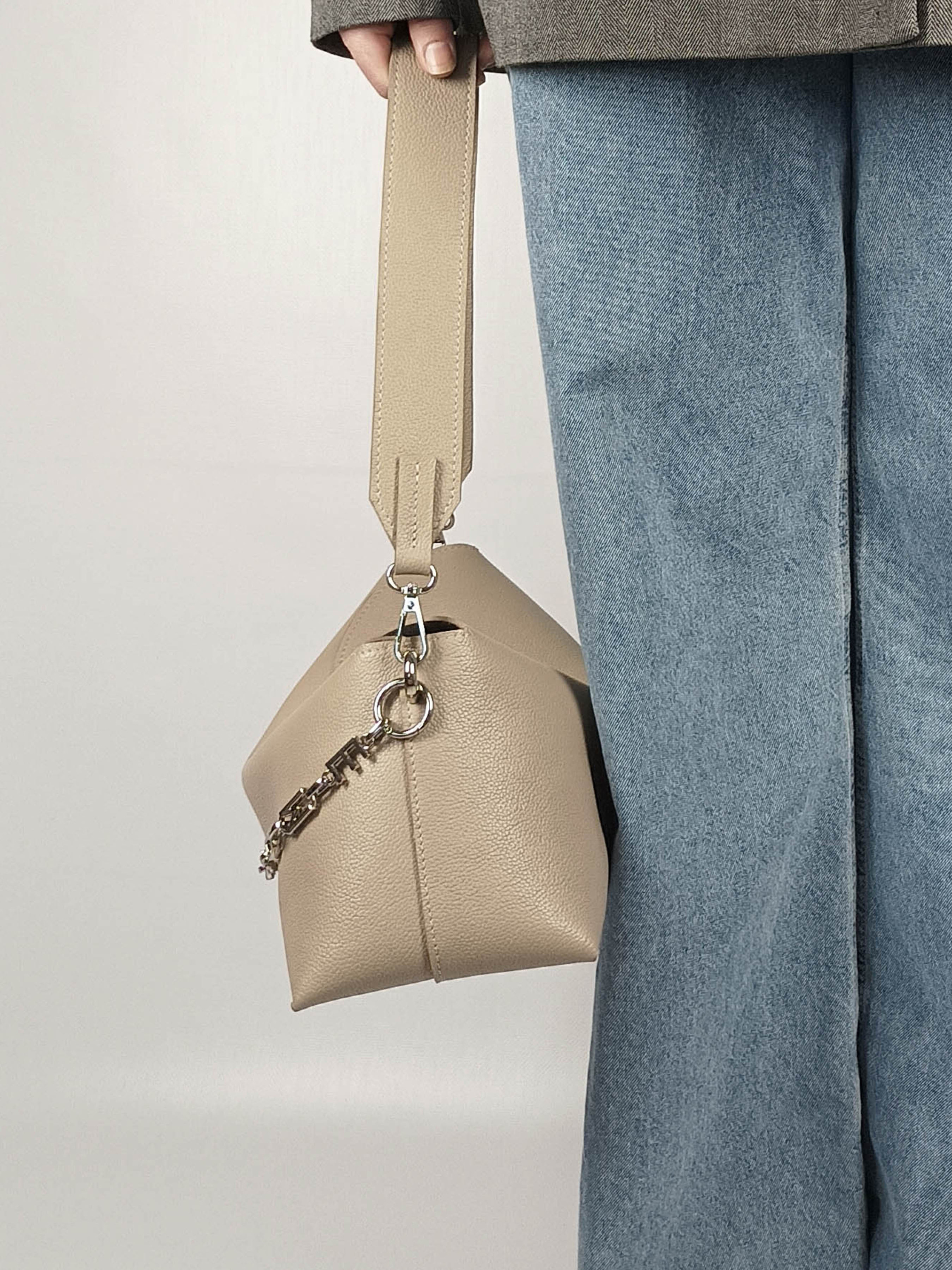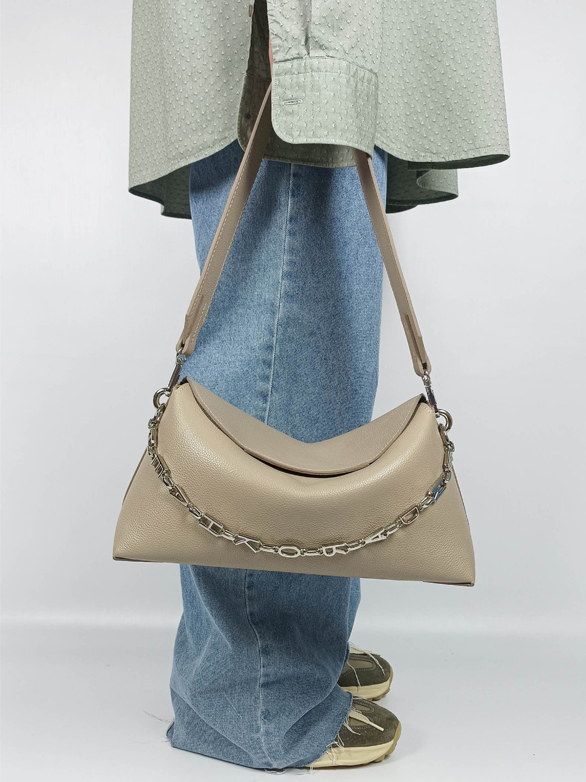 Сумка Deflection – Ваша новая любимая сумка. Универсальность и функциональность – ключевые элементы этой замечательной сумки. Можно носить разными способами на плече или в руках за широкую кожаную ручку. Имеет внутренний карман для телефона. Изготовлена из мягкой зернистой кожи, украшена контрастной замшевой подкладкой, застегивается на магнитную кнопку. Украшена цепочкой с ювелирным покрытием. Роскошная, вневременная и практичная, кожаная сумка “Deflection” – это Ваша любимая сумка! Мягкие материалы и линии определяют силуэт новых сумок. Изящное мастерство устанавливает баланс между свежестью, современностью и вневременным вкусом, подчеркивая минималистичный стиль и легкость, а также подчеркивая нейтральные цвета коллекции.