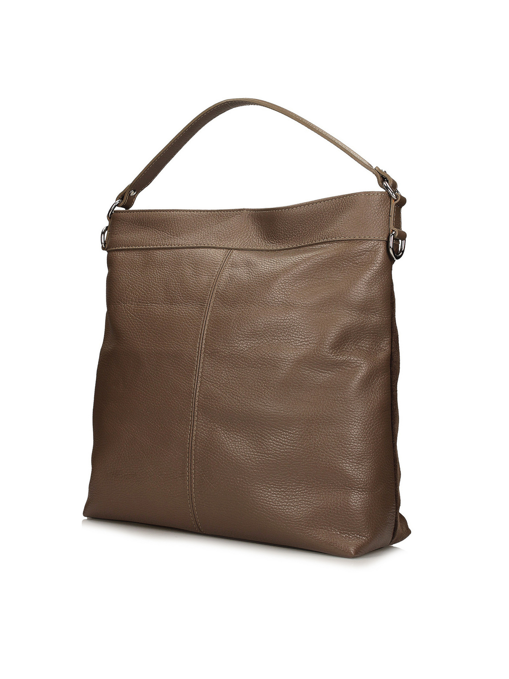 Темно-бежевая сумка итальянского бренда Toscanio сочетает комфорт и элегантность. Передняя часть сумки изготовлена из мягкой натуральной замши, а задняя – из высококачественной натуральной кожи с зернистой текстурой, что придает ей уникальный характер. Она закрывается на серебряную молнию, а внутренняя часть с тканевой подкладкой имеет одно просторное отделение и практичный карман. Благодаря своим размерам сумка легко помещает документы формата А4, что делает ее идеальной как для работы, так и для ежедневного использования. Ручки длиной 45 см обеспечивают удобное ношение на плече, а дополнительный регулируемый ремень из настоящей кожи (120 см) позволяет носить сумку через плечо. Нежный бежевый цвет в сочетании с контрастными текстурами делает эту модель универсальной, элегантной и очень практичной. ВЫСОТА 35 см ШИРИНА 36 см Глубина 12 см ДЛИНА УХА 45 см ДЛИНА РЕМЕШКА 120 см