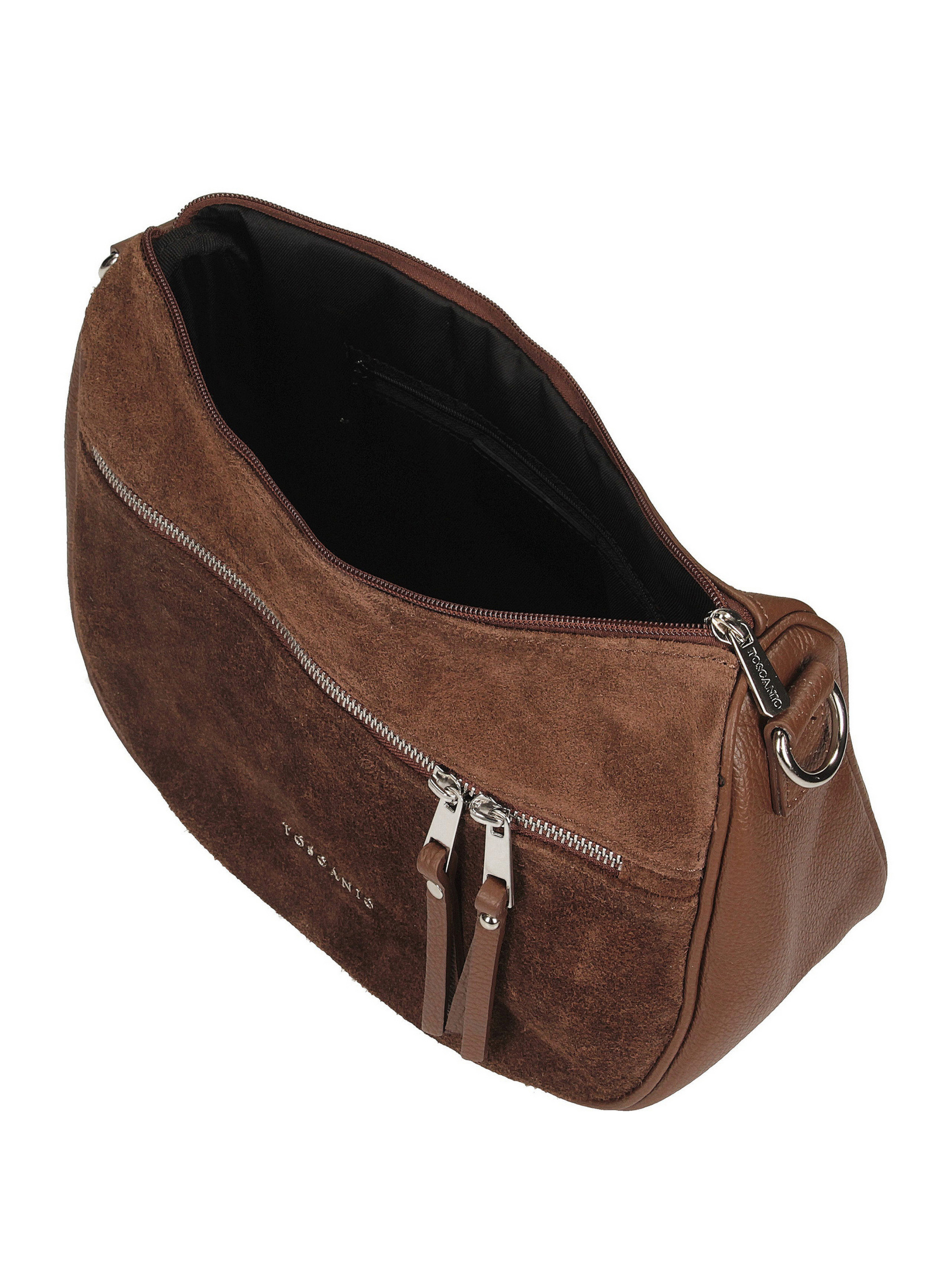 Коричневая сумка кросс-боди итальянского бренда TOSCANIO – стильный аксессуар, сочетающий в себе классический стиль с модным акцентом. Модель изготовлена из высококачественной натуральной кожи и замши, она выглядит элегантно и в то же время современно. Удобные размеры сумки (20 x 30 x 12 см) делают ее практичной для ежедневного использования. Одно просторное отделение и внутренний карман позволяют организовать ваши вещи, а вся сумка закрывается на серебряную металлическую молнию. Кожаный ремешок длиной 120 см обеспечивает комфортное ношение как через плечо, так и через тело. Это делает кросс-боди идеальным вариантом для городской одежды, придавая ей характер и функциональность.