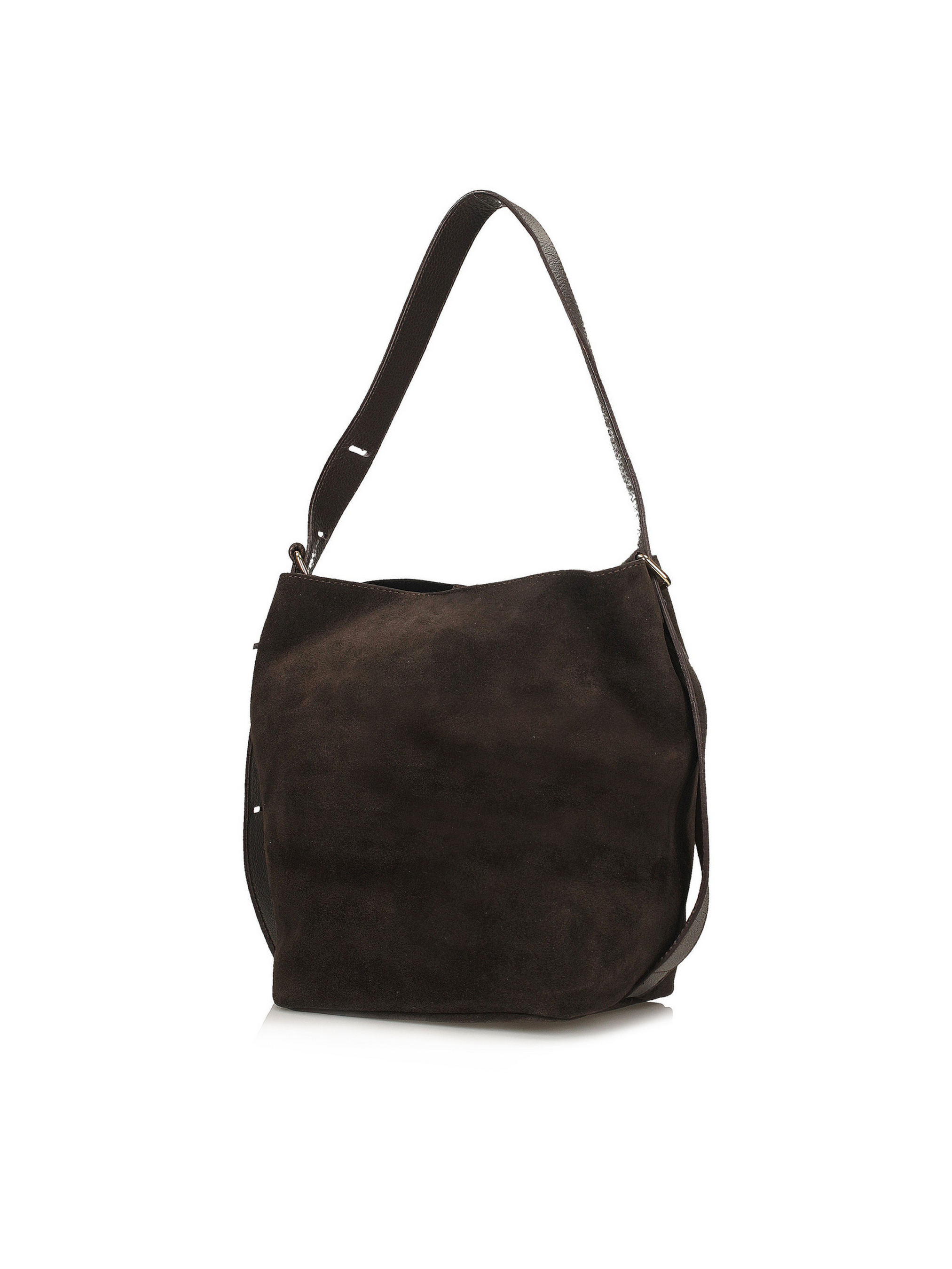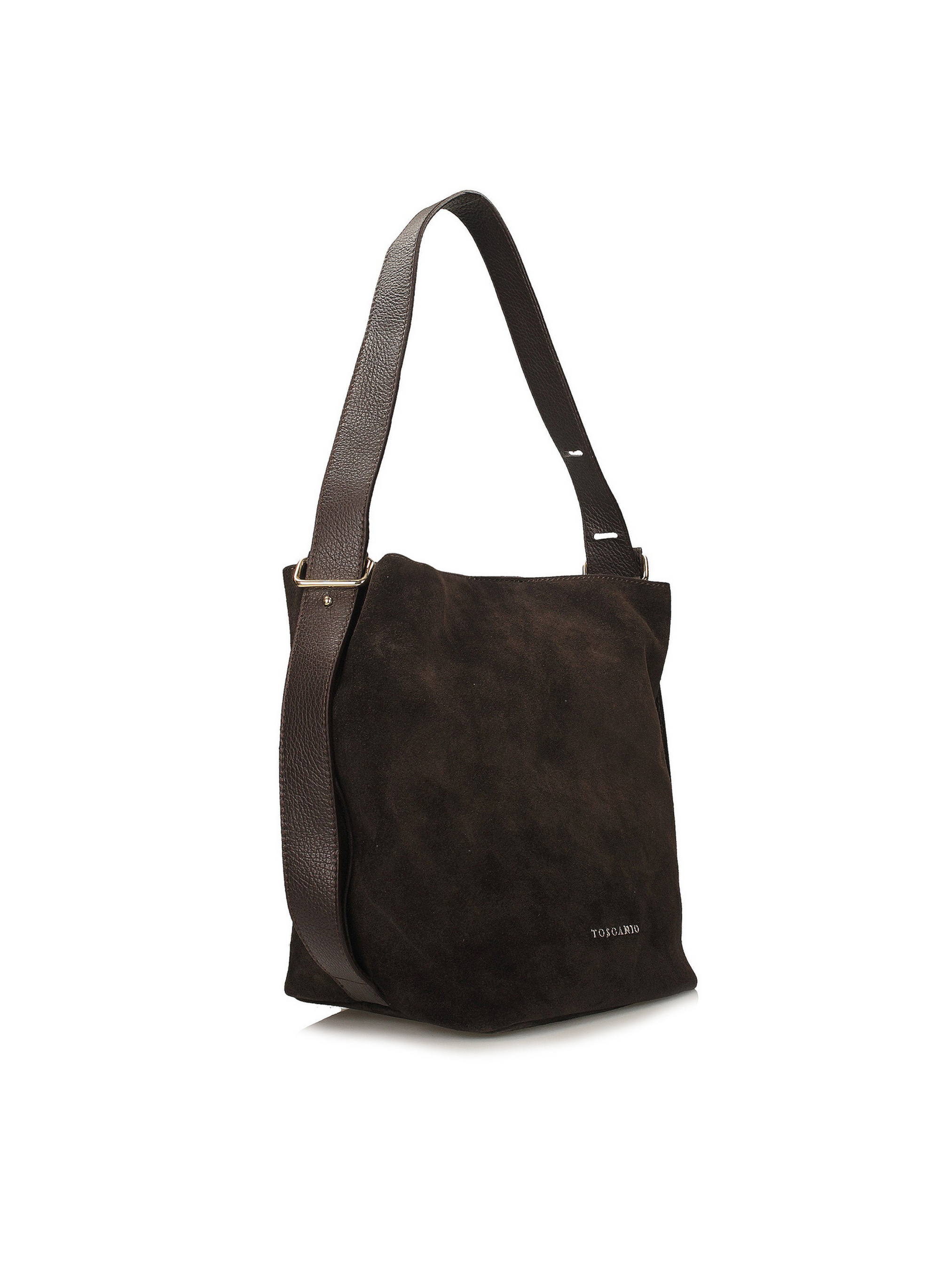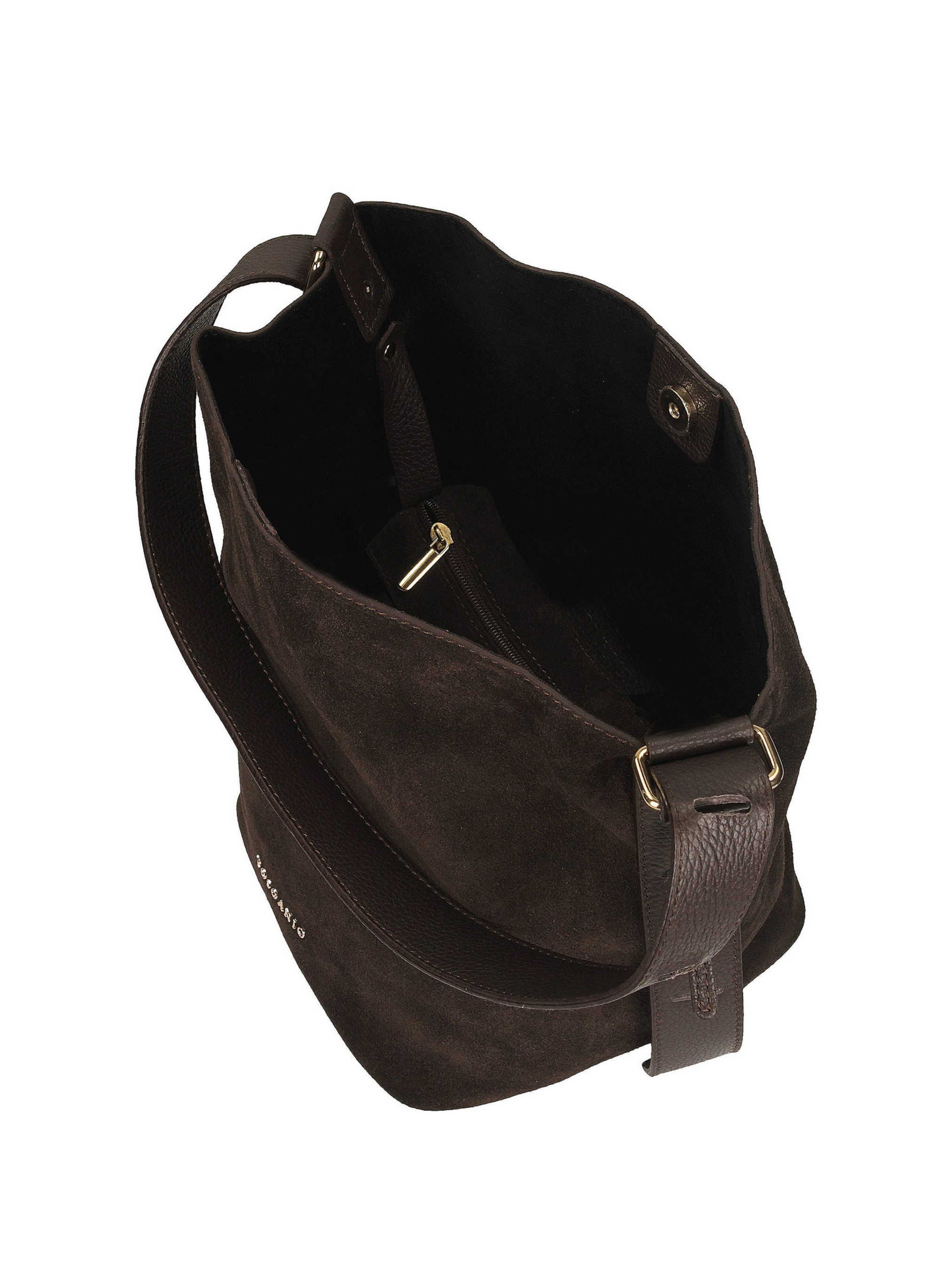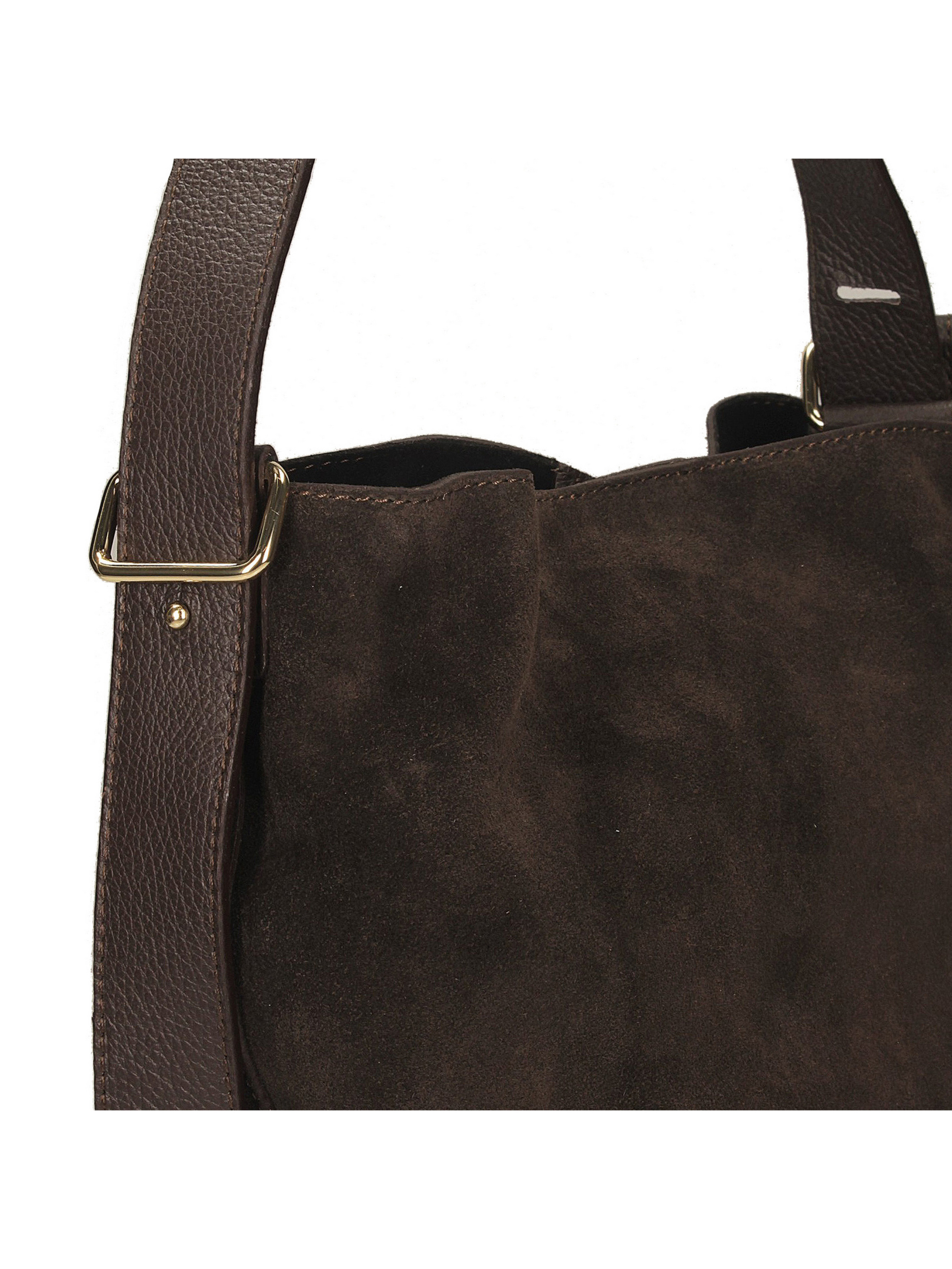 Темно-коричневая сумка-ведро итальянского бренда Toscanio – это стильная и удобная модель, изготовленная из мягкой натуральной замшевой кожи, что придает ей естественную элегантность. Ее простая, слегка свободная форма делает ее очень практичной и комфортной для ежедневного ношения. Она закрывается на золотистый магнит, обеспечивающий быстрый доступ к внутренней части, украшенной тканевой подкладкой. Сумка имеет одно просторное отделение и дополнительный внутренний карман для мелких предметов. Ремешок из натуральной кожи длиной 75 см позволяет комфортно и обыденно носить ее на плече. Темный оттенок коричневого и замшевая текстура кожи делает эту сумку идеальным дополнением как к повседневным, так и к более элегантным образам. ВЫСОТА 30 см ШИРИНА 33 см Глубина 19 см