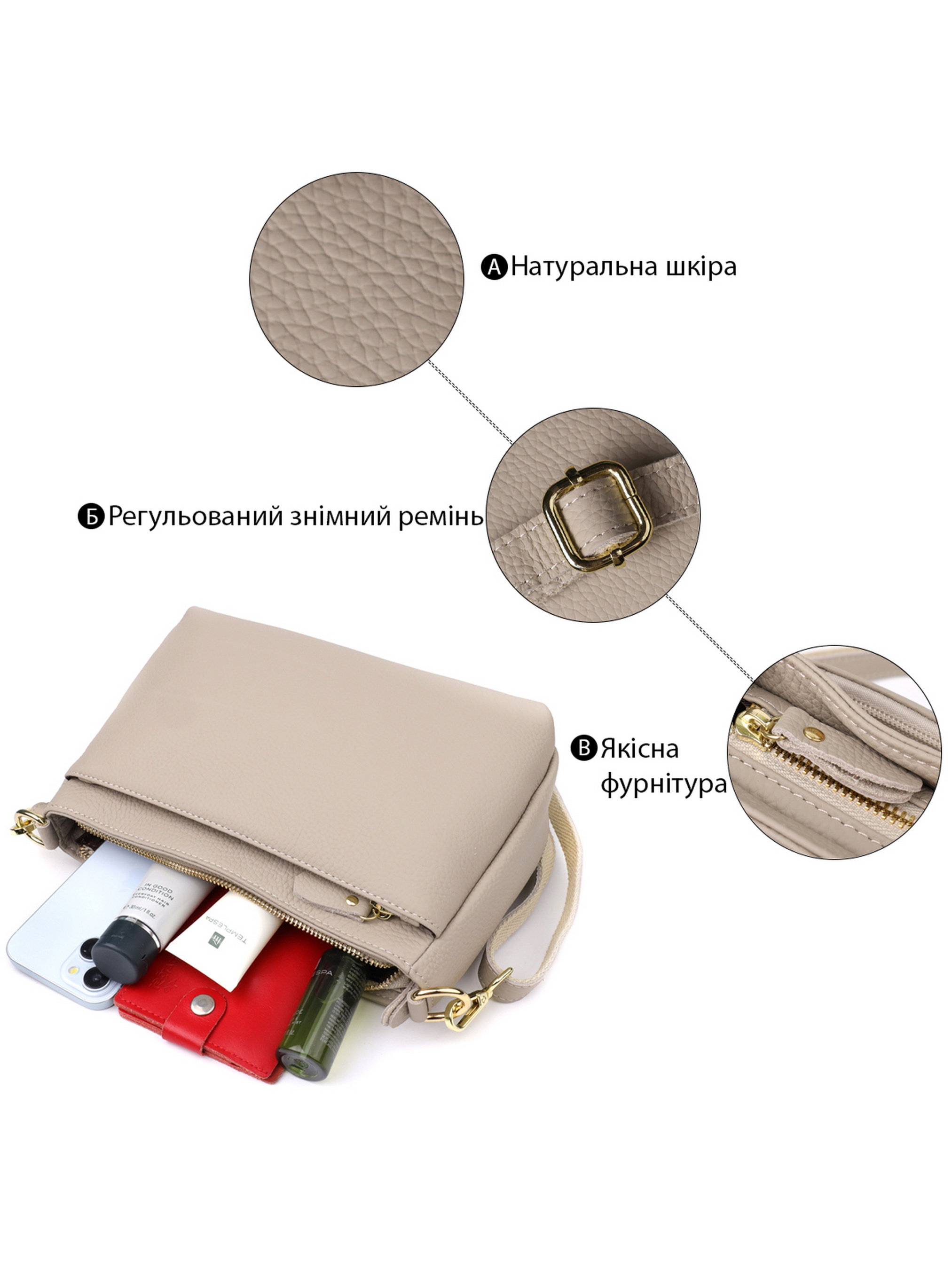 Цвет: серый; Материал: натуральная кожа; Размер (ШхВхГ, см): 27х16х11см; Длина ремешка: 130 см (регулируется в меньшую сторону); Страна производитель: Китай; Бренд: Vintage. Особенности: - 1 основное отделение, что закрывается на молнию; - внутри: потайной карман на молнии и карман-перегородка на молнии; - два кармана на молниях с лицевой и тыльной стороны; - цвет фурнитуры под желтое золото; - съемный кожаный ремешок. Женская кожаная сумка серого цвета с формоустойчивым дном - современная классика и практичность в одном аксессуаре. Эта стильная модель выполнена из натуральной кожи благородного серого оттенка, который универсален и элегантен. Серый цвет легко сочетается с любой одеждой, придавая образу сдержанность и утонченность, что делает сумку отличным выбором для делового и повседневного стиля. Формоустойчивое дно обеспечивает сохранение чёткой формы сумки, позволяя ей выглядеть аккуратно и презентабельно даже при активном использовании. Три основных отделения, каждое из которых закрывается на молнию, создают удобное и безопасное пространство для хранения всех необходимых вещей. Внутри центрального отделения находятся два кармана потайной на молнии и открытый для удобного хранения мелочей и гаджетов. Сумка оснащена одним съёмным кожаным ремешком, который можно носить на плече или через плечо, делая аксессуар максимально универсальным и комфортным. Фурнитура выполнена в тёплом цвете жёлтого золота, добавляющем контраст и изысканность к сдержанному серому оттенку кожи. Эта серая кожаная сумка с формоустойчивым дном - отличный выбор для тех, кто ценит стиль, качество и функциональность в повседневных аксессуарах.