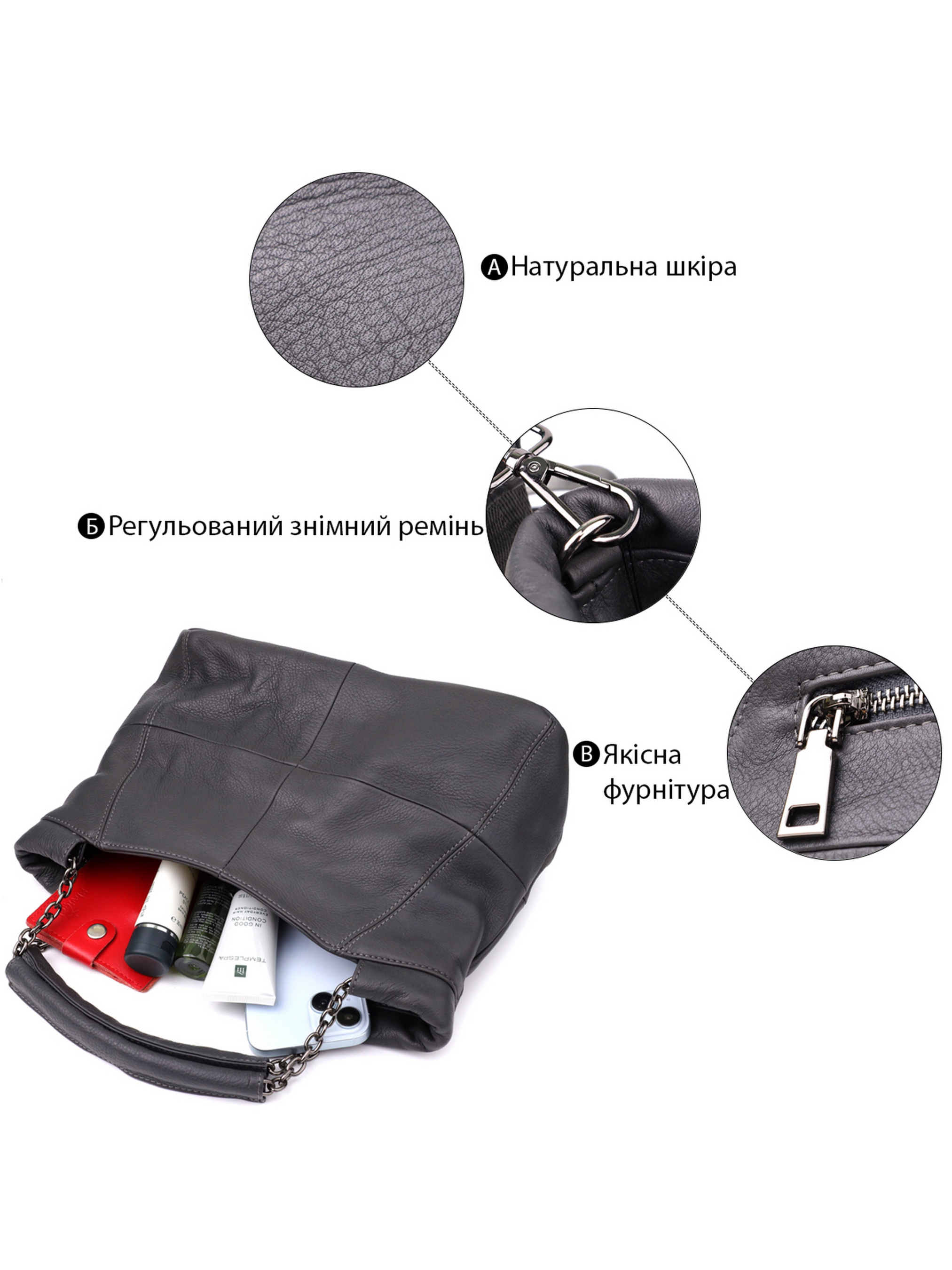 Цвет: серый; Материал: натуральная кожа; Размер (ШхВхГ, см): 29,5х22х13,5см; Длина ремешка: 118 см (регулируется в меньшую сторону); Страна производитель: Китай; Бренд: Vintage. Особенности: - 1 основное отделение, что закрывается на молнию; - внутри: потайной карман на молнии, карман-перегородка на молнии и два кармана открытого типа; - 1 карман на молнии с тыльной стороны; - цвет фурнитуры под серебро; - съемный кожаный ремешок. Женская кожаная сумка серого цвета - сочетание элегантности и практичности. Изготовленная из натуральной кожи высокого качества, эта сумка отличается благородным серым оттенком, который легко вписывается в любой гардероб и подходит для самых разных образов от делового до повседневного. Компактные размеры делают модель удобной и функциональной, позволяя носить все необходимые вещи под рукой. Сумка оснащена одним основным отделением, которое закрывается на надёжную молнию, обеспечивая безопасность содержимого. Внутри предусмотрены сразу несколько удобных карманов: потайной на молнии, карман-перегородка на молнии и два открытых кармана идеальное решение для хранения телефона, ключей, косметики и других мелочей. На тыльной стороне расположен дополнительный карман на молнии, обеспечивающий быстрый доступ к важным предметам. Для комфорта в носке предусмотрен съёмный кожаный ремешок длиной 118 см, который можно регулировать по длине, выбирая оптимальный вариант ношения на плече или через плечо. Фурнитура выполнена в цвете серебра, что гармонично дополняет сдержанный серый тон кожи и придаёт сумке современный и стильный вид. Эта сумка от бренда Vintage отличный выбор для женщин, ценящих качество, функциональность и элегантность в повседневных аксессуарах.
