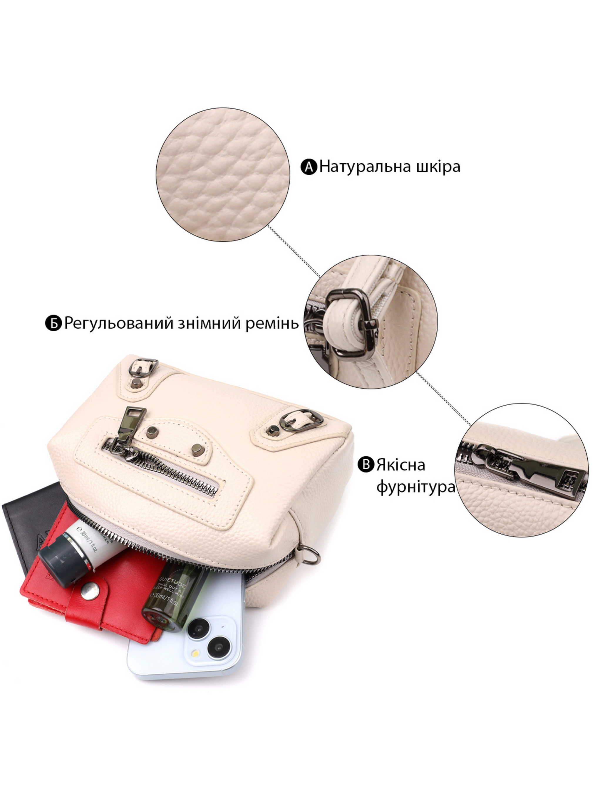 Цвет: белый; Материал: натуральная кожа; Размер (ШхВхГ, см): 17х11х8см; Длина ремешка: 145 см (регулируется в меньшую сторону ); Страна производитель: Китай; Бренд: Vintage. Особенности: - 1 основное отделение, что закрывается на молнию; - внутри: потайной карман на молнии и карман открытого типа; - 1 карман на молнии на лицевой стороне; - фурнитура цвета темного серебра; - съемный ремень. Небольшая женская кожаная сумка в белом цвете с декоративной фурнитурой - эффектный акцент с характером. Сумка выполнена из натуральной кожи в универсальном и выразительном белом цвете, который делает образ светлым, свежим и актуальным. Декоративные элементы играют ключевую роль в дизайне: металлические заклепки, ремешки и фигурная строчка на лицевой стороне придают аксессуару современный, слегка дерзкий вид. Модель оснащена внешним карманом на молнии, оформленным декоративными деталями, а также основным отделением с надежной молнией. Внутри - потайной карман на молнии и карман открытого типа для мелочей. Фурнитура цвета темного серебра элегантно контрастирует с белой кожей, подчеркивая геометрию и динамику формы. Удобный съемный ремень позволяет носить сумку через плечо или на плече. Идеальный выбор для тех, кто ценит смелые акценты и практичный формат - белая кожаная сумка с декоративной отделкой станет выразительной деталью в любом образе, от casual до городского шика.