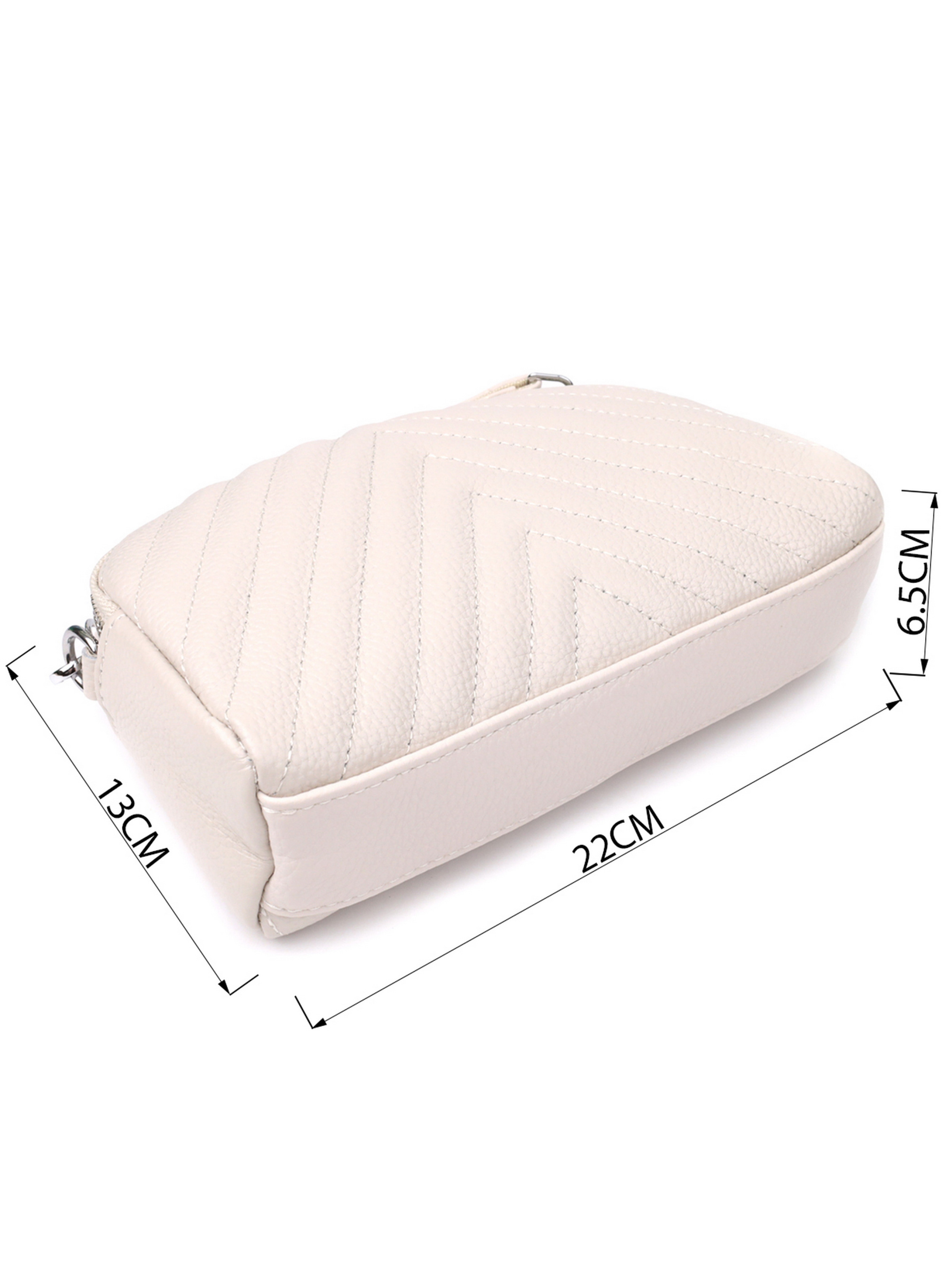 Цвет: белый; Материал: натуральная кожа; Размер (ШхВхГ, см): 22х13х6,5 см; Длина ремешка: 130 см (регулируется в меньшую сторону ); Страна производитель: Китай; Бренд: Vintage. Особенности: - 2 основных отделения, что закрываются на молнию; - внутри: потайной карман на молнии и карман открытого типа; - фурнитура цвета серебра; - съемный кожаный ремень. Элегантная белая кожаная сумка с декоративной прострочкой в виде треугольников - это сочетание современного стиля, изысканности и функциональности. Геометрическая строчка придаёт модели выразительный характер, подчёркивая структуру и качество натуральной кожи. Белоснежный оттенок делает сумку универсальной и освежающей, идеально подходящей как для повседневных, так и для более нарядных образов. Модель оснащена двумя основными отделениями, которые закрываются на молнию, позволяя удобно распределить вещи и обеспечить порядок. Внутри находится потайной карман на молнии для ценных предметов, и открытый карман для мелочей, которые всегда должны быть под рукой. Серебристая фурнитура подчёркивает чистоту и свежесть белого цвета, добавляя аксессуару благородного блеска. В комплект входит съёмный кожаный ремень, с помощью которого сумку можно носить на плече или через плечо, адаптируя её под образ и ситуацию. Белая кожаная сумка с треугольной прострочкой - это безупречный выбор для тех, кто ценит лёгкость, стиль и внимание к деталям.
