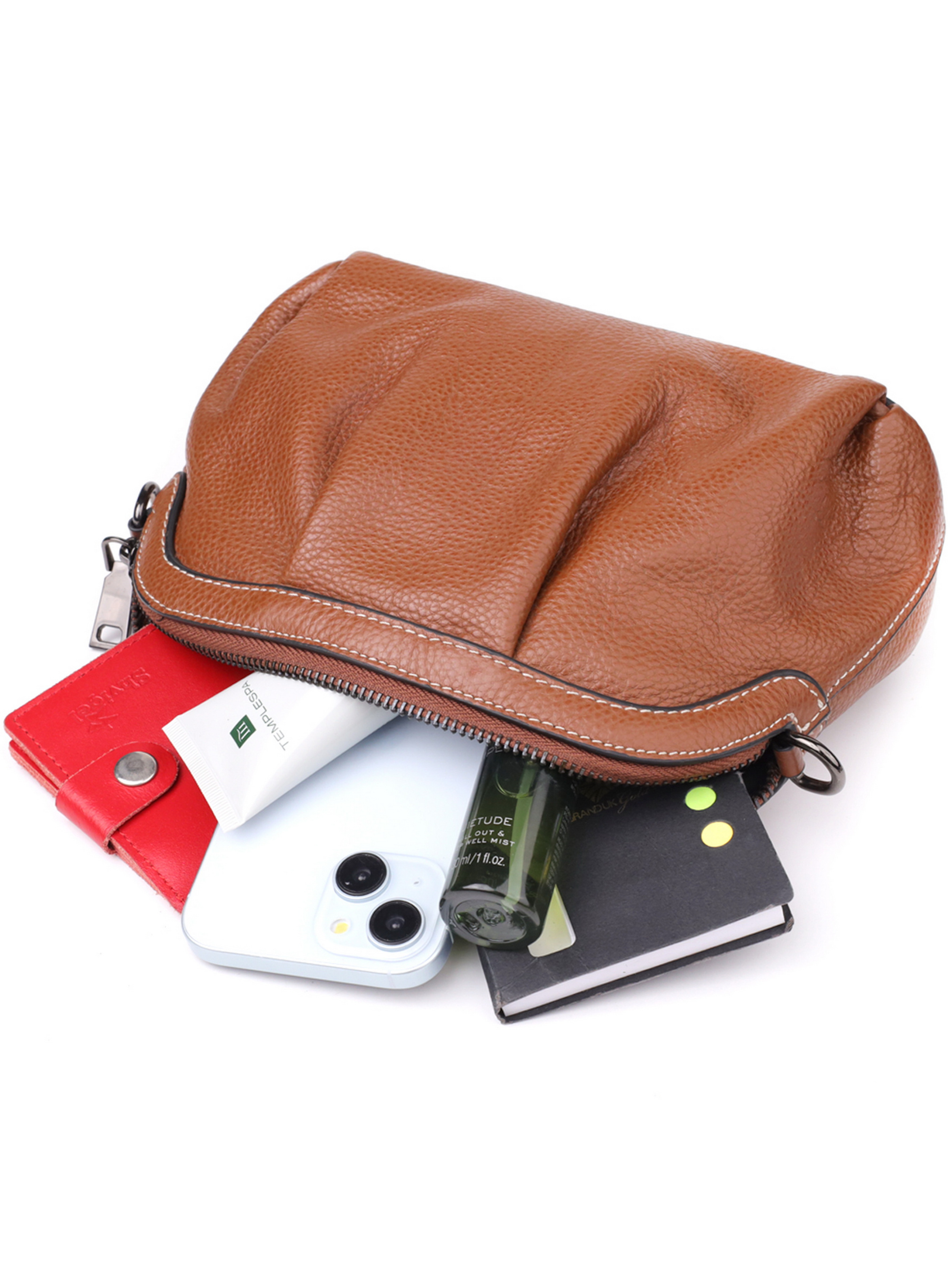 Цвет: коричневый; Материал: натуральная кожа; Размер (ШхВхГ, см): 23х15х7см; Длина короткого ремешка: 53 см; Длина длинного ремешка: 140 см (регулируется в меньшую сторону); Страна производитель: Китай; Бренд: Vintage. Особенности: - 1 основное отделение, что закрывается на молнию; - внутри: потайной карман на молнии, карман открытого типа и карман-перегородка на молнии; - по краям прошита элегантной белой строчкой; - фурнитура цвета темного серебра; - съемные 2 кожаных ремешка. Эта изысканная кожаная сумка с элегантной драпировкой - воплощение стиля, женственности и продуманной функциональности. Мягкие складки на лицевой части изделия придают объём и визуальную лёгкость, подчёркивая изящный силуэт и утонченную фактуру натуральной кожи. Сумка оснащена одним основным отделением, которое закрывается на молнию. Внутри практичное наполнение: потайной карман на молнии, карман открытого типа и дополнительный карман-перегородка на молнии, который удобно делит пространство на два отсека, позволяя организовать вещи с максимальным комфортом. Изделие украшено аккуратной белой строчкой по краям, добавляющей изысканности и подчёркивающей внимание к деталям. Фурнитура в оттенке тёмного серебра гармонично завершает образ, придавая аксессуару сдержанный блеск. В комплект входят два съёмных кожаных ремешка, благодаря которым сумку можно носить на плече, через плечо или в руке так, как удобно именно вам. Кожаная сумка с драпировкой станет стильным акцентом вашего образа, добавляя нотки утончённости как в повседневный, так и в более нарядный гардероб.