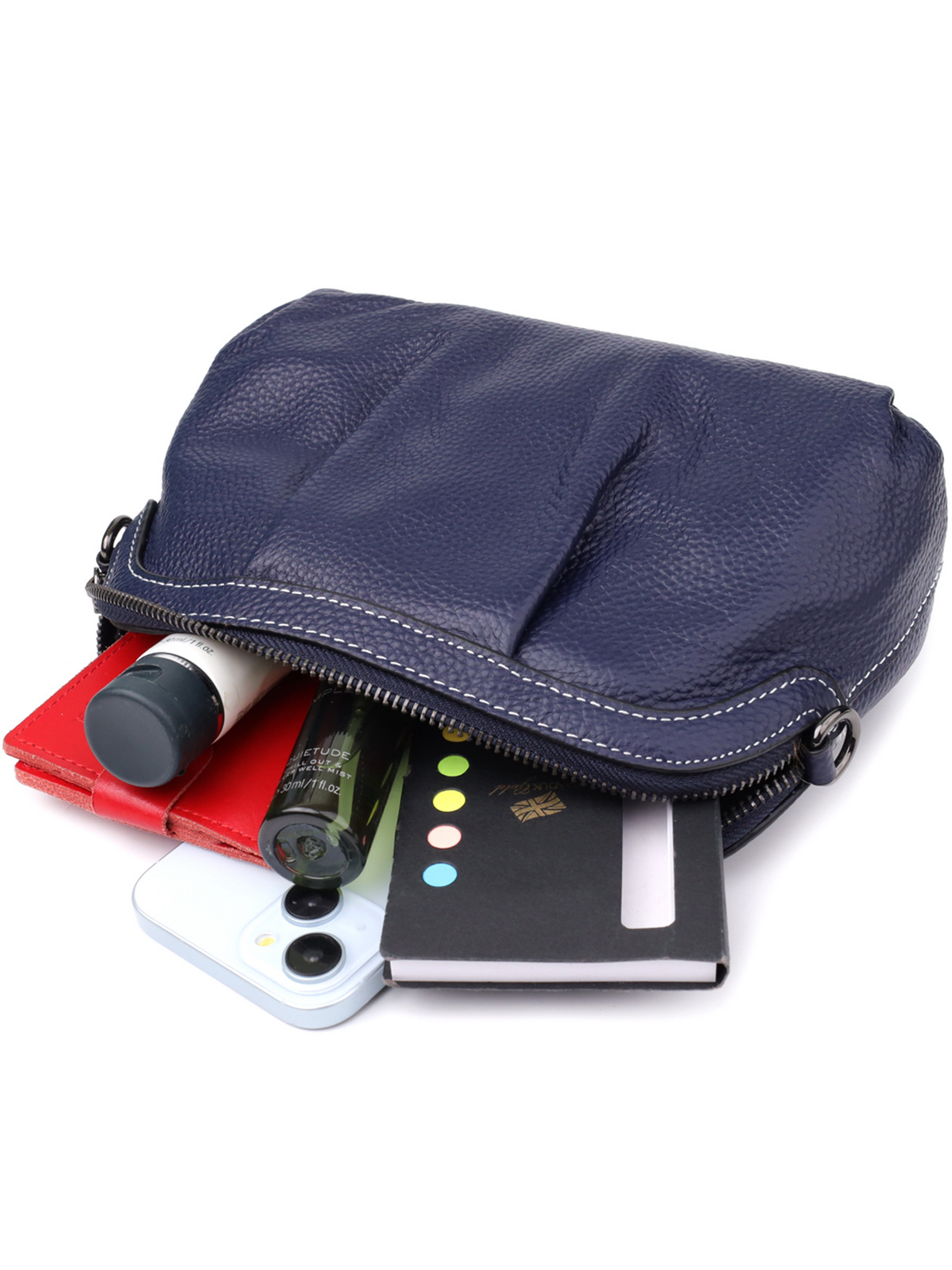 Цвет: синий; Материал: натуральная кожа; Размер (ШхВхГ, см): 23х15х7см; Длина короткого ремешка: 53 см; Длина длинного ремешка: 140 см (регулируется в меньшую сторону); Страна производитель: Китай; Бренд: Vintage. Особенности: - 1 основное отделение, что закрывается на молнию; - внутри: потайной карман на молнии, карман открытого типа и карман-перегородка на молнии; - по краям прошита элегантной белой строчкой; - фурнитура цвета темного серебра; - съемные 2 кожаных ремешка. Элегантная синяя кожаная сумка с драпировкой - это гармоничное сочетание выразительного дизайна, практичности и безупречного стиля. Мягкие декоративные складки на лицевой стороне придают изделию объём и динамику, подчёркивая текстуру натуральной кожи и добавляя нотку изысканности. Глубокий синий цвет придаёт образу свежести и уверенности, оставаясь при этом универсальным и легко сочетаемым с различной одеждой. Сумка имеет одно основное отделение, надёжно закрывающееся на молнию. Внутреннее пространство продумано до мелочей: потайной карман на молнии, открытый карман и карман-перегородка с молнией позволяют удобно разместить всё необходимое и поддерживать порядок в сумке. Края изделия украшены аккуратной белой строчкой, которая стильно выделяется на фоне насыщенного синего оттенка. Фурнитура цвета тёмного серебра добавляет благородного блеска, подчёркивая современный характер модели. В комплект входят два съёмных кожаных ремешка сумку можно носить в руке, на плече или через плечо, адаптируя её под любой стиль и образ жизни. Синяя кожаная сумка с драпировкой это универсальный и эффектный аксессуар, который подчеркнёт вашу индивидуальность и дополнит как повседневный, так и более нарядный гардероб.