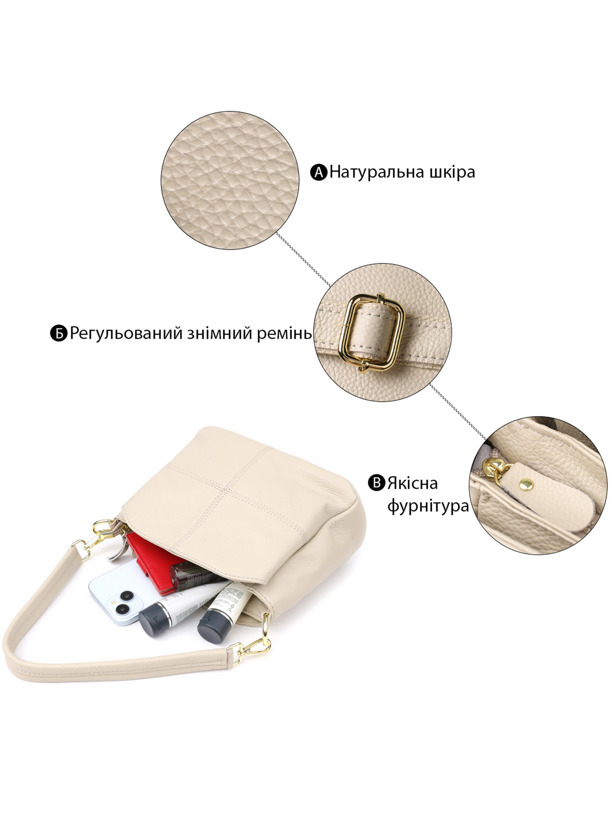 Цвет: белый; Материал: натуральная кожа; Размер (ШхВхГ, см): 22,5х16,5х11,5см; Длина короткого ремешка: 40 см; Длина длинного ремешка: 137 см (регулируется в меньшую сторону); Страна производитель: Китай; Бренд: Vintage. Особенности: - 3 основных отделения, центральное закрывается на молнию, два по бокам закрываются на магниты; - внутри: потайной карман на молнии и карман открытого типа; - 1 карман на молнии на тыльной стороне; - цвет фурнитуры под желтое золото; - съемные 2 кожаных ремешка. Женская кожаная сумка белого цвета — утонченность, которая всегда в моде. Эта изысканная модель станет универсальным дополнением к любому гардеробу. Стильный и чистый белый цвет подчеркивает элегантность, свежесть и утонченность образа, делая сумку уместной как в деловой обстановке, так и в повседневной жизни. Благодаря натуральной коже высокого качества сумка выглядит дорого и сохраняет безупречный вид даже при активной эксплуатации. Три функциональных отделения обеспечивают удобную организацию внутреннего пространства. Центральное закрывается на молнию для надежного хранения, а два боковых фиксируются на магниты — идеальное решение для быстрого доступа к часто используемым вещам. Внутри — аккуратный потайной карман на молнии и открытый карман, в который легко поместятся смартфон, карточки или другие мелочи. На тыльной стороне предусмотрен внешний карман на молнии, который станет незаменимым для хранения необходимых предметов первой необходимости. Фурнитура под желтое золото гармонично сочетается с белой кожей, придавая сумке нотки роскоши и женственности. В комплект входят два съемных кожаных ремешка, которые позволяют носить сумку в руке, на плече или через плечо — в зависимости от вашего настроения и образа. Эта белая кожаная сумка — воплощение стиля, комфорта и утонченной классики, которая всегда актуальна.