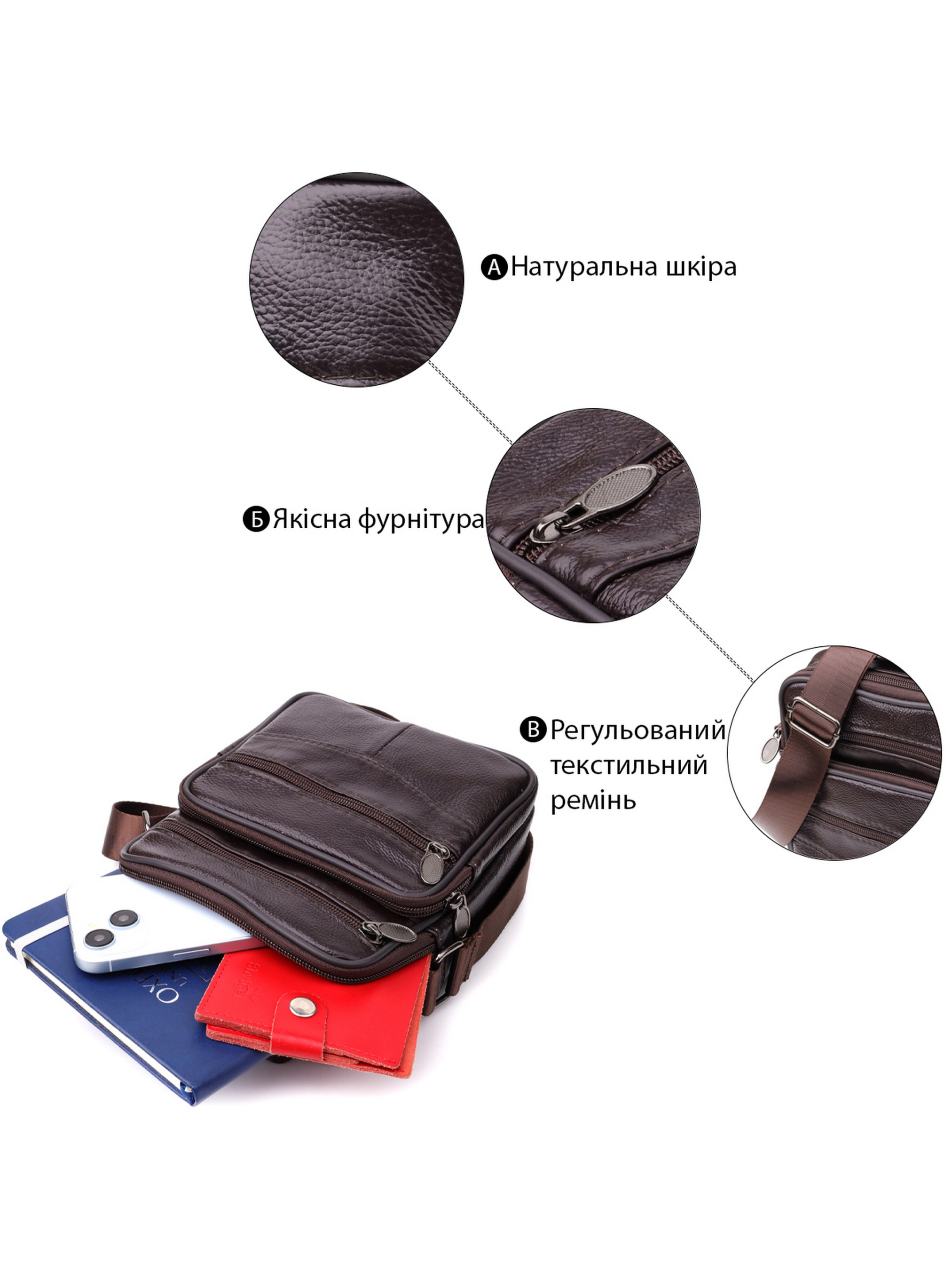 Цвет: коричневый; Материал: натуральная кожа; Размеры (ШхВхГ, см): 17х19,5х7 см; Страна-производитель: Китай; Бренд: Vintage. Описание: - одно основное отделение на молнии; - внутри небольшой карман на молнии; - на внешней стороне три кармана на молнии; - на тыльной стороне карман на молнии; - регулируемый текстильный ремень для переноски на плече; - удобная ручка для переноса сумки в руках. Удобная мужская сумка из высококачественной натуральной кожи, устойчивая к износу и мелким повреждениям. Модель оснащена одним вместительным основным отделением и четырьмя дополнительными карманами, которые обеспечивают удобное хранение аксессуаров, документов, телефона и других необходимых вещей. Регулируемый плечевой ремень выполнен из прочного текстиля, что гарантирует комфорт при носке, а также позволяет подобрать оптимальную длину. Короткая ручка делает сумку удобной для переноски в руке. Красивый коричневый цвет придаёт модели универсальности и стиля, делая её отличным выбором на каждый день как для деловых встреч, так и для повседневного использования.