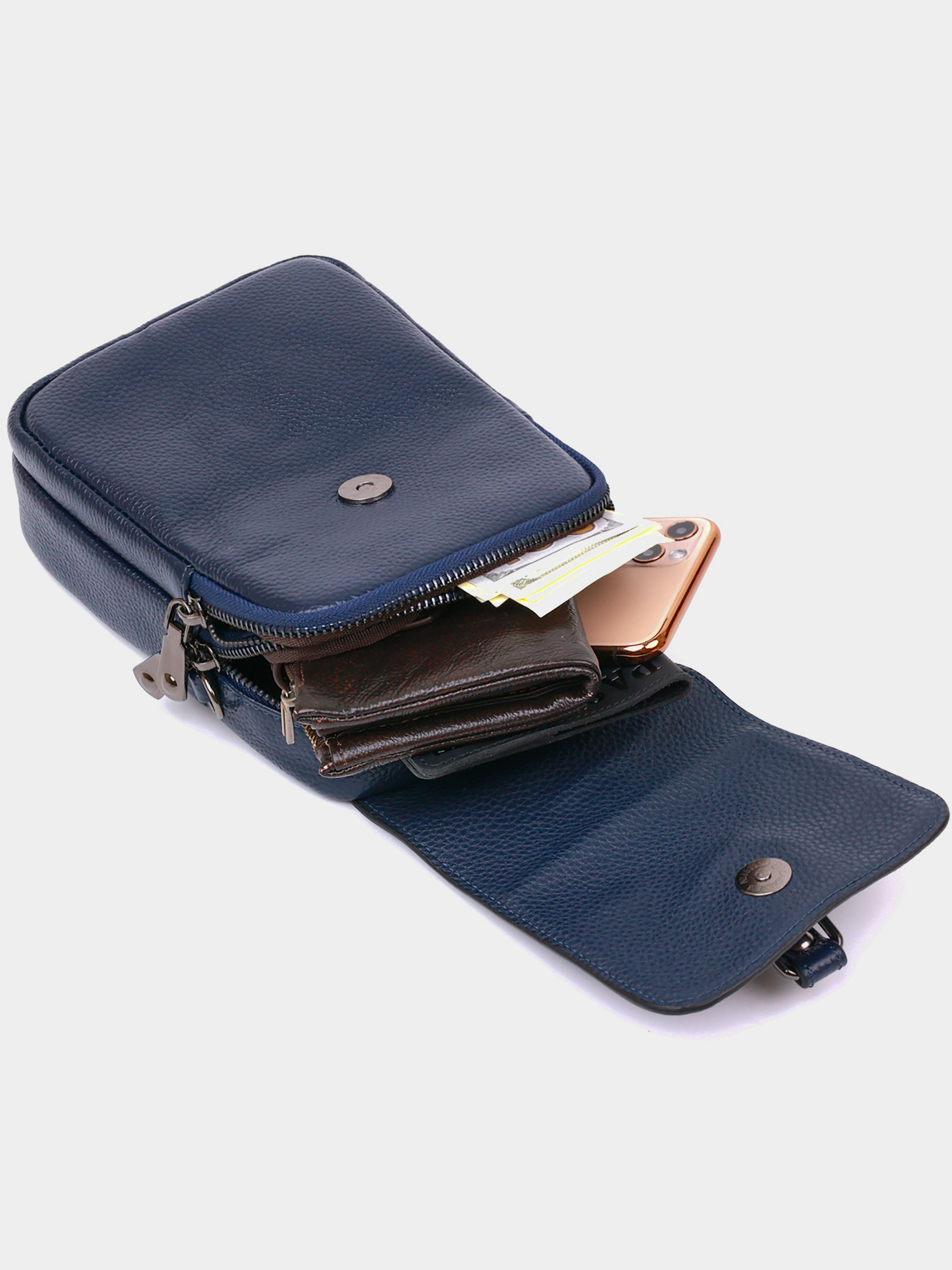 Цвет: синий; Материал: натуральная кожа; Размер (ШхВхГ, см): 16х20х4,5; Страна производитель: Китай; Бренд: Vintage. Описание: - два отделения на молнии; - потайной карман; - закрывается клапаном на магните; - отверстие для наушников на тыльной стороне; - цвет фурнитуры – темное серебро; - съемный ремешок на плечо. Необычная синяя сумка из качественной зернистой натуральной кожи, мягкой и приятной на ощупь. Изделие имеет достаточно отделений. Качество изделия очень высокое. Торчащие нитки отсутствуют, крепкая фурнитура и плотная подкладка. Данная модель станет прекрасным подарком для любого мужчины. В комплекте идет пылезащитный чехол.