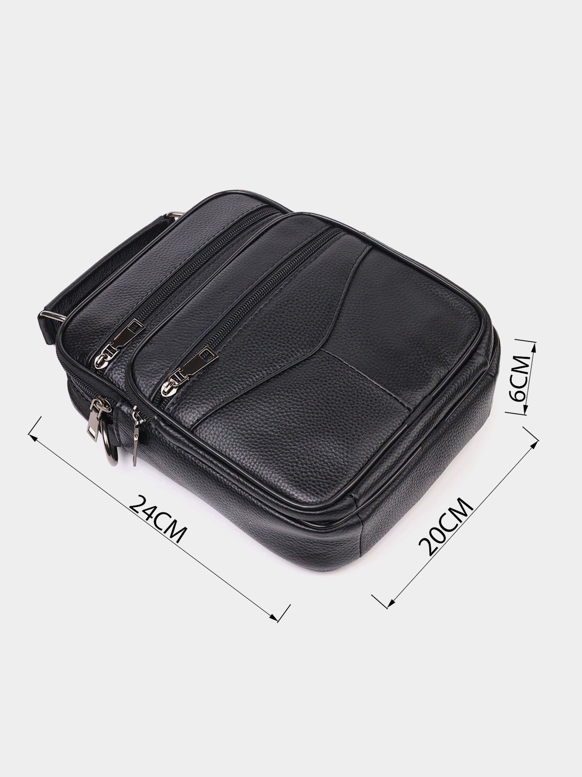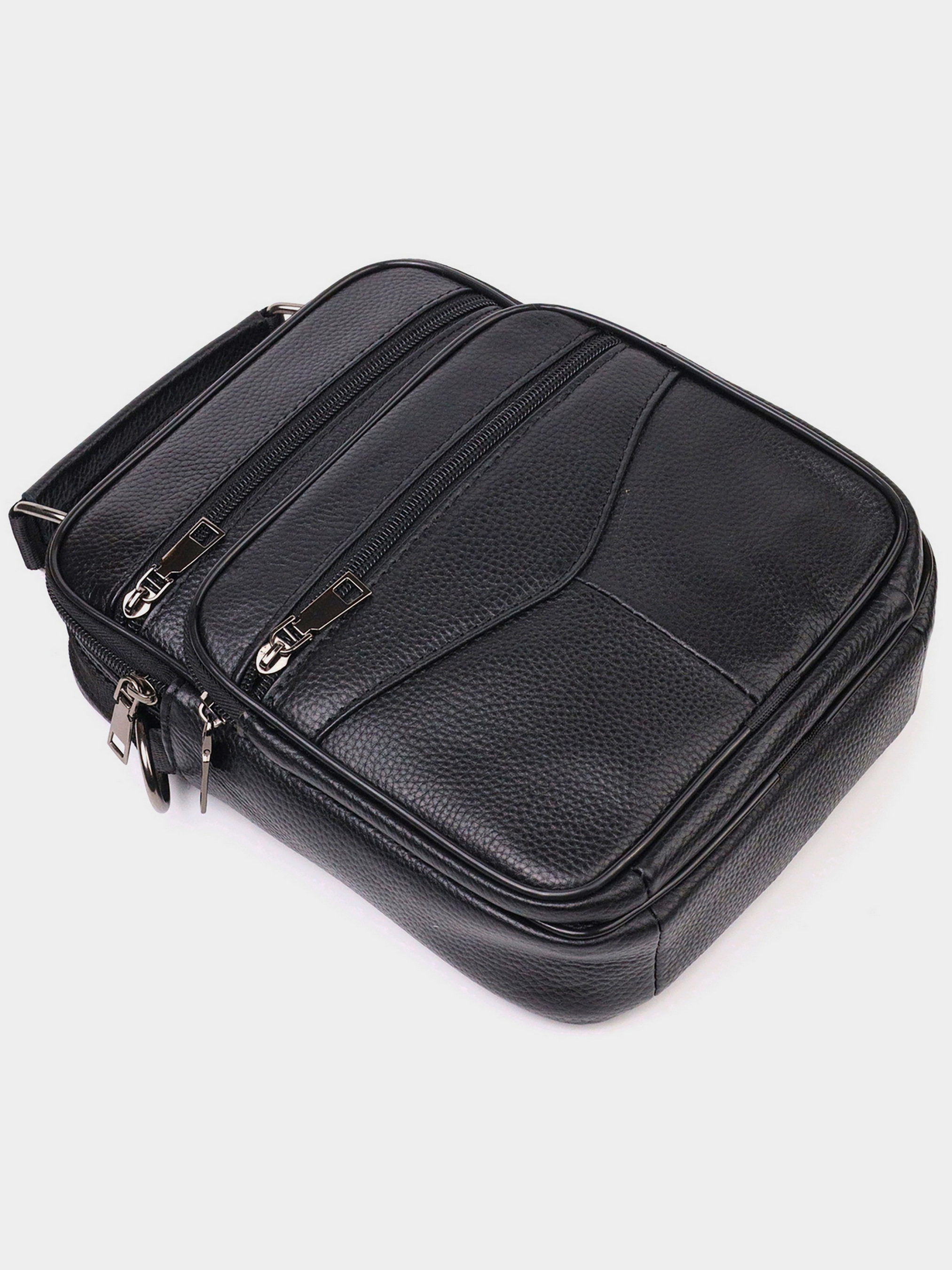 Цвет: черный; Материал: натуральная кожа высокого качества; Размер (ШхВхГ, см): 20х24х6; Страна производитель: Китай. Особенности: - основное отделение на молнии; - потайной карман на молнии на задней стенке; - два кармана на тыльной стороне на молнии; На лицевой стороне: - накладной кармашек на молнии; - два встроенных кармана на молнии; - ручка для переноса в руках; - съемный регулируемый текстильный ремешок на плечо. Вместительная мужская сумка среднего размера из натуральной кожи. Модель идеально подойдет на каждый день. В сумку с легкостью поместятся все самые необходимые вещи. С такой сумкой будет удобно ходить на работу или встречи. Дополнено изделие качественной фурнитурой, цвета темное серебро. Сумка станет прекрасным подарком для близкого человека.