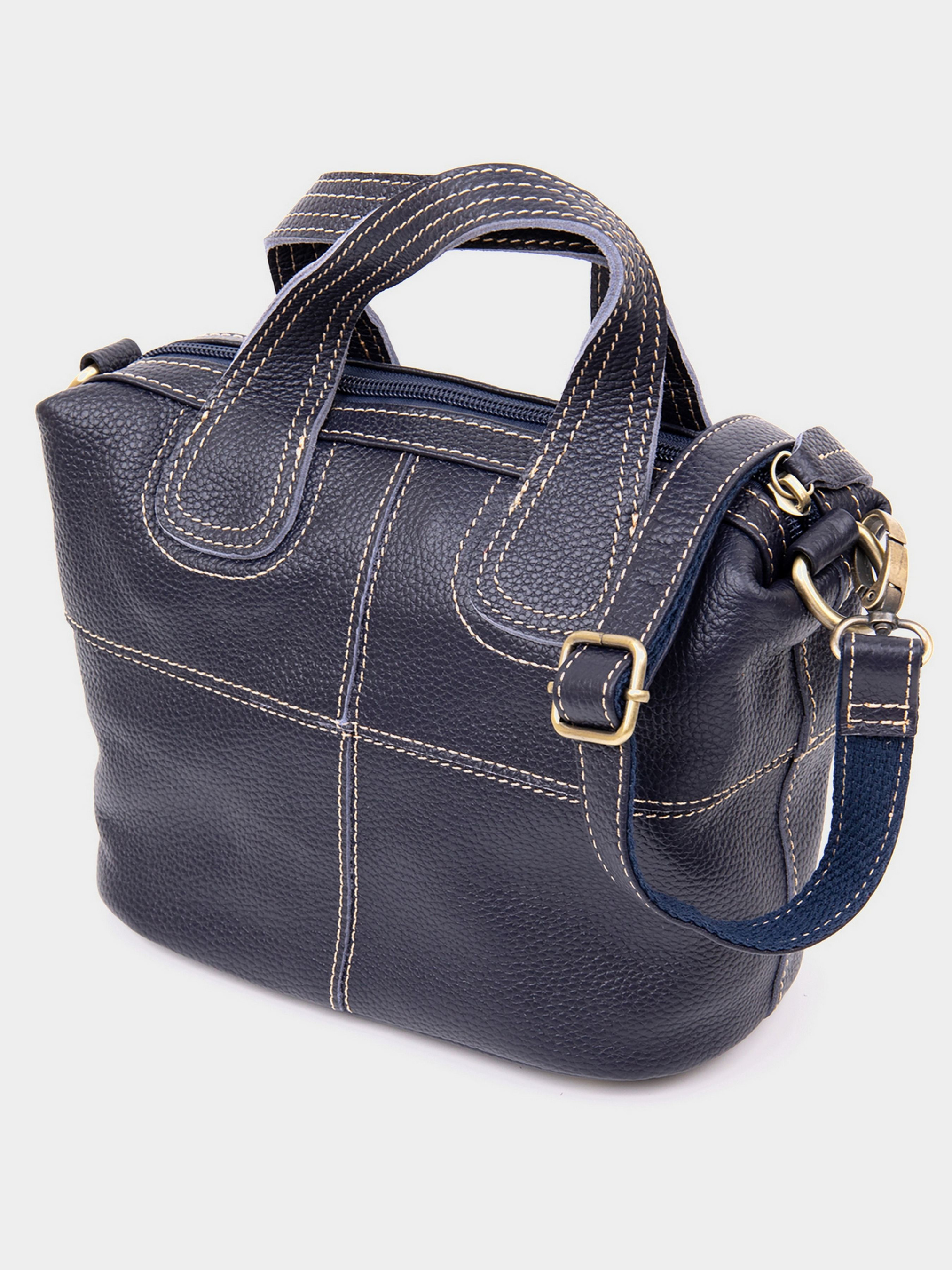 Цвет: синий; Материал: натуральная кожа; Размер (ШхВхГ, см): 25х27х5. Страна производитель: Китай. Бренд: Vintage. Особенности: - закрывается на молнию; - внутри: потайной карман на молнии и два накладных кармана; - металлические ножки для защиты днища сумки; - ручки для носки в руках; - ремешок на плечо с кожаной вставкой. Компактная женская сумка из натуральной кожи со светлой нитью в дизайне и в синем цвете. Сумка дополнена качественной фурнитурой. Изделие в коже флотар мягкой, но при этом плотной. Внутри - качественная подкладка. На дне изделия металлические ножки для защиты днища сумки. Сумку удобно носить в руках и на плече. Сумка - идеальный аксессуар на каждый день и для встреч с друзьями или дискотек. Благодаря классическому дизайну данная модель всегда будет на пике популярности. Рекомендуем к покупке данную модель для стильных девушек. Изделие - идеальный вариант для подарка.