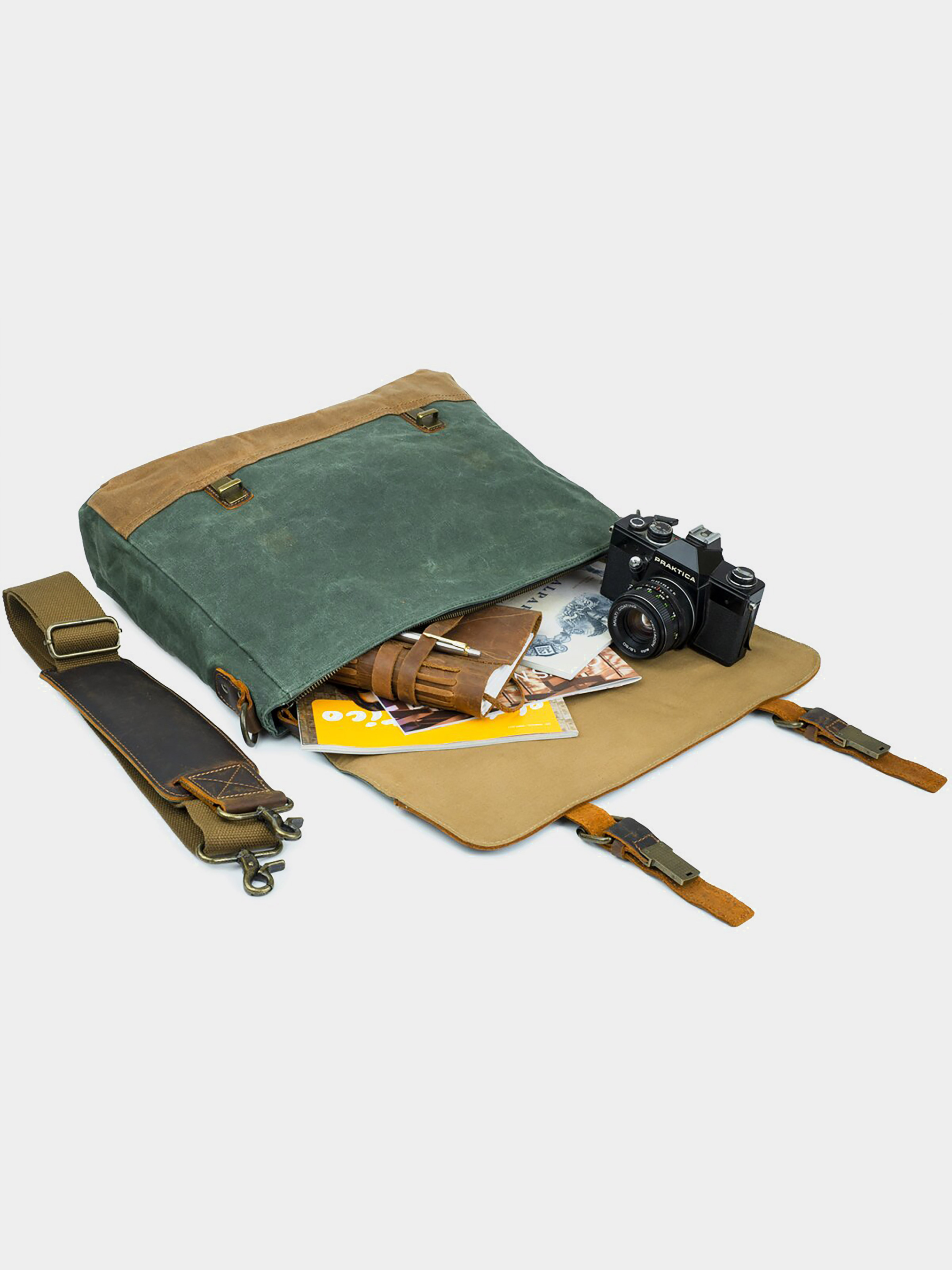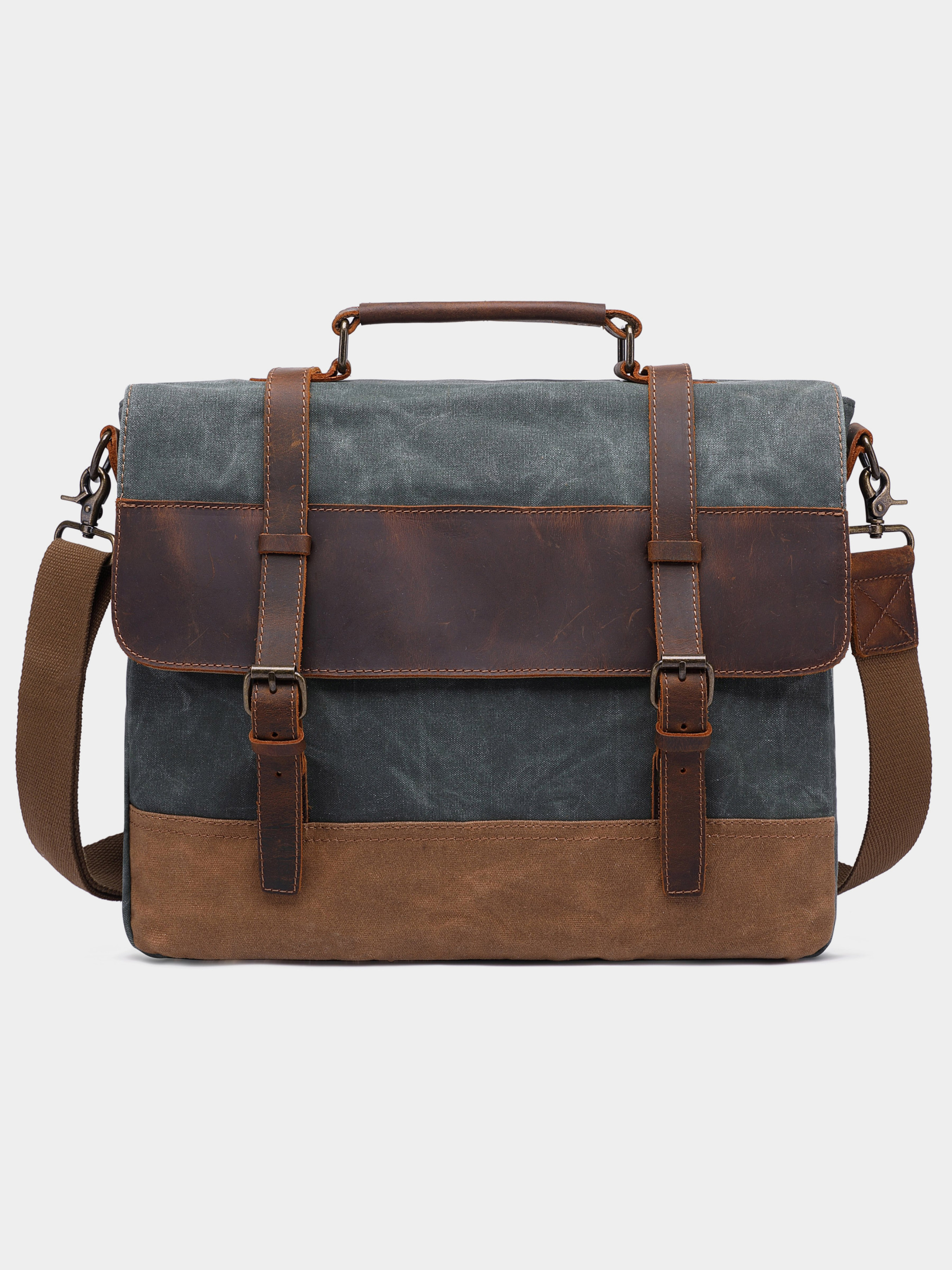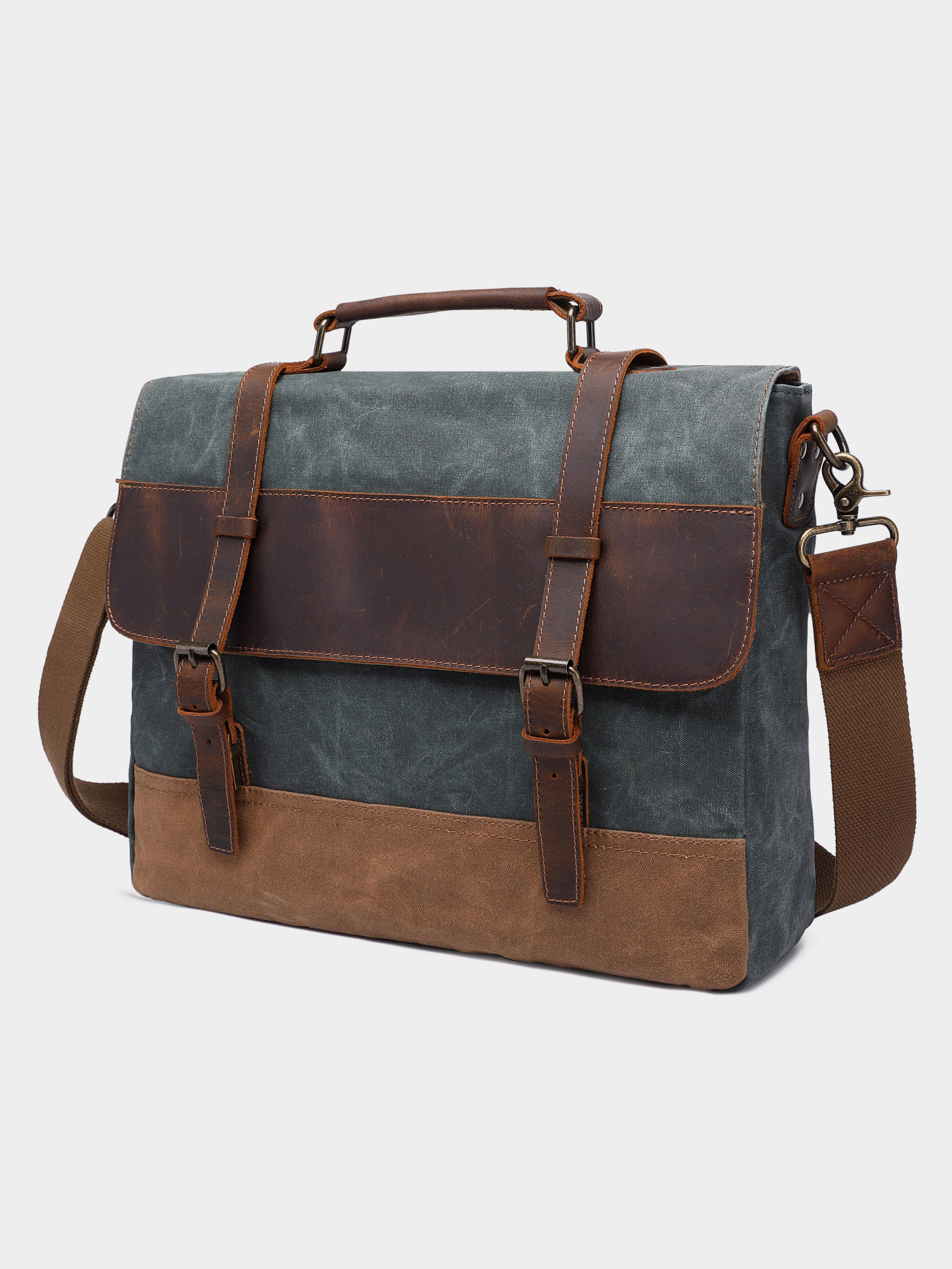 Материал: текстиль; Цвет: серый; Размеры (ШхВхГ, см): 42х35х11. Страна производитель: Китай. Особенности: - основное отделение на молнии; - карман уплотненный с липучкой для ноутбука; - карман на молнии; - два открытых кармана; - кармашек для ручки; - карман на молнии на тыльной стороне; - регулируемый текстильный ремешок на плечо; - кожаная ручка для носки в руке; - подкладка из коричневой ткани. Вместительный винтажный мужской портфель на классических застежках. Модель серого цвета с зеленоватым оттенком. Cумка изготовлена из вощеной парусины в сочетании с натуральной винтажной кожей. В изделие легко поместится ноутбук диагональю 15.6 дюймов. Модель очень крепкая. В дизайн сумка дополнена ремешками на клапане. Модель имеет множество удобных карманов и прекрасно подойдет для повседневной жизни. Сумка сочетается с любым вашим стилем. Такая сумка станет хорошим и доступным подарком для любого мужчины.