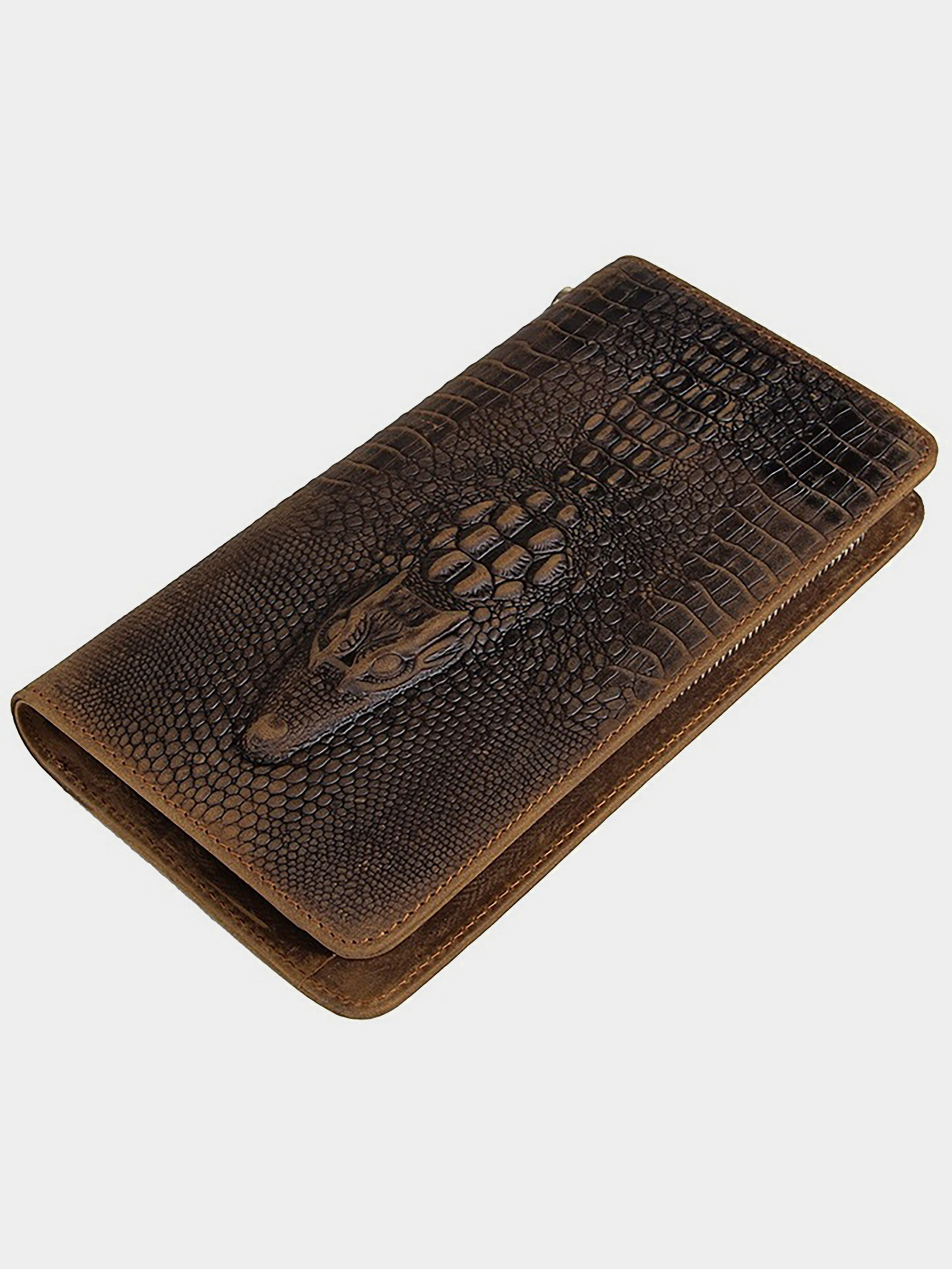 Материал: натуральная кожа высокого качества; Цвет: коричневый; Размеры: 21.5 на 11.5. Современный мужской кожаный кошелек-клатч из натуральной высококачественной кожи с фактурой под крокодила. Аксессуар закрывается при помощи молнии. Носиться барсетка в реке или на запястье при помощи удобного, кожаного ремня-петли. Аксессуар упакован в текстильный пылезащитный мешочек. Внутри: - 2 автономных отделения разделенных отделением-перегородкой на молнии; - 8 отделений для пластиковых карточек; - 2 накладных кармана для банкнот.