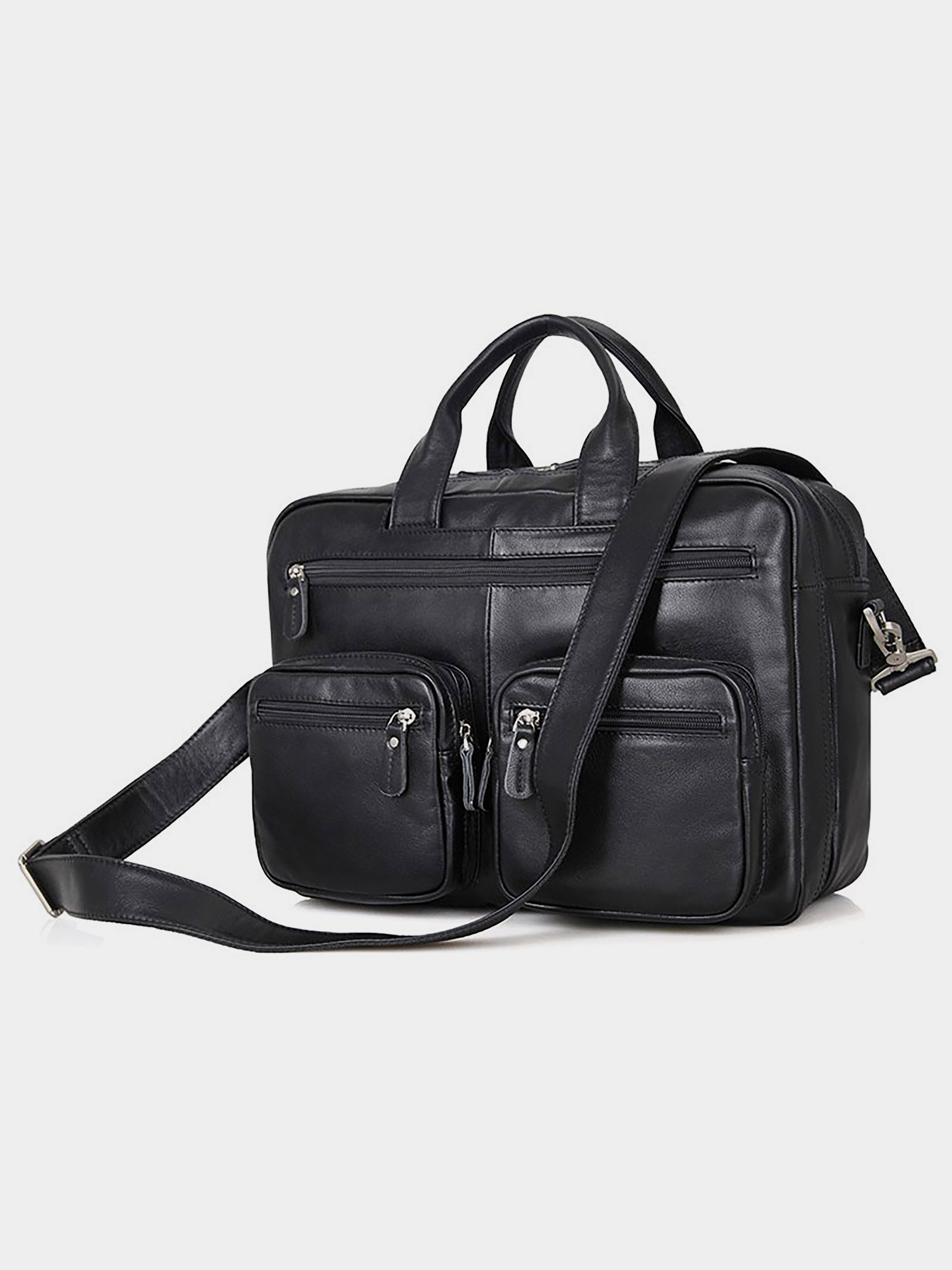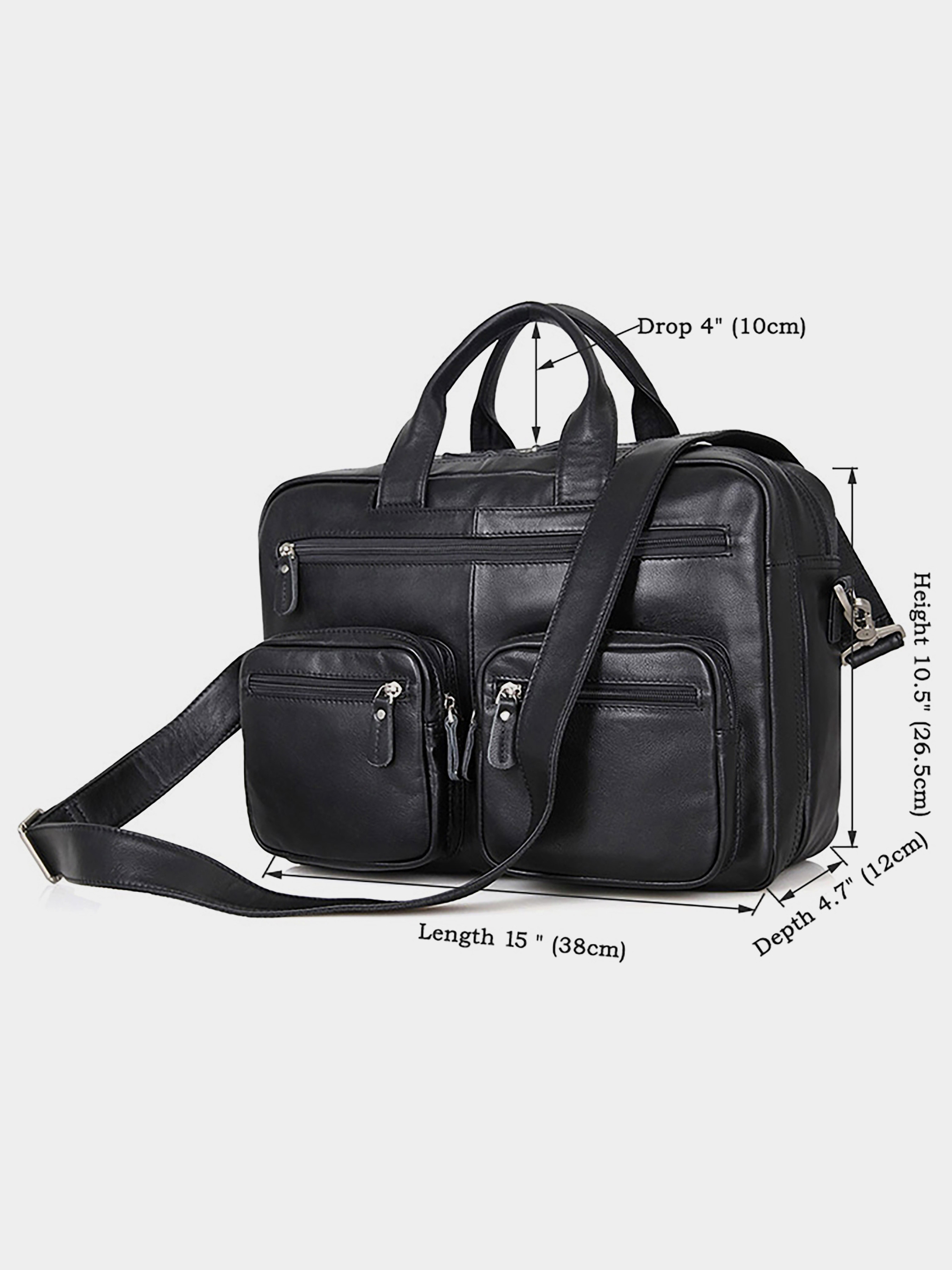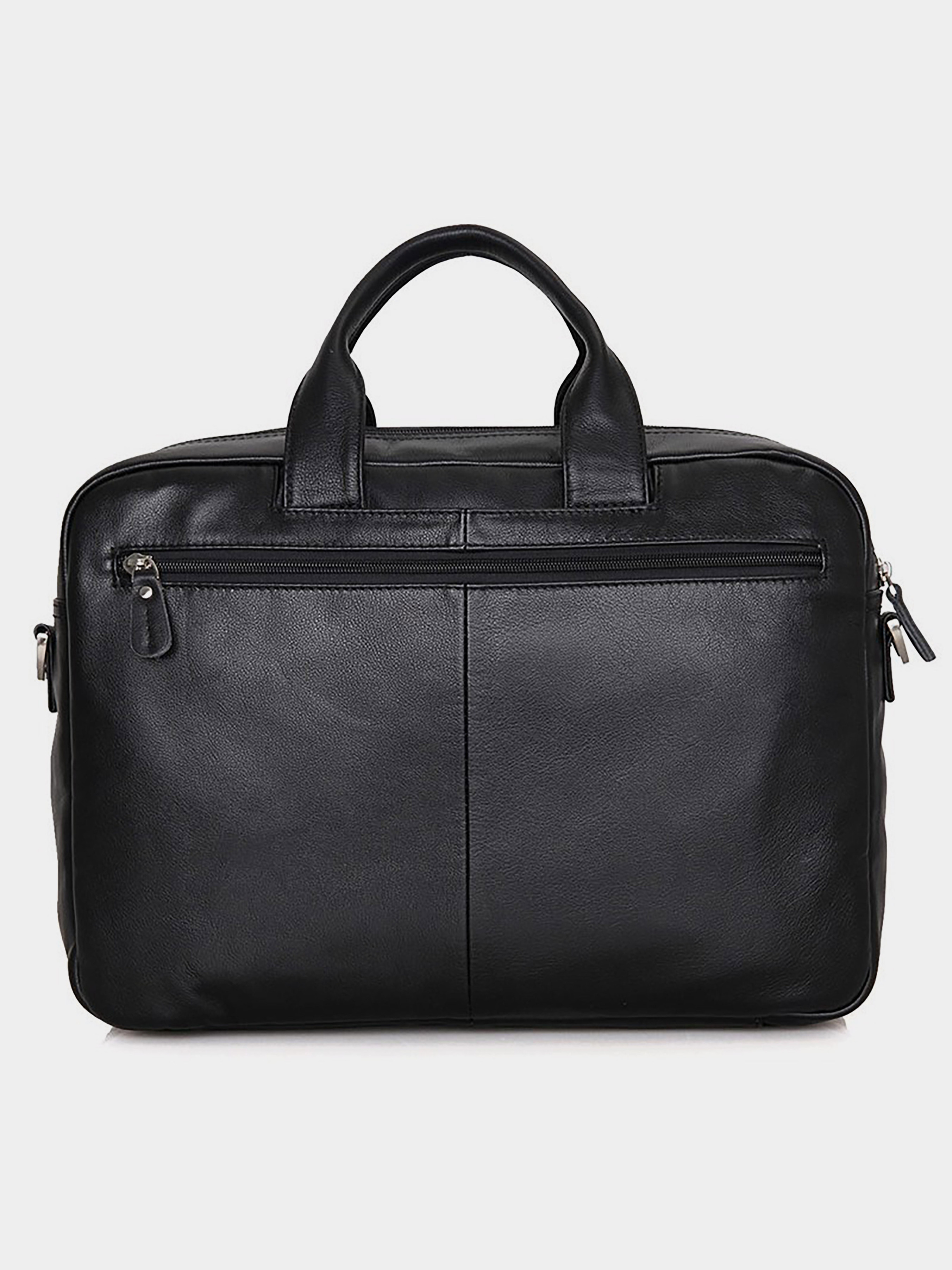Цвет: черный; Материал: натуральная кожа высокого качества; Размеры: 38 на 26.5 на 12 см. Эксклюзивная мужская кожаная сумка для ноутбука. Аксессуар отличается множеством карманов и отделений, что позволяет поместить в него максимум нужных вещей. Цвет фурнитуры: латунь. На лицевой стороне расположены три отделения на молниях (два небольших и одно большое). На задней внешней стороне находится вместительное отделение на молнии. Сумку можно переносить в руке, а также через плечо (в комплекте съемный, регулируемый плечевой ремень). Изделие упаковано в текстильный пылезащитный чехол белого цвета. Аксессуар имеет сразу два автономных отделения на молнии: - в первом: 2 накладных кармана для мобильных телефонов; - во втором: потайной карман на молнии.