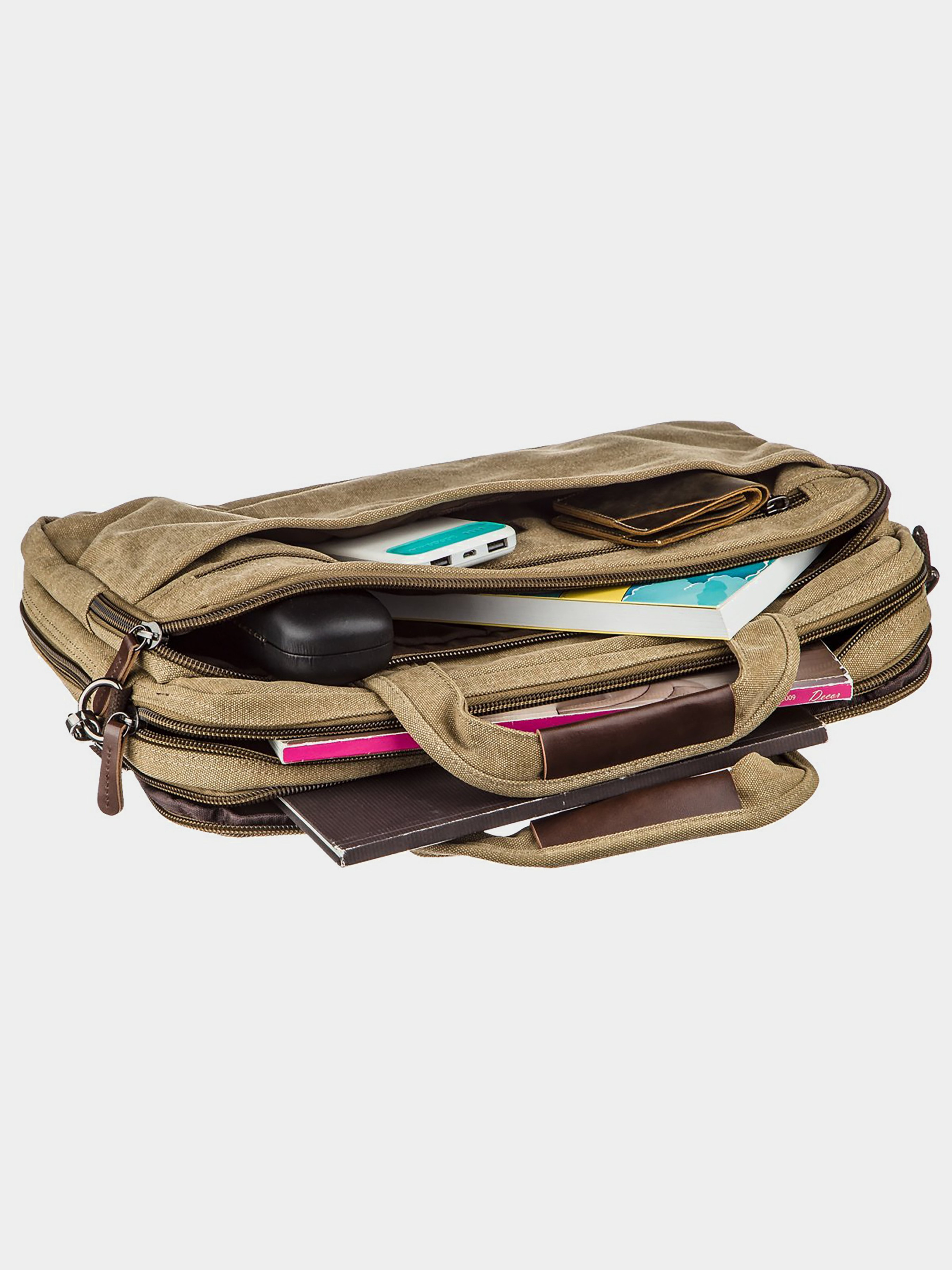 Материал: текстиль; Цвет: хаки; Размеры (ШхВхГ, см): 45х33х5. Страна производитель: Китай. Особенности: - закрывается молниями; - два основных отделения, одно с уплотненным карманом на липучке для ноутбука и двумя накладными открытыми карманами, одно с потайным карманом на молнии; - с передней стороны накладной карман (внутри:3 петли для ручек и два открытых накладных кармашка) и прорезной карман на молнии и карман на липучке; - задний карман на молнии на тыльной стороне; - съемный регулируемый плечевой ремень; - ремешок на чемодан сзади; - подкладка из коричневой ткани. Уже устали искать практичную сумку для ноутбука? У нас есть для вас идеальный вариант. Сумка оптимального размера под ноутбук 15.6 дюймов. Выполнена из прочного текстиля со всеми необходимыми кармашками. Плюсом модели есть то, что вы можете регулировать ее наполненность. Достаточно всего лишь расстегнуть молнию и в сумке появится еще место для нескольких необходимых вещей. Изделие доступно на сайте в нескольких цветах.