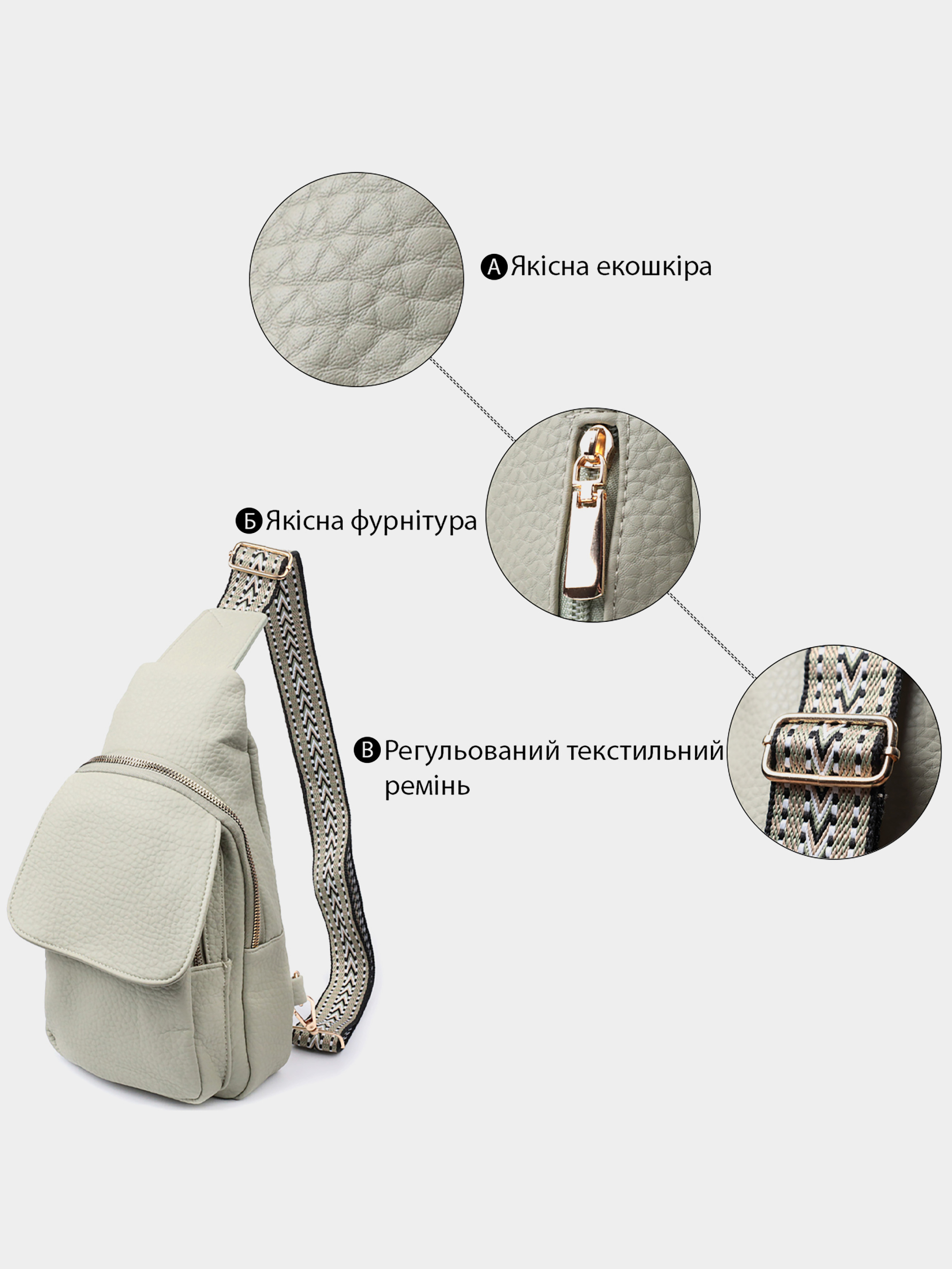 Материал: экокожа; Цвет: фисташковый; Размеры (ШхВхГ, см): 17х29х9см; Страна производитель: Китай. Особенности: - одно основное отделение на молнии; - карман на молнии и четыре кармана для кредитных карт внутри; - карман, что закрывается на молнию и клапаном на магнит, на лицевой стороне; - отверстие для наушников на тыльной стороне; - вертикальный карман на тыльной стороне, что закрывается на молнию; - цвет фурнитуры желтый; - текстильный плечевой регулируемый ремешок. Модная женская слинг сумка из зернистой экокожи в уникальном фисташковом цвете. Данная модель состоит из одного основного отделения которое закрывается на молнию и в котором находится карман на молнии и четыре кармана для кредитных карт внутри, а также двух карманов снаружи и одного отверстия для кабеля или наушников, что очень удобно в современной мире. Акцентом данной модели является удобный регулируемый плечевой ремешок в этническом стиле, что очень модно уже несколько сезонов. Экокожа - высококачественная альтернатива натуральному материалу, которая очень устойчива к трению, к низким температурам, отлично носится в отличии от других искусственных материалов, а также имеет гипоаллергенный состав в отличии от натуральной кожи.