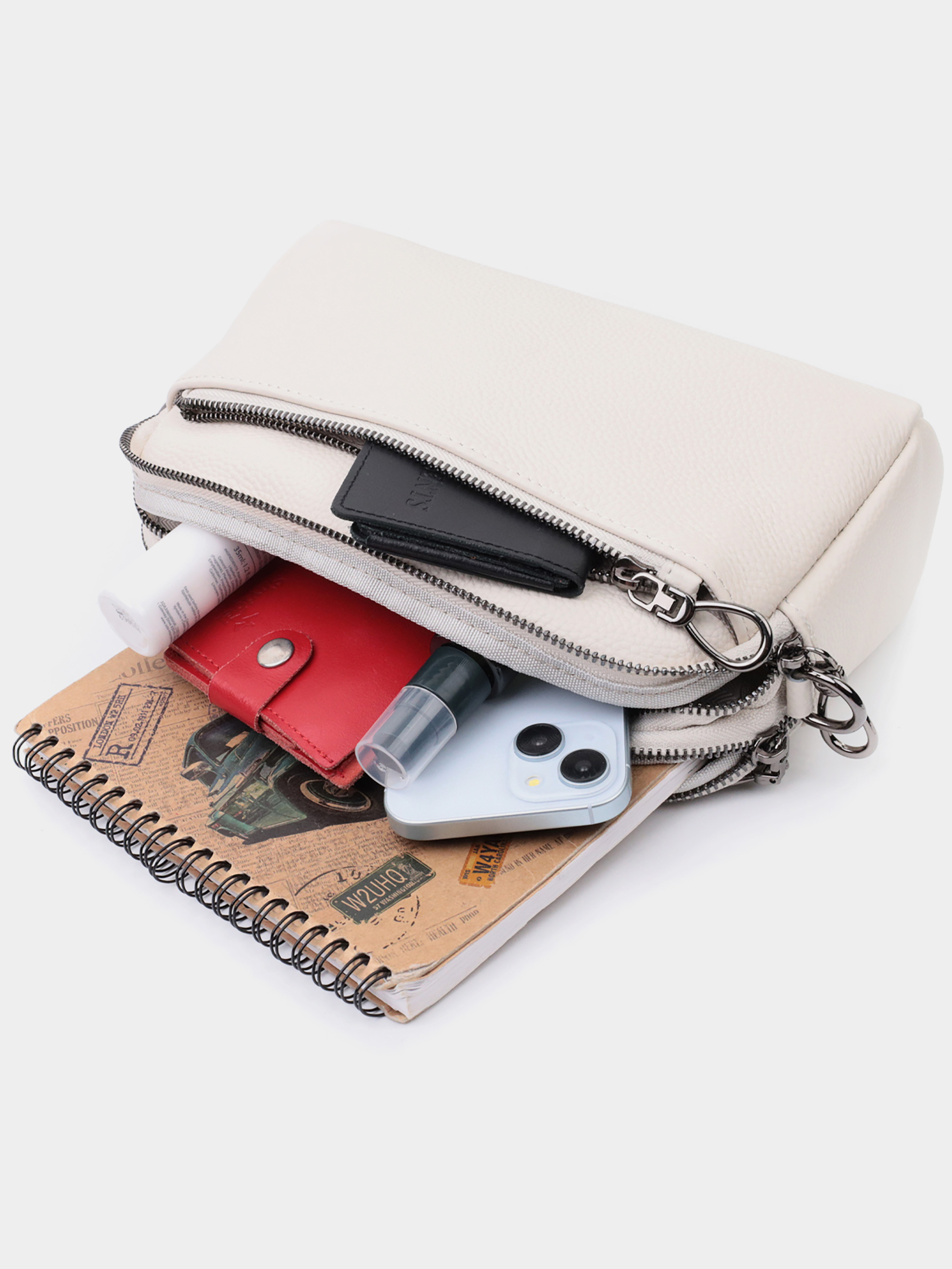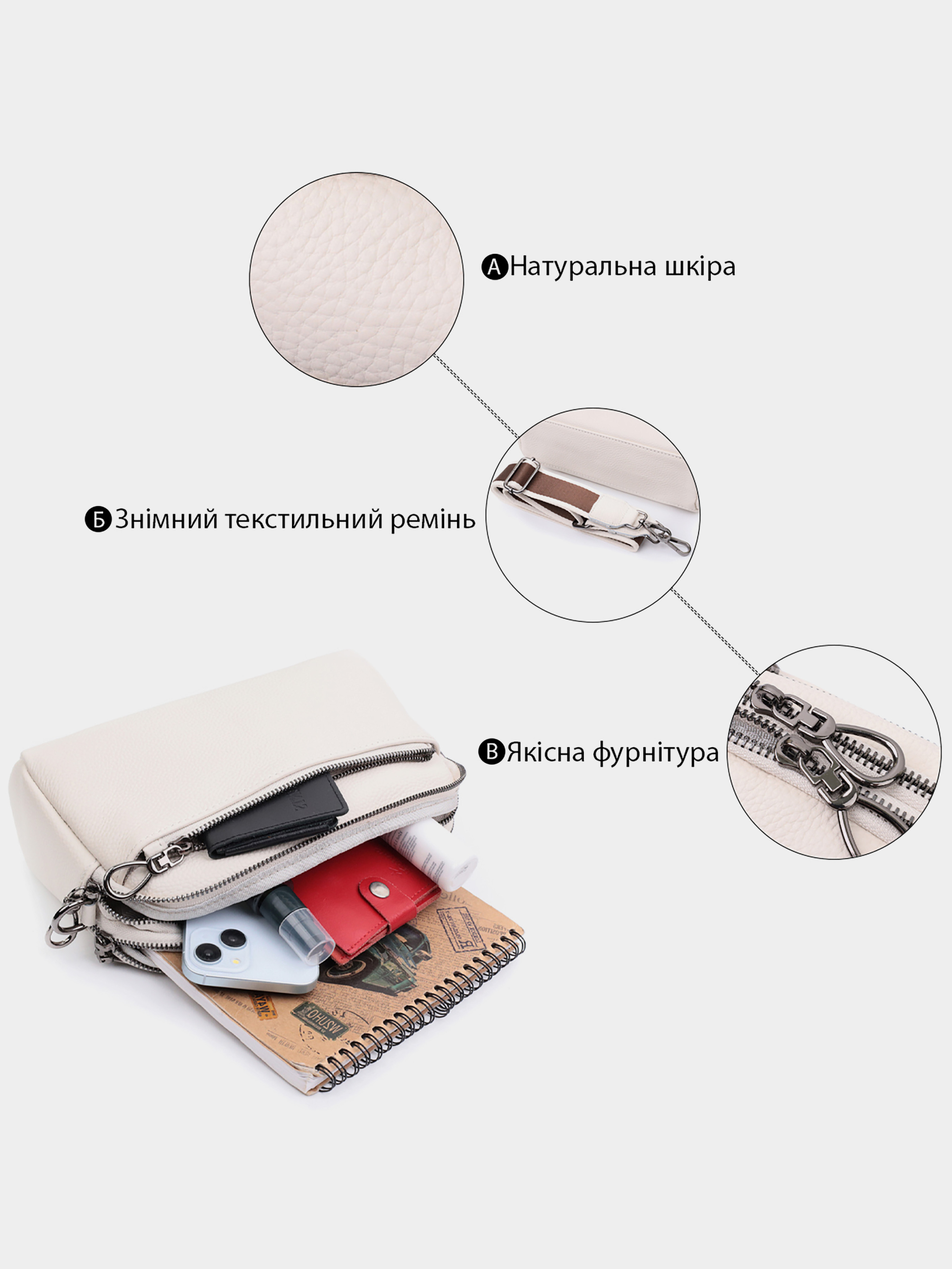 Цвет: белый; Материал: натуральная кожа; Размер (ШхВхГ, см): 25х14,5х8см; Страна производитель: Китай. Бренд: Vintage. Особенности: - два основных отделения, что закрываются на молнию; - внутри: карман открытого типа и карман на молнии; - накладной карман на молнии на тыльной стороне; - накладной карман на молнии на лицевой стороне; - фурнитура цвета темного серебра; - съемный текстильный ремень. Красивая женская сумка на все случаи из натуральной кожи флотар, которая имеет зернистую фактуру. В изделии использована кожа белого цвета. Аксессуар состоит из двух отделений, которые закрываются на молнии, потайного кармана на молнии и кармана открытого типа, а также двух карманов снаружи на лицевой и тыльной стороне. Носить сумку можно в руке, под рукой, на плече и через плечо, для этого имеется текстильный съемный ремень. В аксессуаре использована качественная фурнитура цвета темного серебра. Отличный вариант для подарка близким и дорогим девушкам и женщинам.