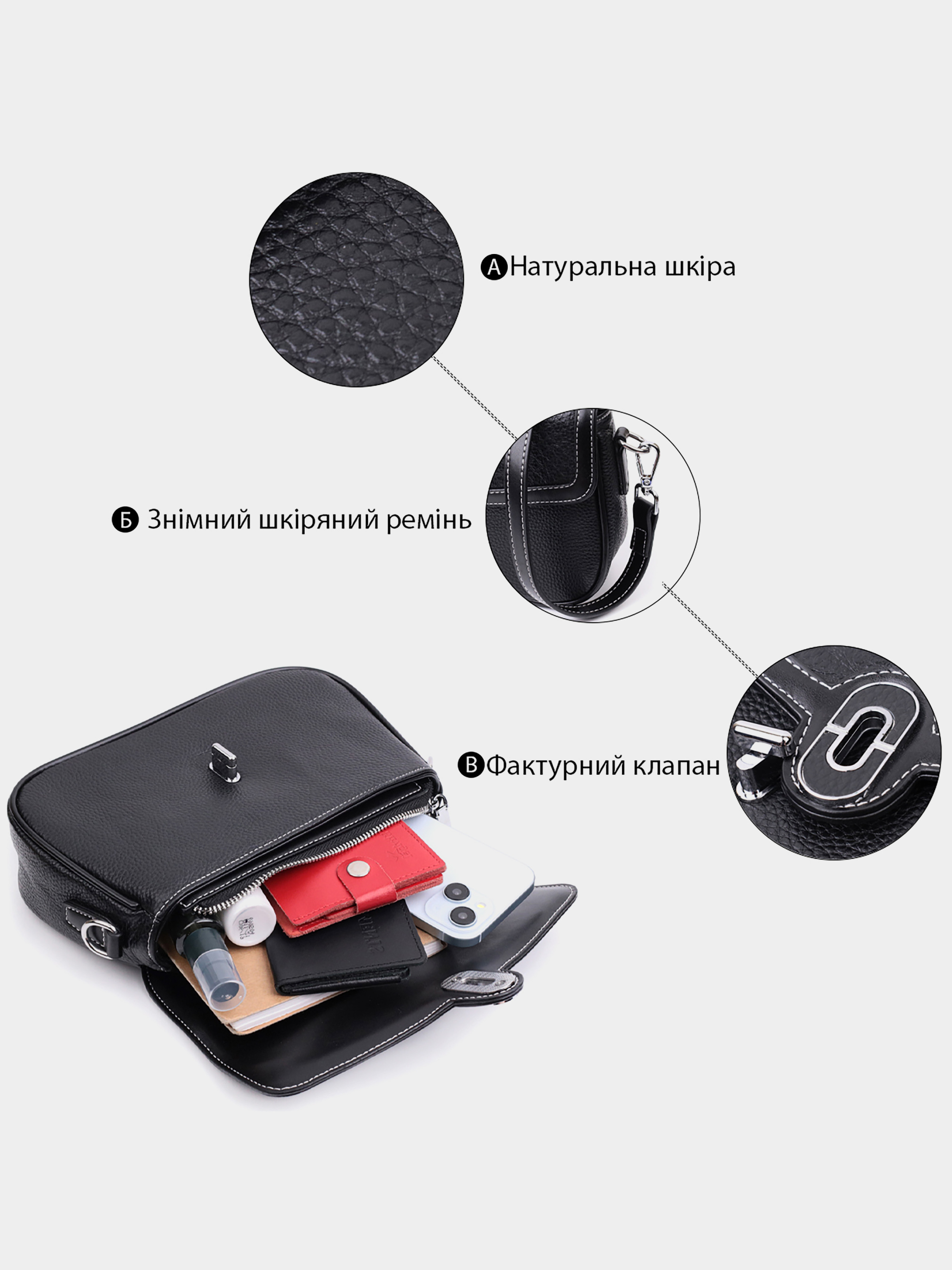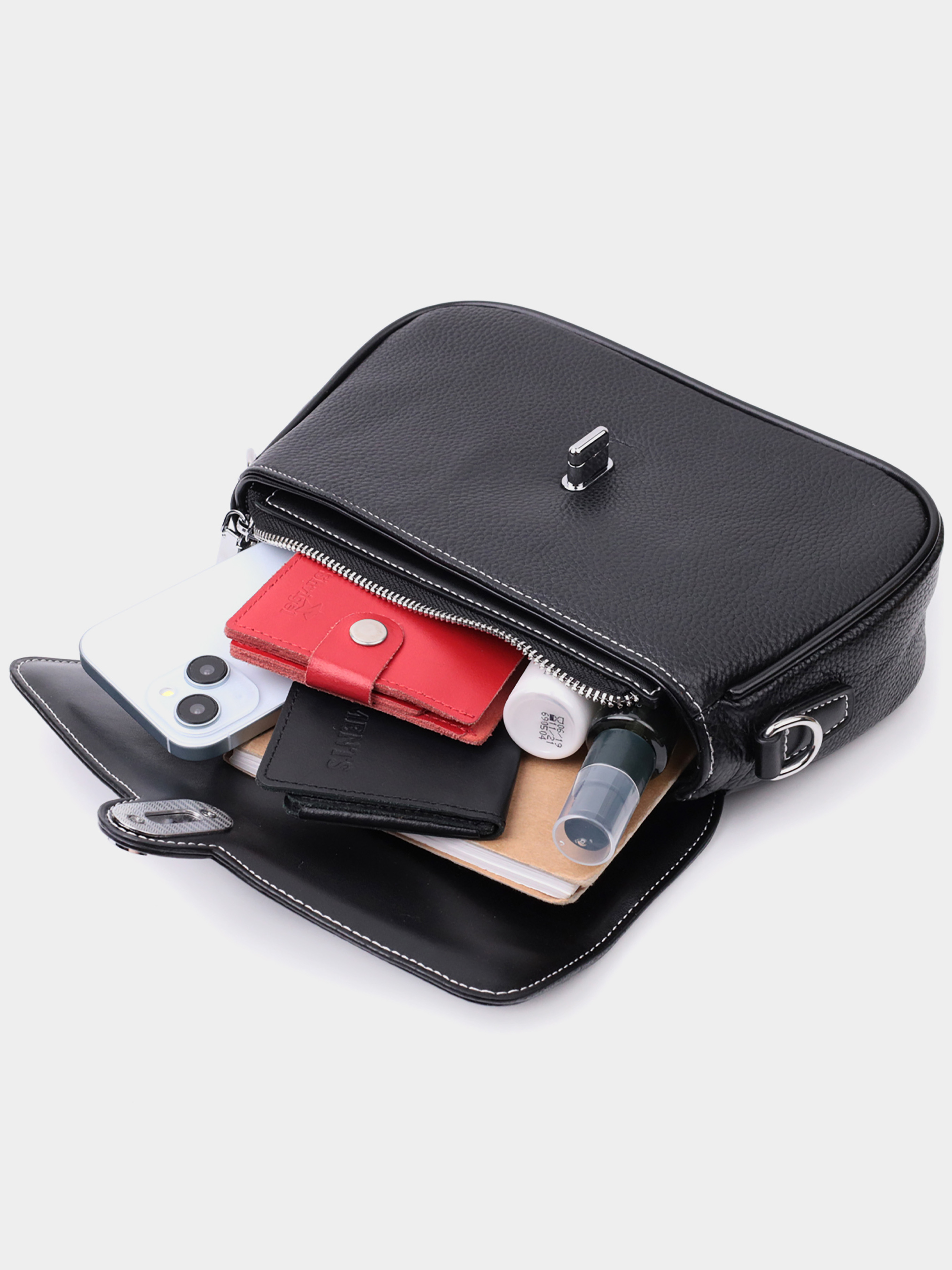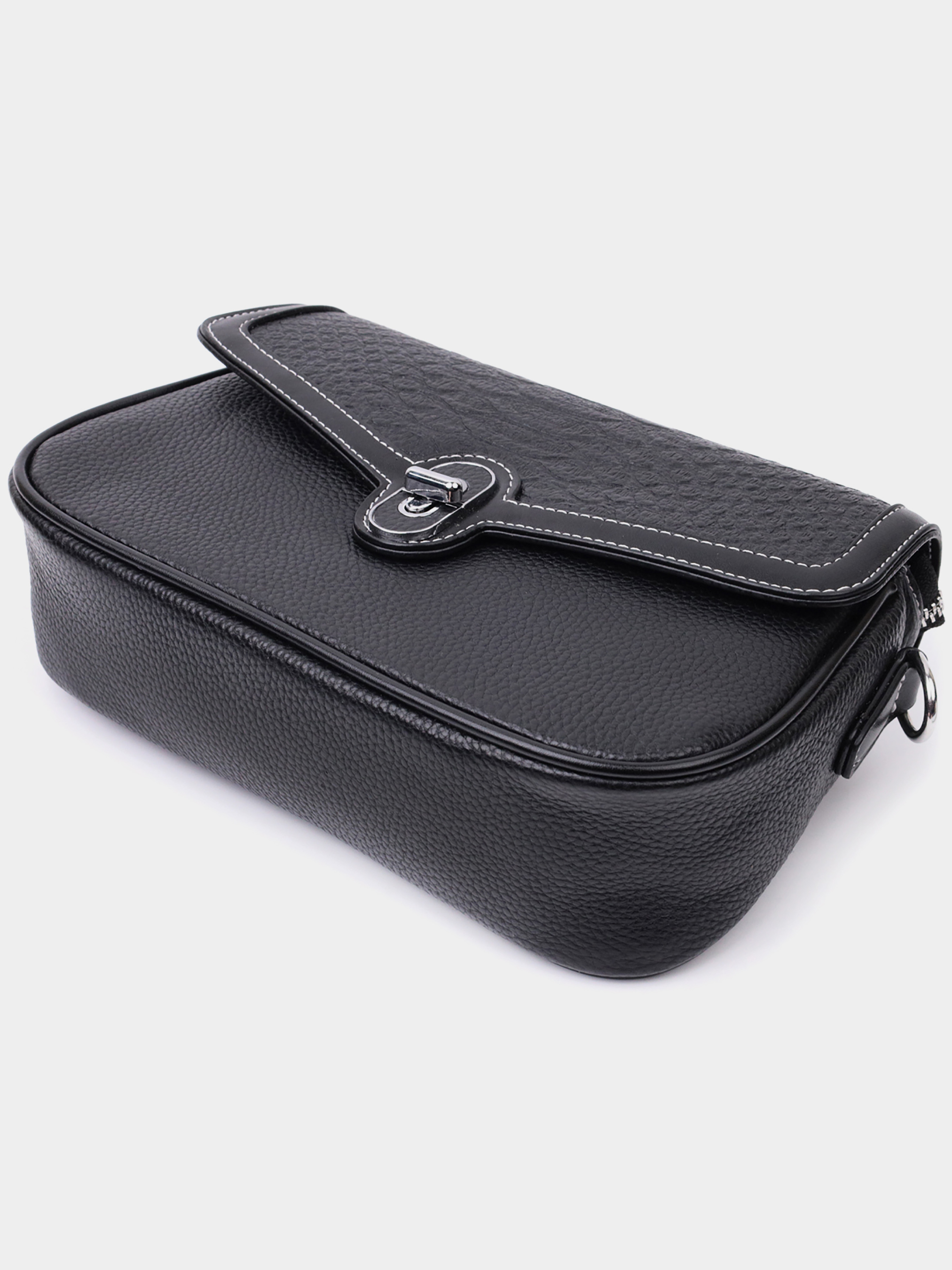 Цвет: черный; Материал: натуральная кожа; Размер (ШхВхГ, см):25,5х15х7,5см; Страна производитель: Китай. Бренд: Vintage. Особенности: - вместительное основное отделение, что закрывается на молнию и на клапан с механической защелкой; - внутри: два кармана на молниях и карман открытого типа; - встроенный карман на молнии на тыльной стороне; - фурнитура цвета серебра; - съемный кожаный ремень. Удобная каркасная женская сумка из натуральной кожи. В изделии использована кожа черного цвета с белой строчкой по краю клапана. Притягивает взгляд в изделии фактурный клапан с тиснением под змею и изящная механическая защелка. Аксессуар состоит из основного отделения, кармана-перегородки на молнии, потайного кармана на молнии и кармана открытого типа, а также еще одного кармана снаружи, на тыльной стороне. Носить сумку можно в руке, под рукой, на плече и через плечо, для этого имеется кожаный съемный ремень. В аксессуаре использована качественная фурнитура цвета серебра. Универсальный вариант сумки на вечер, на каждий день, а также отлично будет сочетаться с деловым стилем.