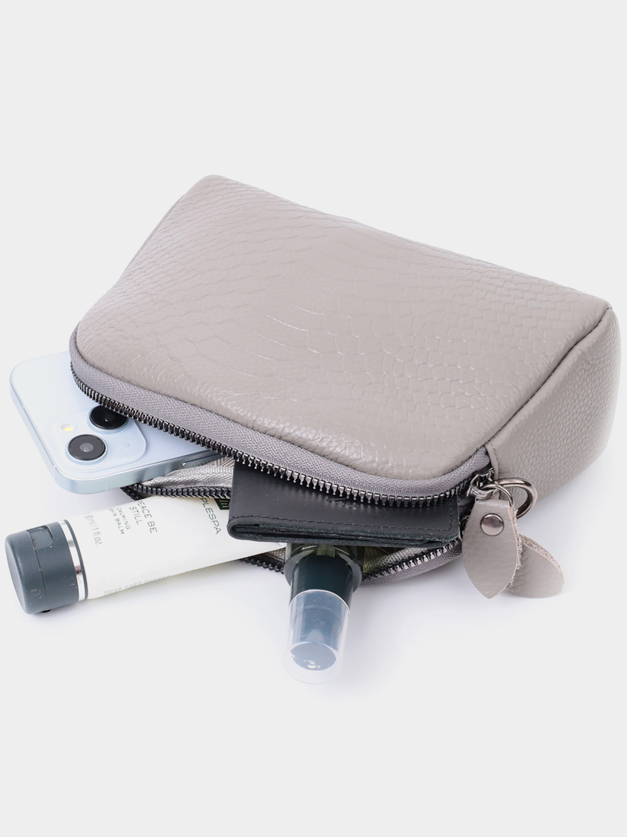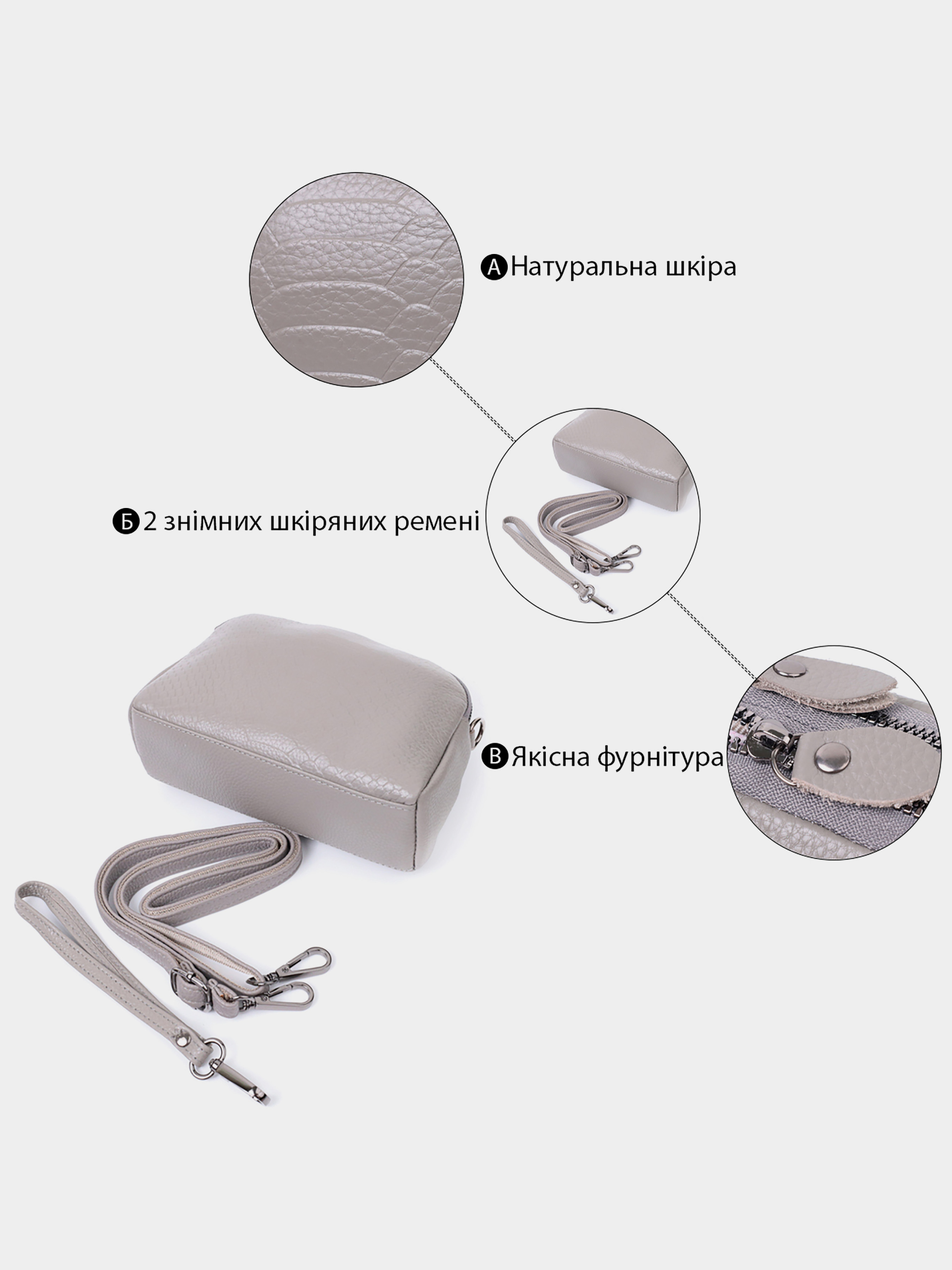 Цвет: серый; Материал: натуральная кожа; Размер (ШхВхГ, см): 19х12х7 см; Страна производитель: Китай; Бренд: Vintage. Особенности: - два автономных отделения, что закрываются на молнии; - внутри: потайной карман на молнии в одном отделении и карман открытого типа во втором отделении; - карман на молнии, на тыльной стороне; - фурнитура цвета темного серебра; - сьемный кистевой ремень; - съемный кожаный ремень. Удобная женская сумка из натуральной мягкой кожи высокого качества с тиснением под змею. Изделие очень удобное, можно носить на плече и через плечо, на кисти и просто под рукой как клатч. Модель дополнена фурнитурой цвета темного серебра. Аксессуар имеет два основных отделения в которых два кармашки - один на молнии и один открытого типа, а также карман на молнии снаружи, на тыльной стороне. Идеальный вариант для любой девушки которая ценит качество и имеет превосходный вкус.