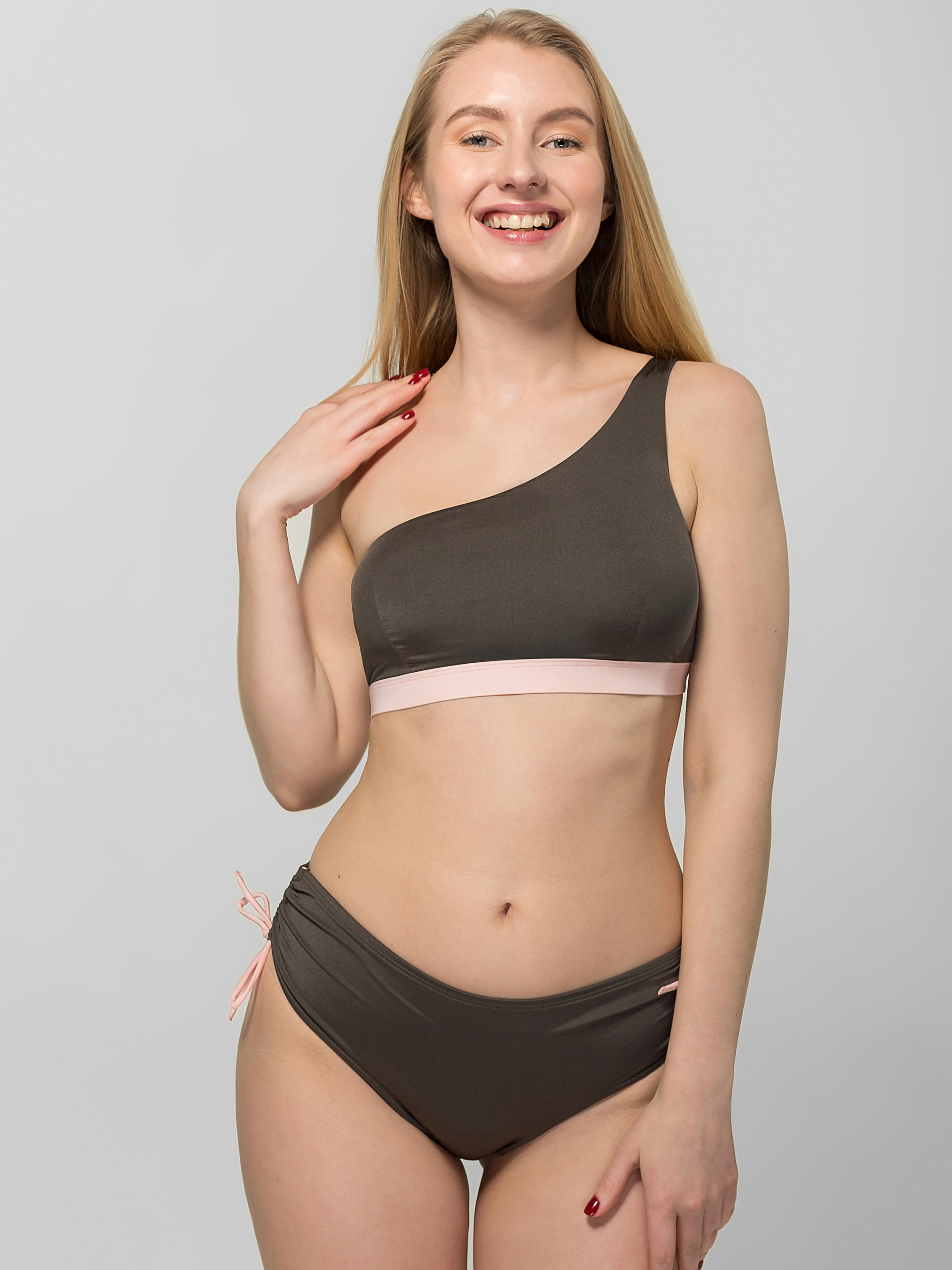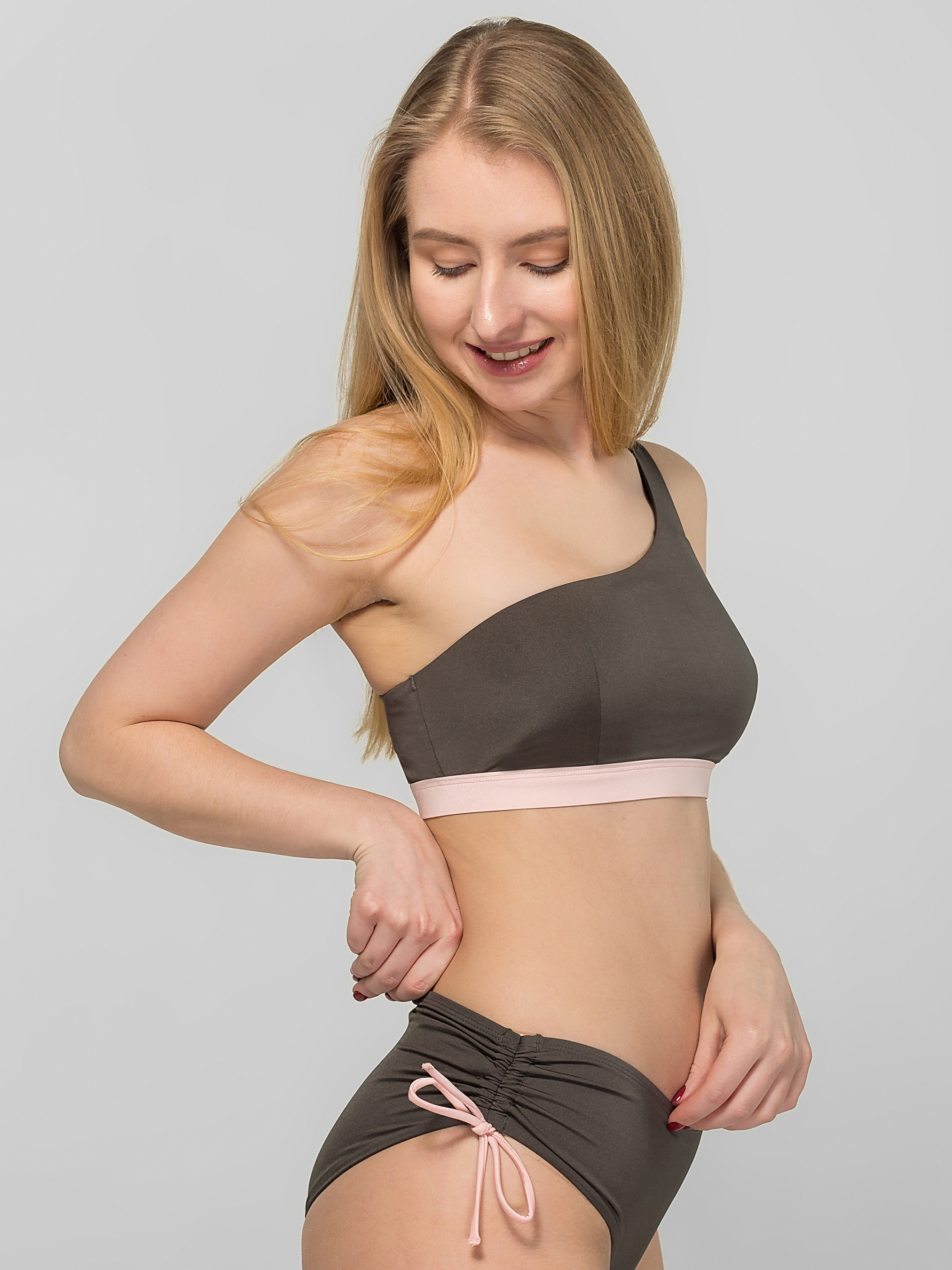- Купальник в форме "Бандо" с цельнокроеной бретелью на одно плечо, такая форма смотрится очень стильно и будет подчеркивать зону ключицы и плечи; - На спинке есть небольшой круглый вырез, который создаст открытую зону для загара; - В зоне груди есть плотная поролоновая подкладка, которая сгруппирует грудь и обеспечит поддержание естественной формы груди; - Бюстгальтер внутри на подкладке, которая предотвращает просвечивание основного полотна после купания, благодаря подкладке основное полотно будет намного дольше сохранять свои приятные тактильные качества и свойства (формоустойчивости и износостойкости); - Во всех краях скрыта эластичная тесьма, такая технология натяжения и фиксации не оставит видимых следов на коже, не будет пережимать и создавать дискомфорт; - Нижний край бюстгальтера обработан плотной эластичной розовой тесьмой, которая отлично зафиксирует бюстгальтер на теле при различных активностях. Состав - Полотно: 82% полиамид, 18% эластан; - Подкладка: 88% полиэстер, 12% эластан.