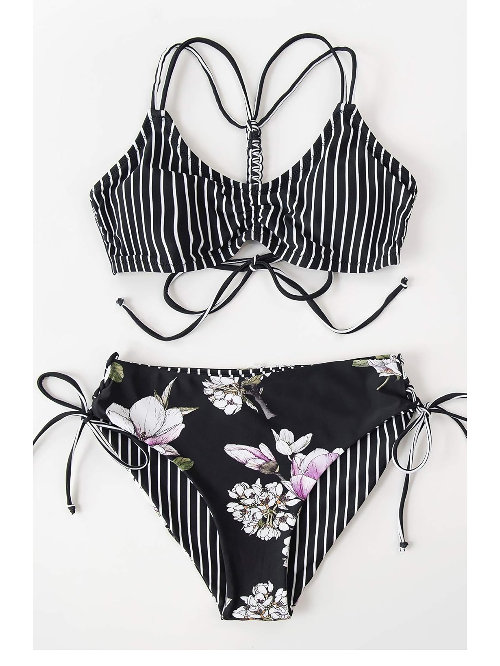 Расслабьтесь у бассейна во время вашего следующего отпуска в этом бикини-комплекте, включающем топ с плетеными бретельками сзади, круглым вырезом и регулируемыми бретельками-спагетти, а также пару двусторонних плавок с однотонным и цветочным узором, плавки средней посадки с регулируемой завязкой по бокам и классическим покрытием ягодиц. О стиле чашек: со съемными мягкими чашечками.