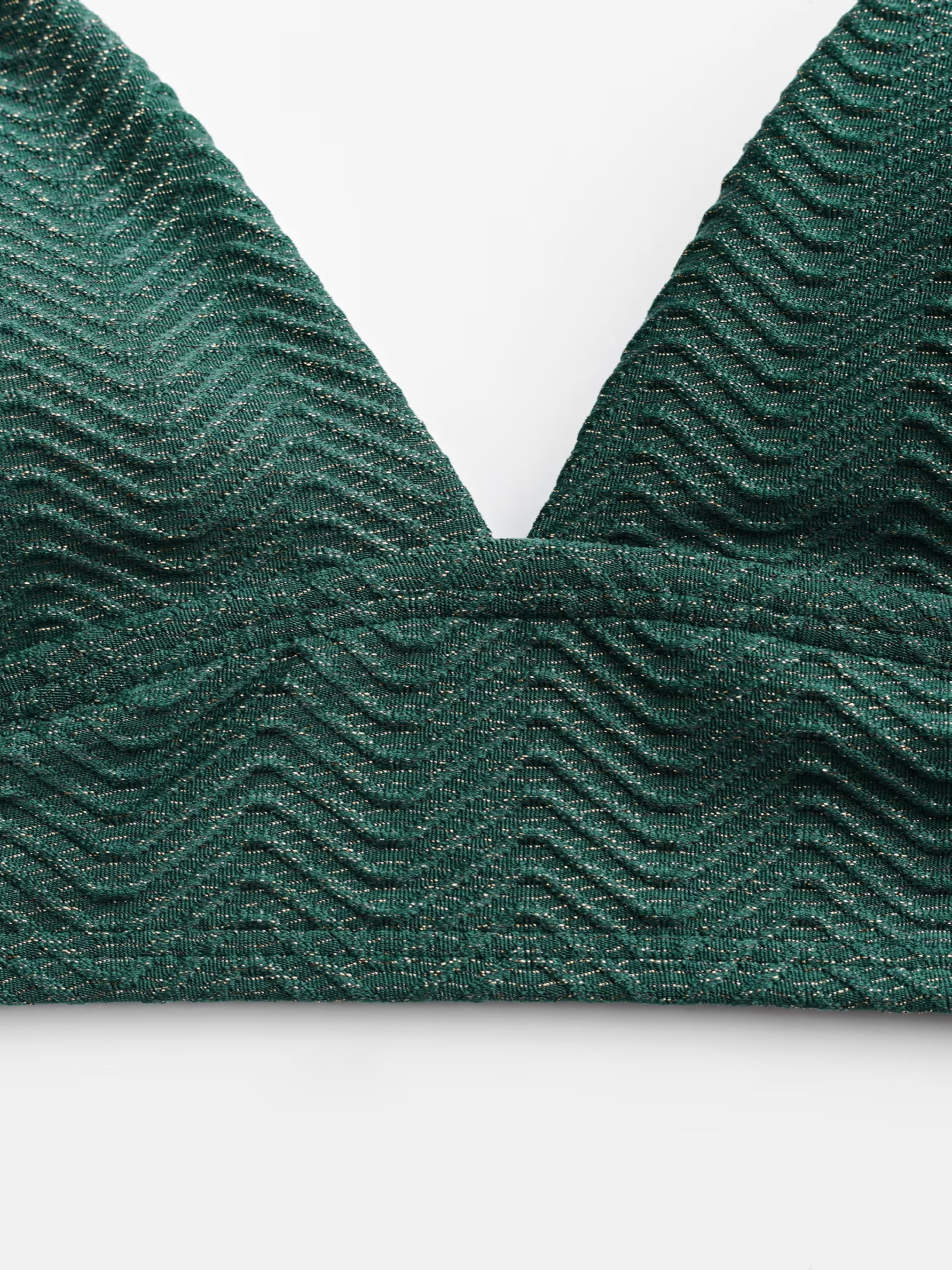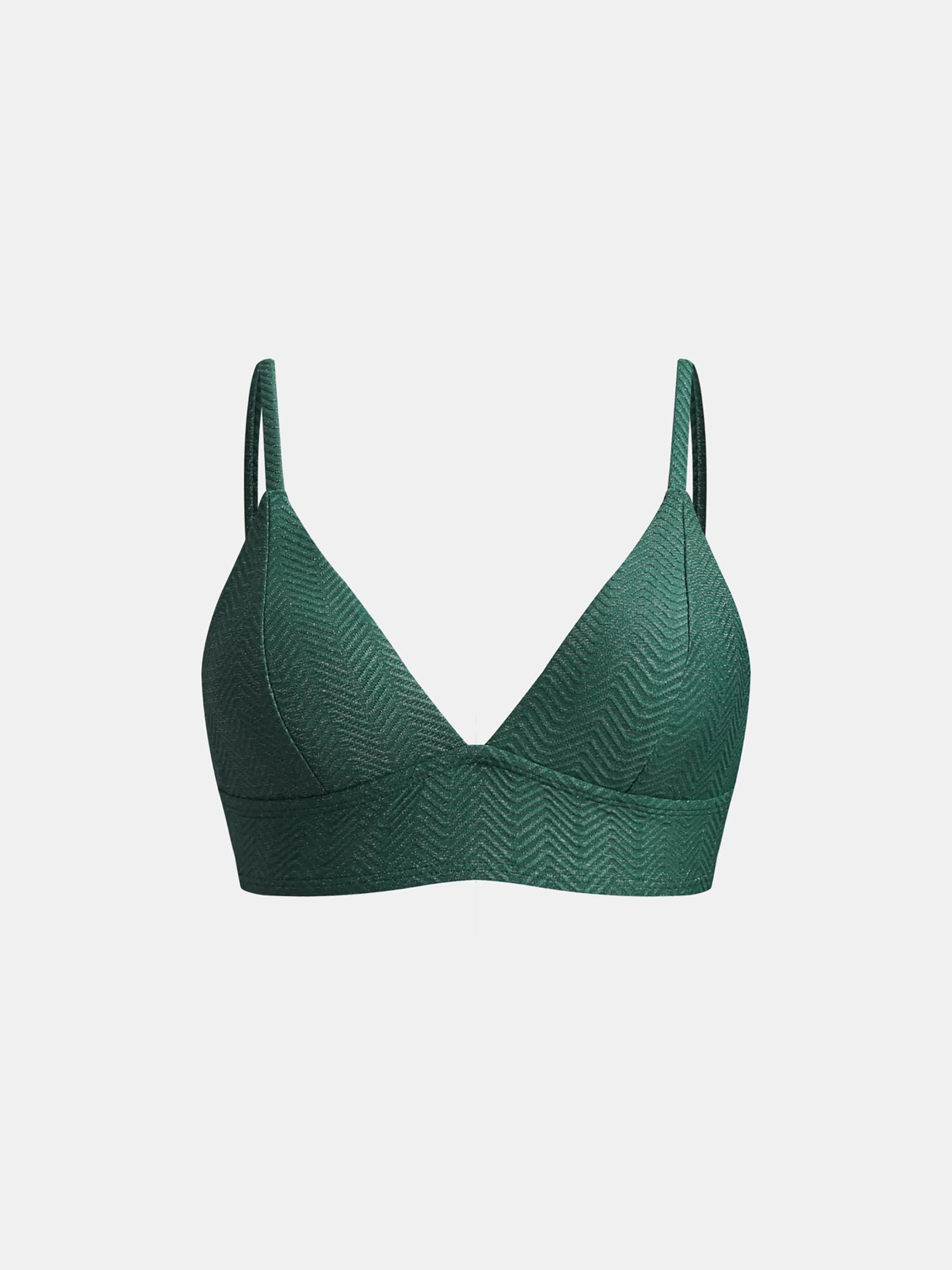 Бикини-бюстгальтер с V-образным вырезом отражает суть пляжного шика благодаря своим ярким зеленым тонам и привлекательному дизайну. V-образный вырез Съемные чашки Средняя поддержка груди Регулируемые бретели Изготовлено из металлизированной волнистой ткани, что придает ему блестящий, роскошный вид. Уникальное плетение может вызвать легкое раздражение у некоторых людей. Состав: верх: 78% полиамид, 17% эластан, 5% металлизированное волокно/подкладка: 92% полиэстер, 8% эластан