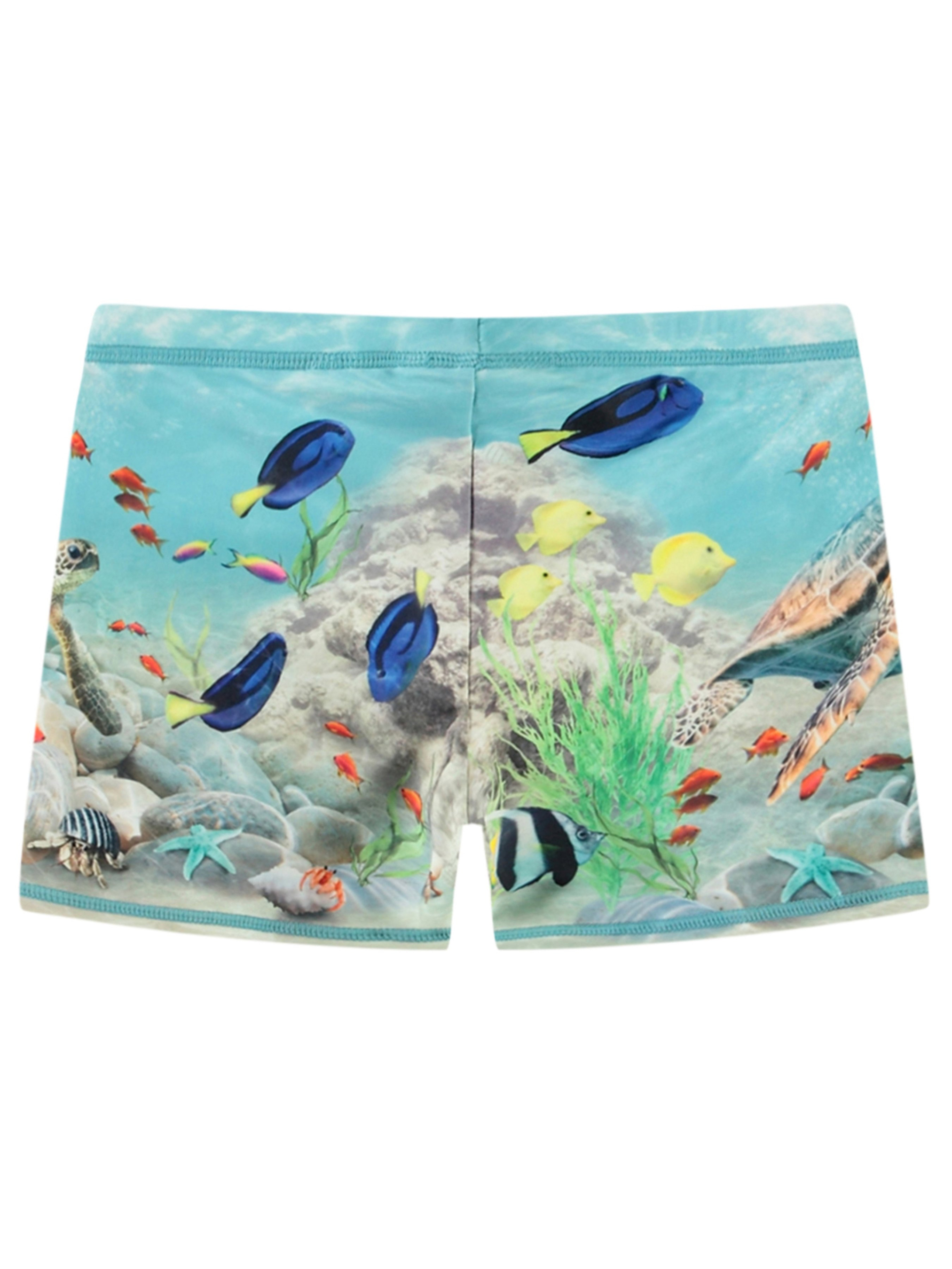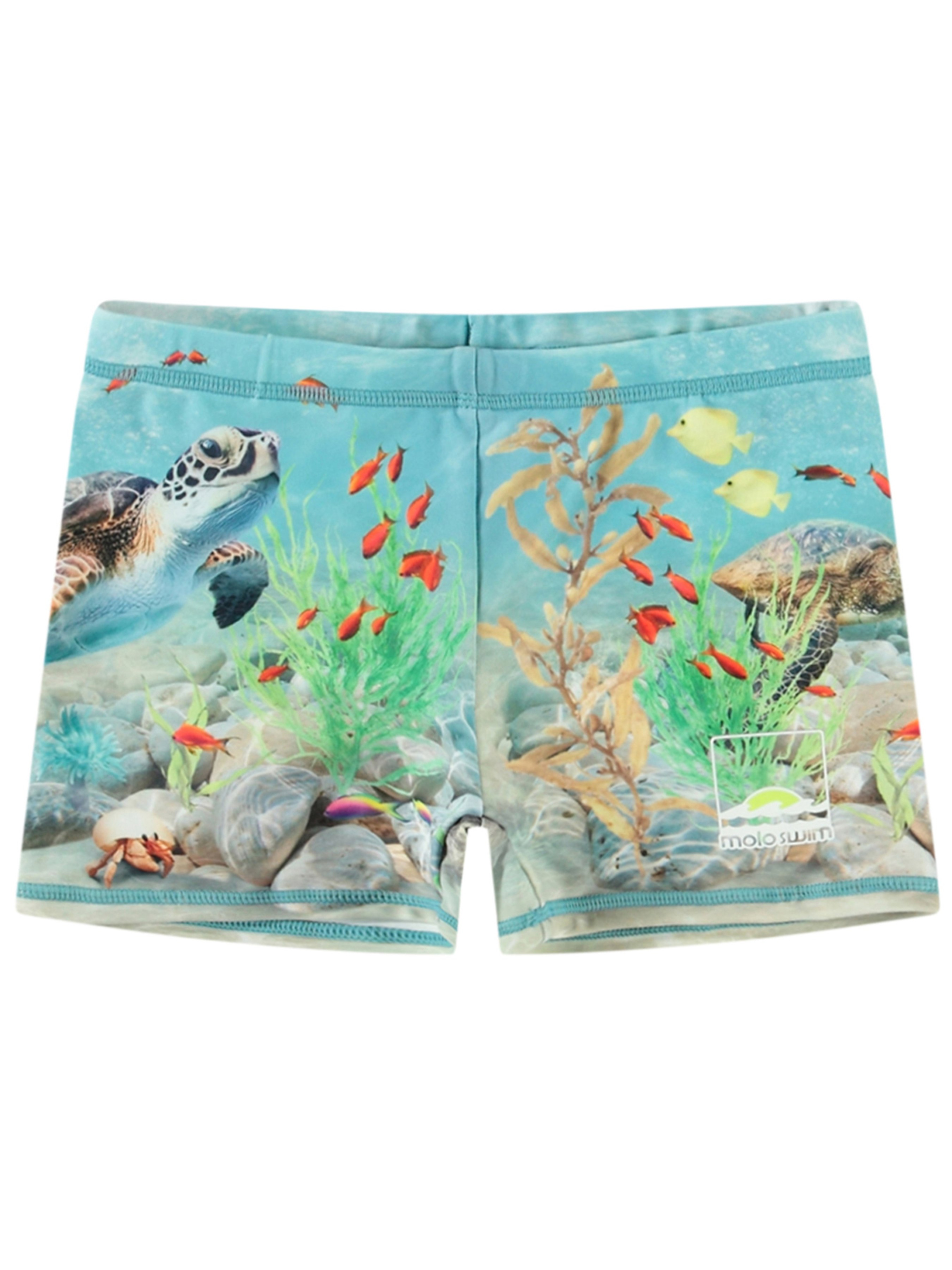 Плавки для купания Molo "Norton Happy Ocean" с защитой от ультрафиолета. Особенности: защита от солнца – UPF 50+; содержат как минимум 50% переработанного полиэстера, сертифицированного GRS (Global Recycled Standard)*; имеют внутренние завязки и эластичную талию; украшены принтом с изображением обитателей морского дна; белый логотип Molo Swim на одной штанине. Плавки Molo "Norton Happy Ocean" быстро сохнут, что делает их идеальными для отдыха на пляже и плавания. *GRS – это международный добровольный стандарт, который проверяет и отслеживает переработанные материалы от исходного сырья до готового продукта.